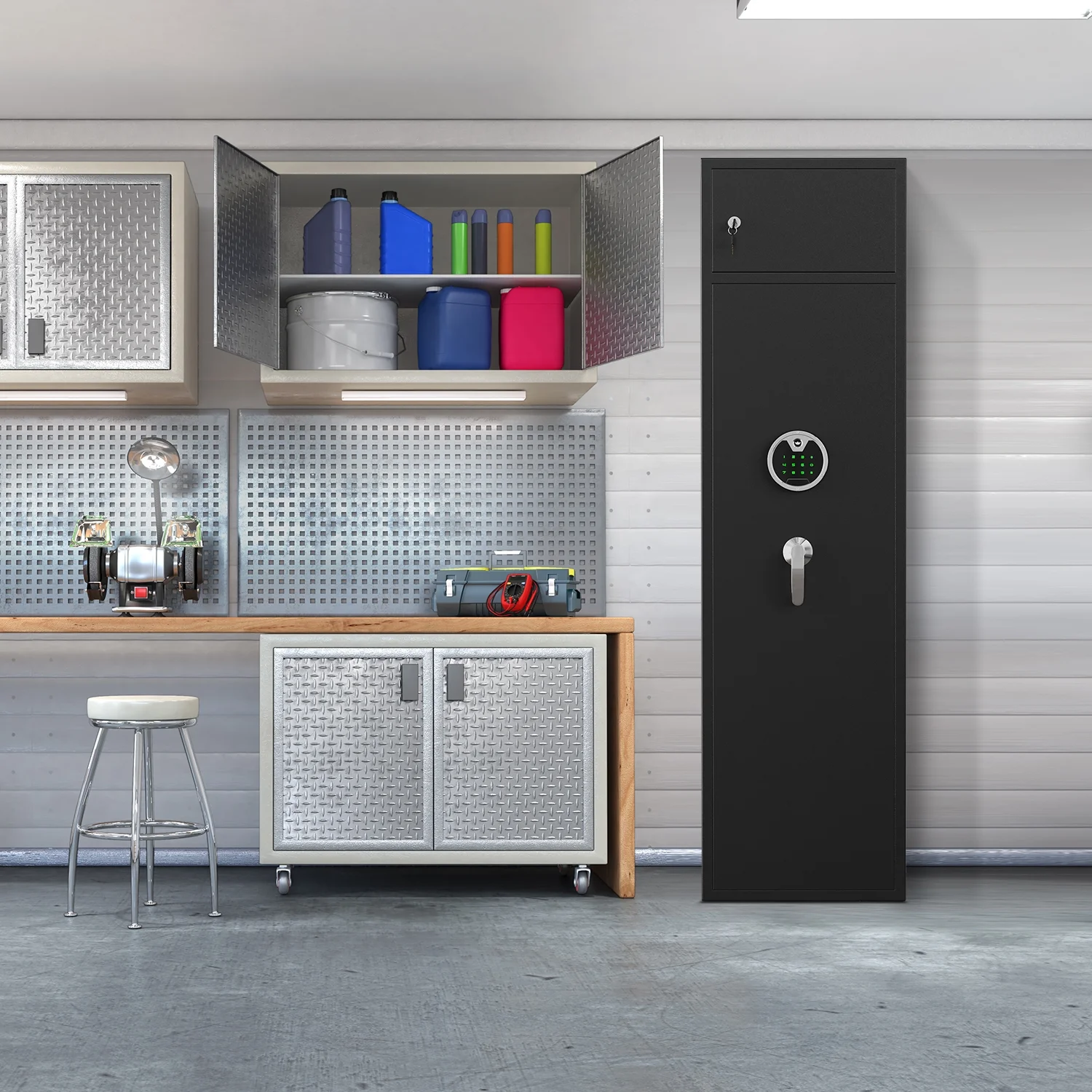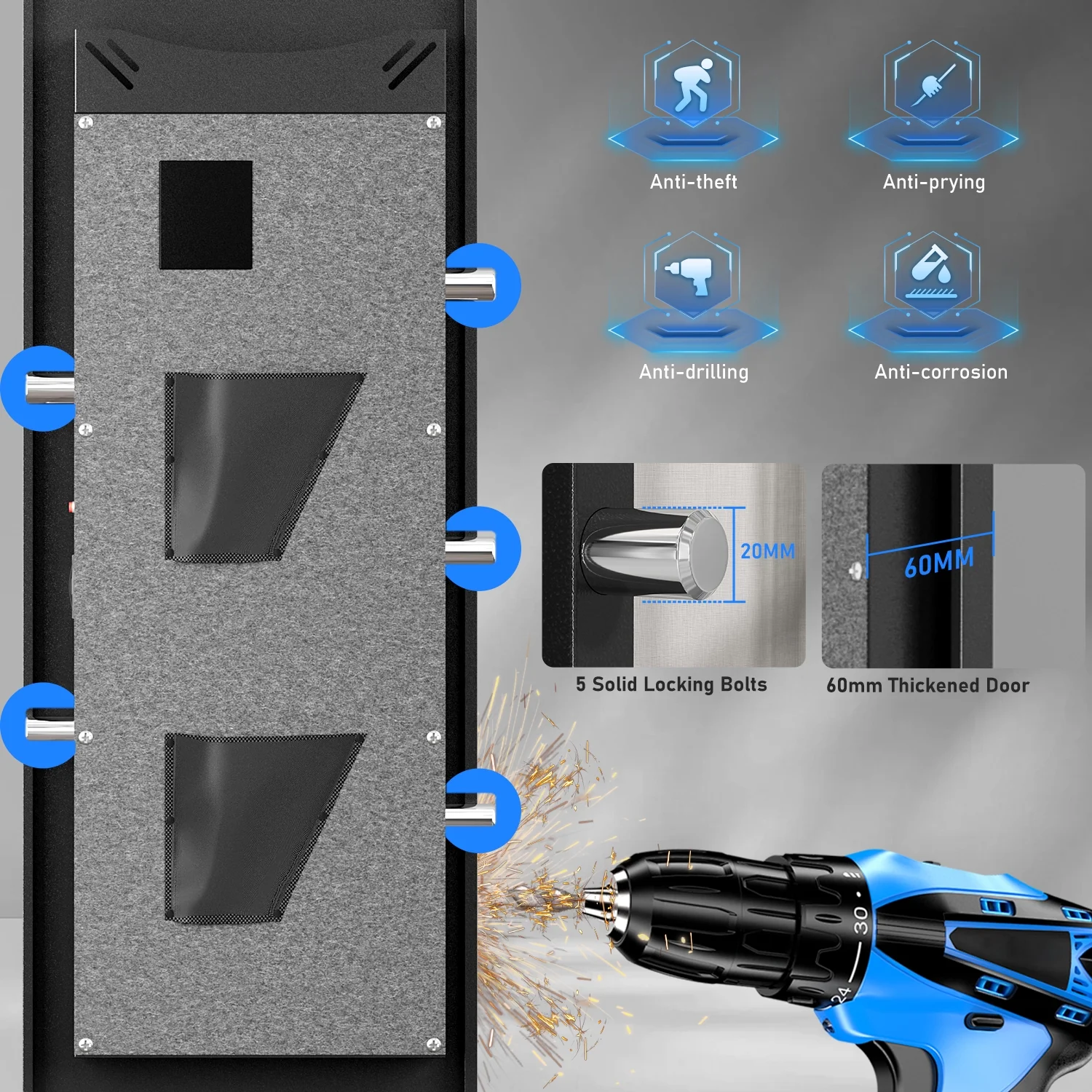 ��Adjustable Gun Rack & Ammo Storage Shelf��Gun safes for home gun and pistols with adjustable gun racks and pistol racks. You can adjust the gun rack according to the length of the gun. There are also 2 pistol bags and 3 ammo storage shelf on the door for storing pistols, ammunition, firearm accessories and more.