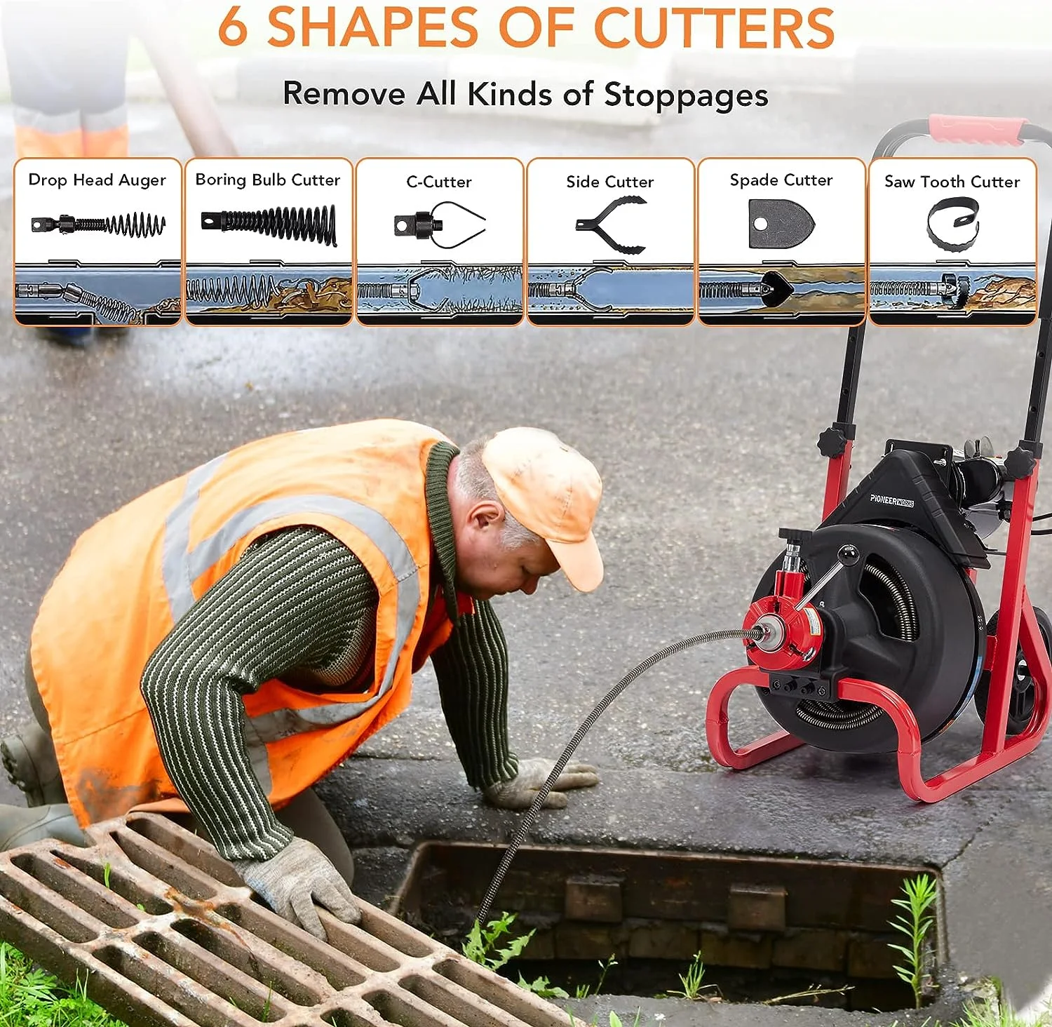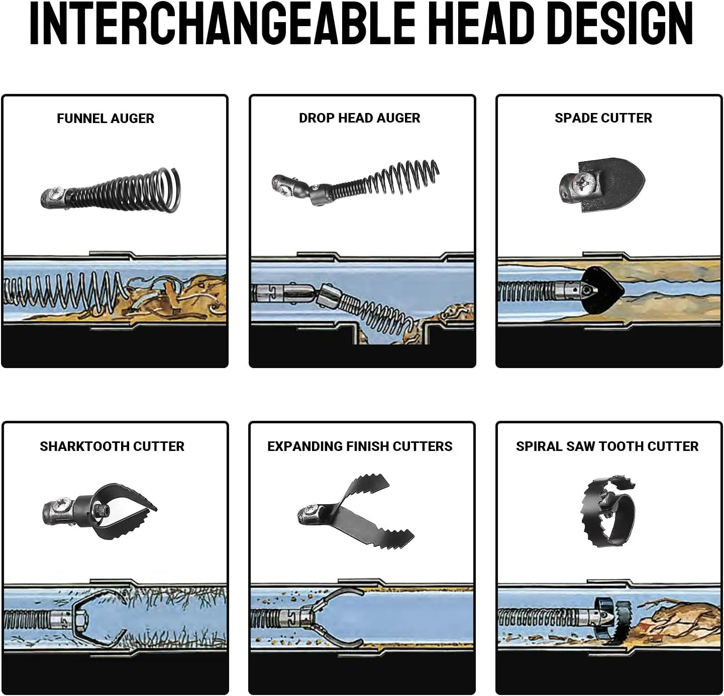 - ��6 Cutters & After-service��We have added a pair of gloves and 6 different alternative cutters for you : Drop Head Auger, Boring Bulb Cutter, C-Cutter, Side Cutter, Spade cutter, Saw Tooth Cutter, which makes the clog remover versatile. We offer you a 2-year warranty, please contact us in the first instance if you have any questions