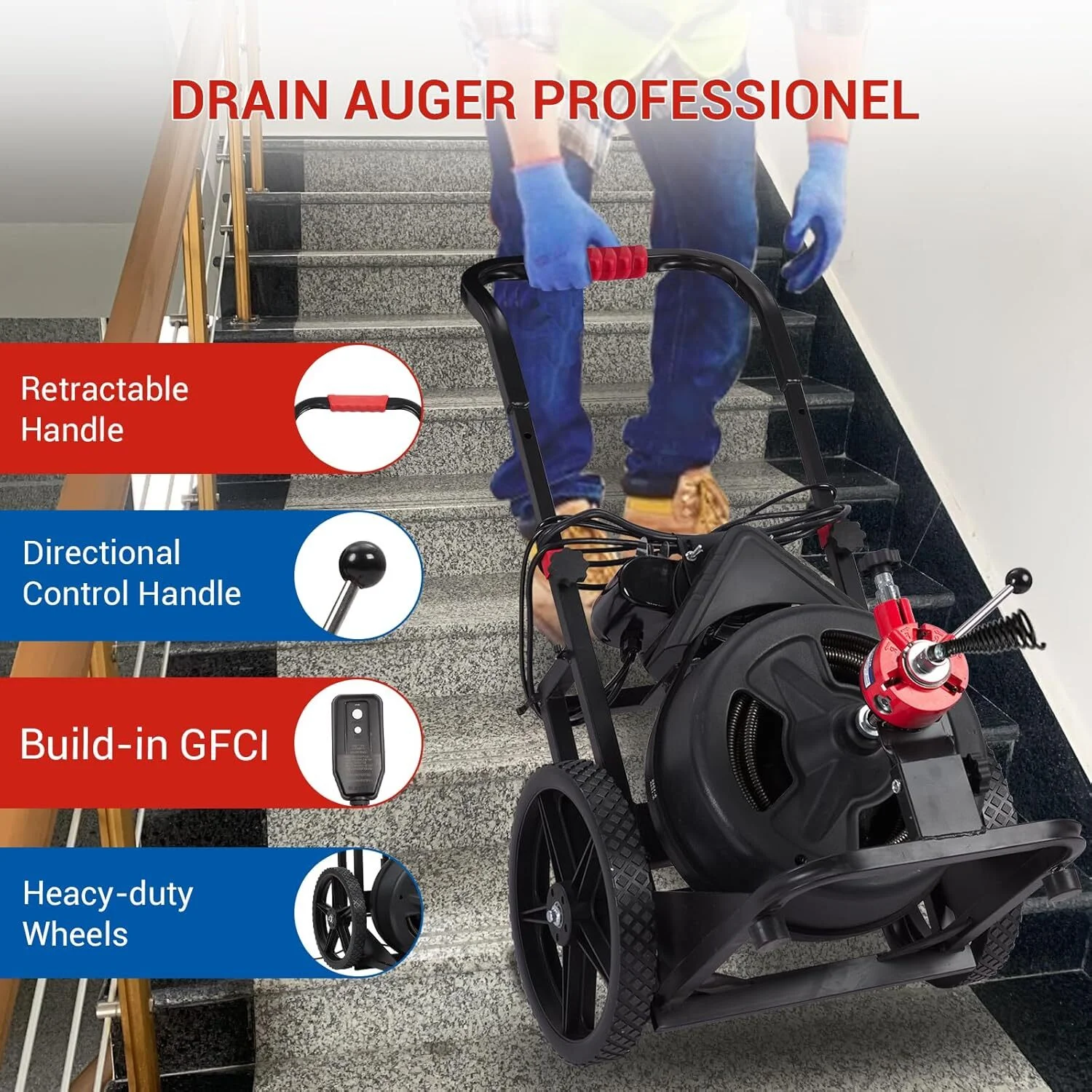 - Heavy-Duty 14" Wheels: Designed with durable 14" wheels, this electric drain snake easily navigates bumps and stairs, allowing for effortless movement around job sites or outdoor areas. The ergonomic adjustable handle ensures a comfortable grip while maneuvering the machine.