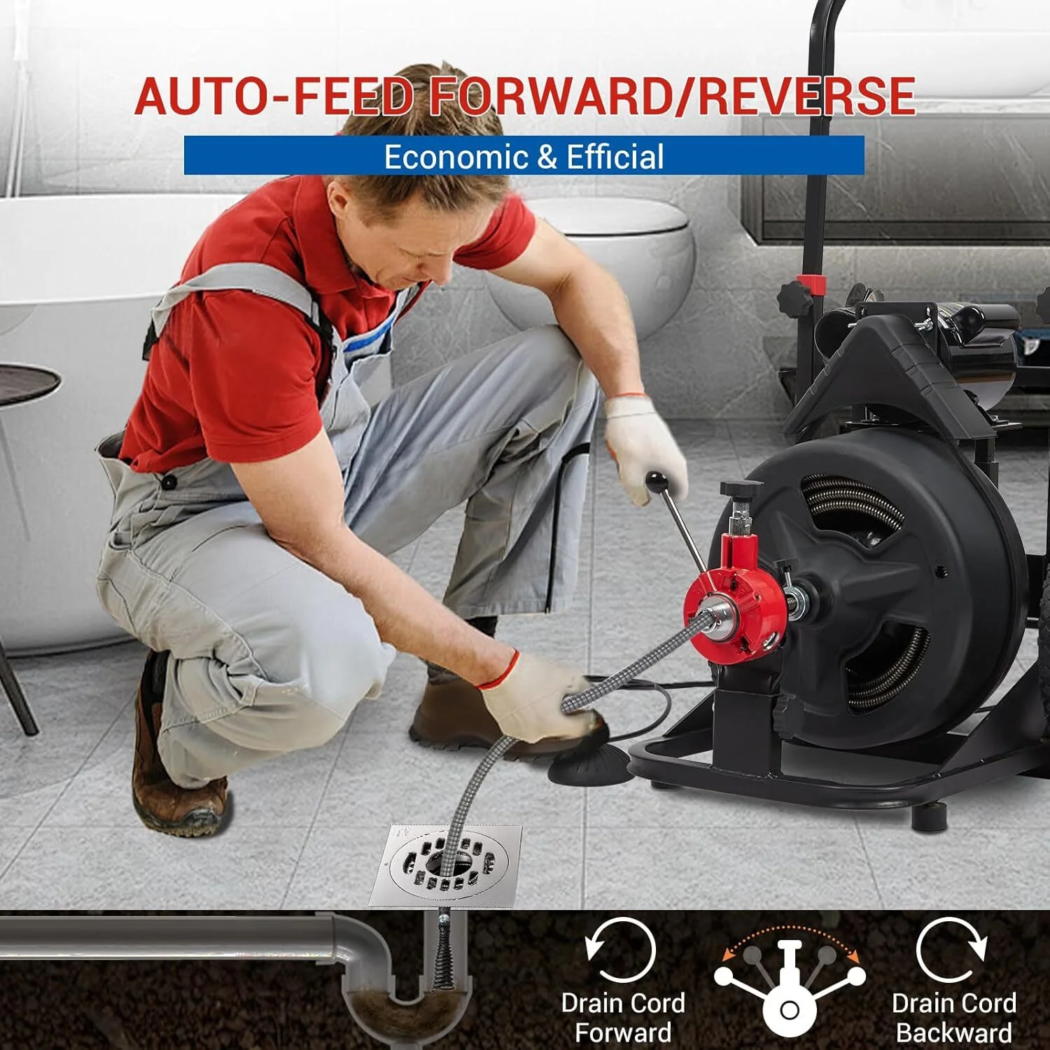 - Powerful Motor: This drain cleaner machine is designed to efficiently clear complex pipes and clean drains from 1 to 4 inches in diameter. Suitable for both commercial and residential applications, it works effectively on sinks, showers, and outdoor drains. For safety, it features a built-in GFCI to protect the operator from electric shock.