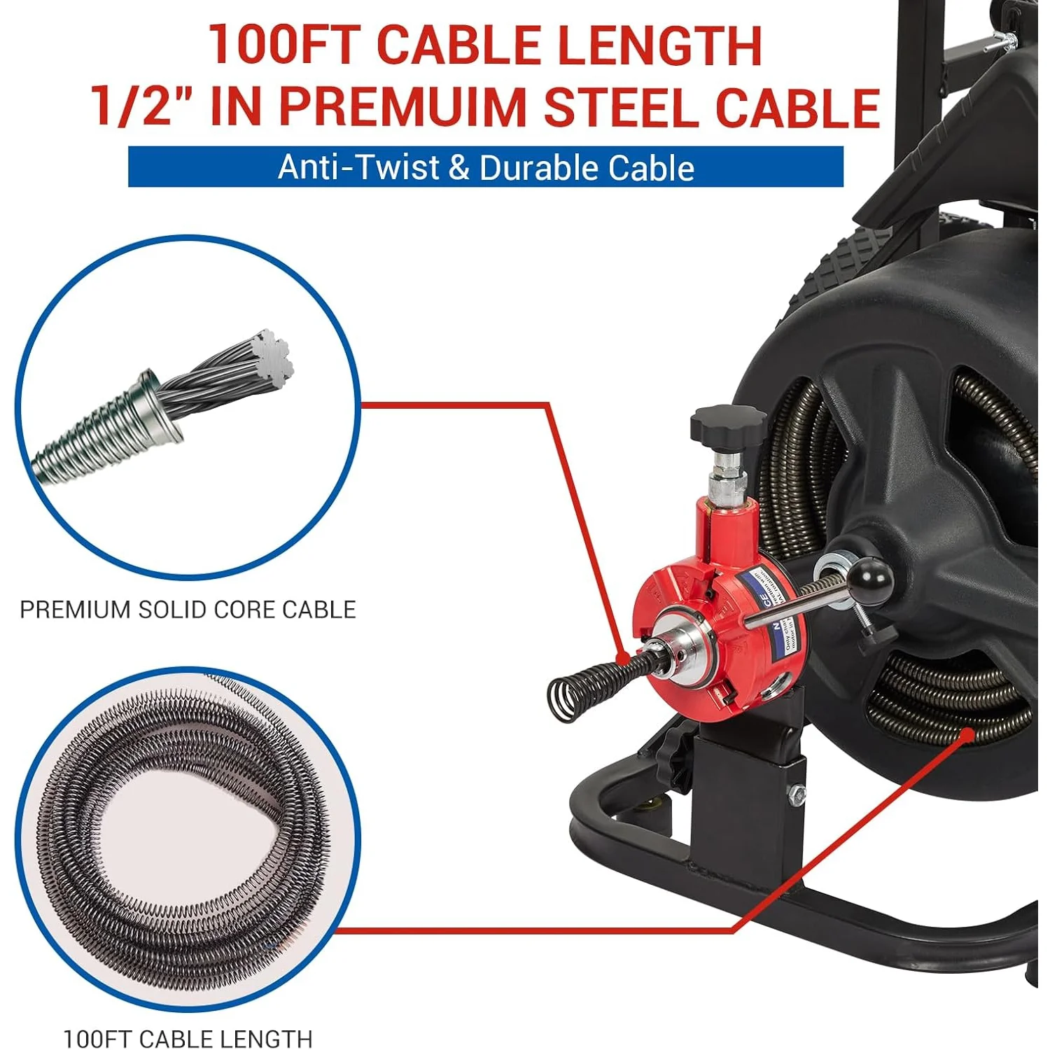 - 100ft x 1/2" Core Cable: The sewer snake with 100-foot cable is constructed from high-quality MN65 steel, heat-treated for enhanced hardness and resistance to breakage, tangling, kinking, and corrosion. It smoothly enters and exits downspouts, even navigating multiple 90-degree turns.