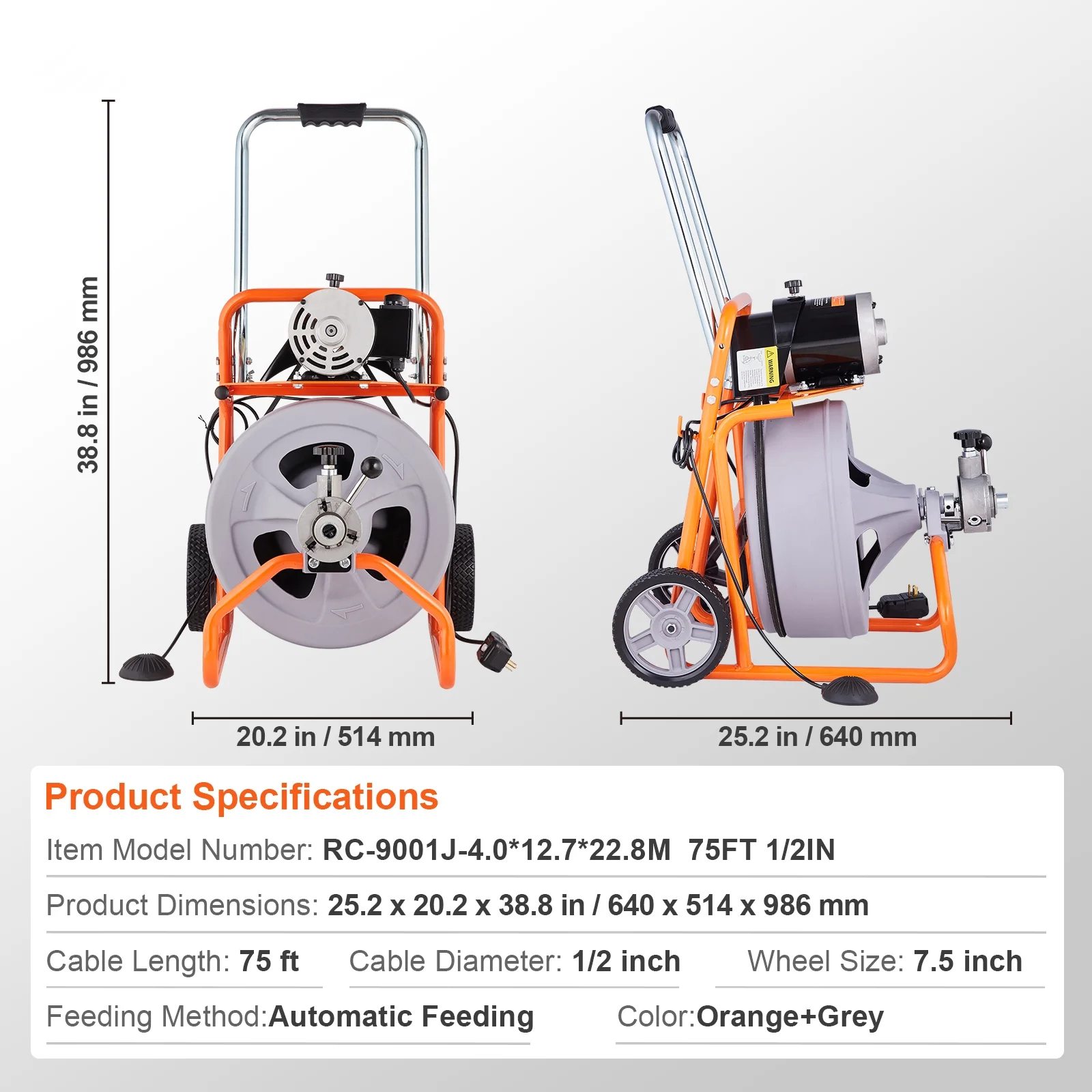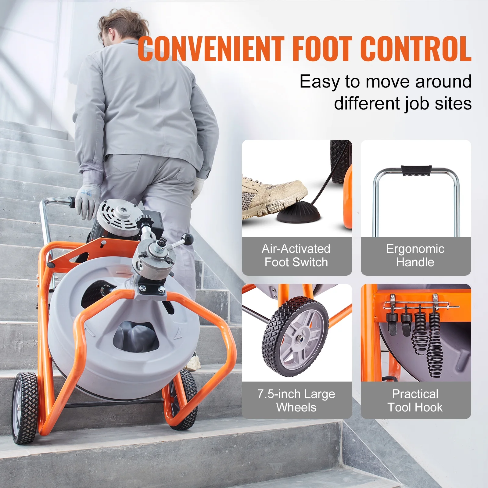 - Take the KFFKFF drain cleaning machine anywhere and store it with ease! Equipped with 7.5-inch wheels, it allows effortless movement. The foldable handle provides a comfortable grip and makes it convenient to store when not in use.