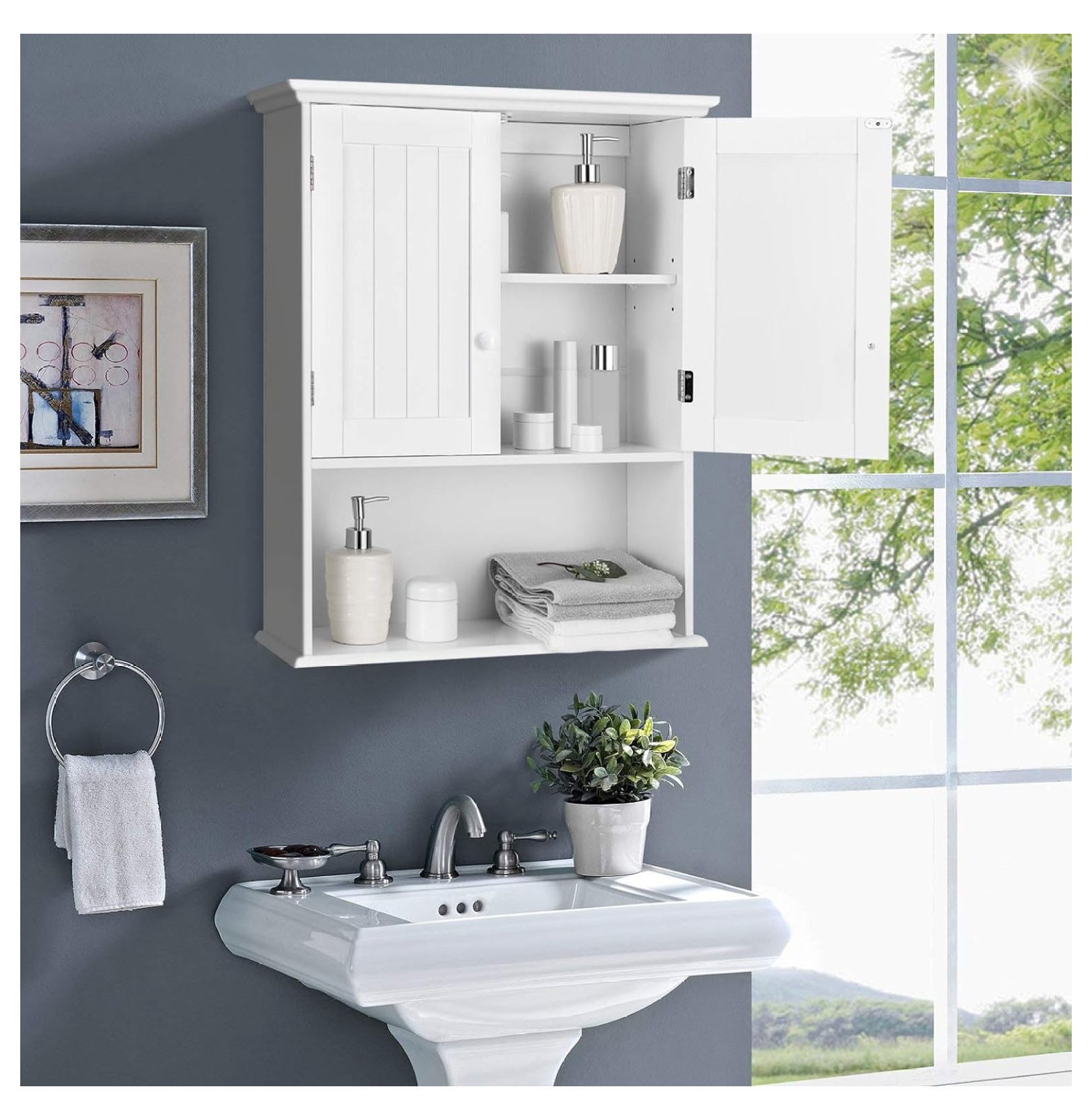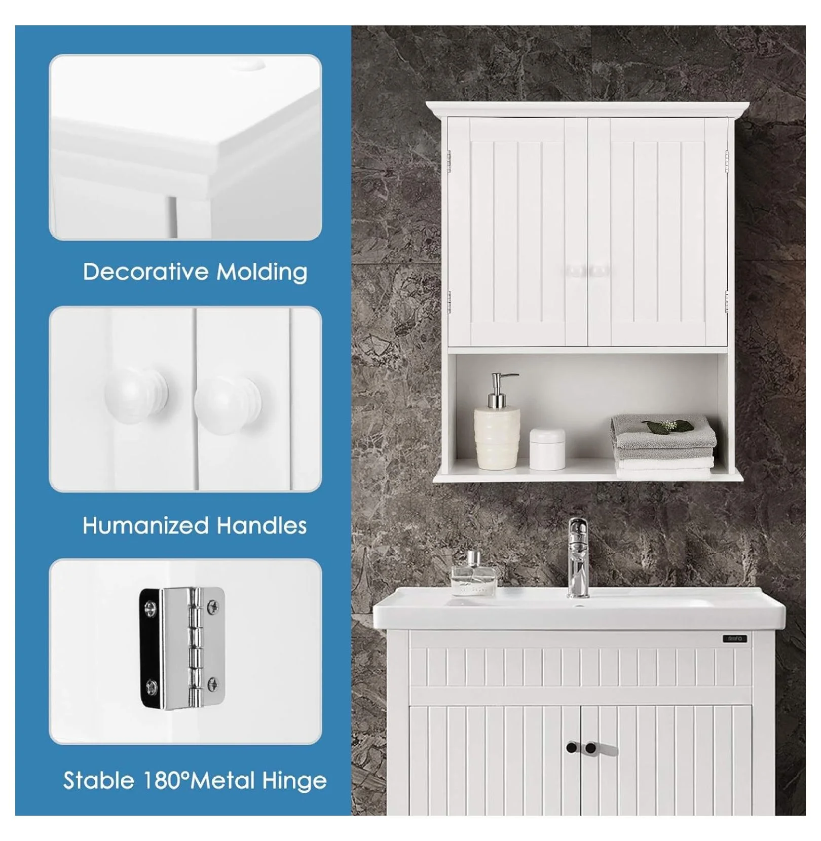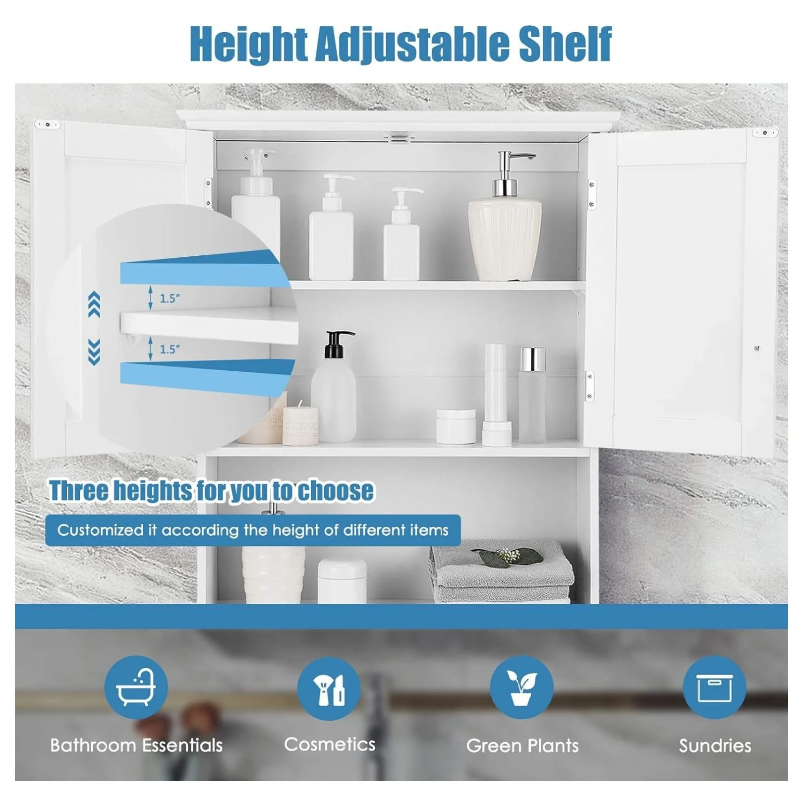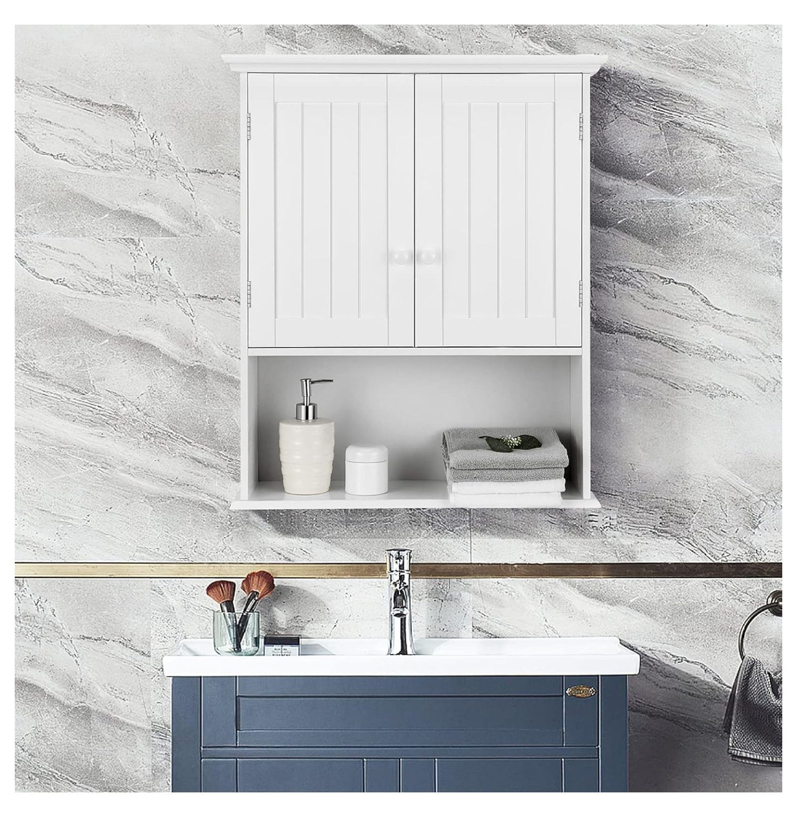 - 【Large Storage Keeps Room Tidy�?With a 2-door cabinet and 1 open shelf, the hanging storage cabinet allows you to store all your essential items such as toiletries, skin care products, towels, aromatherapy, etc. And the inner shelf can be adjusted to 3 positions easily to suit different sizes of items.