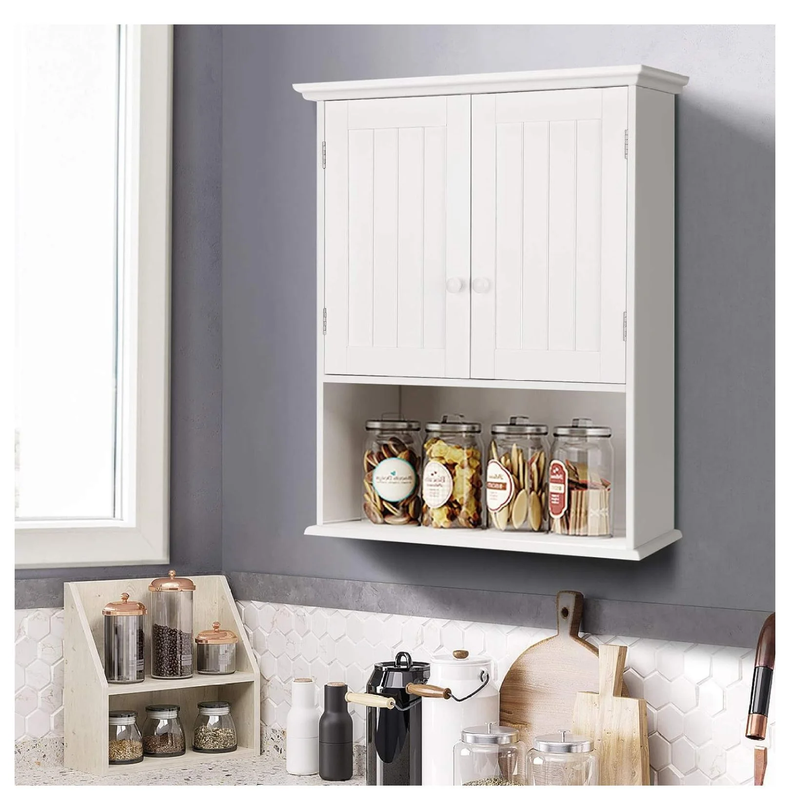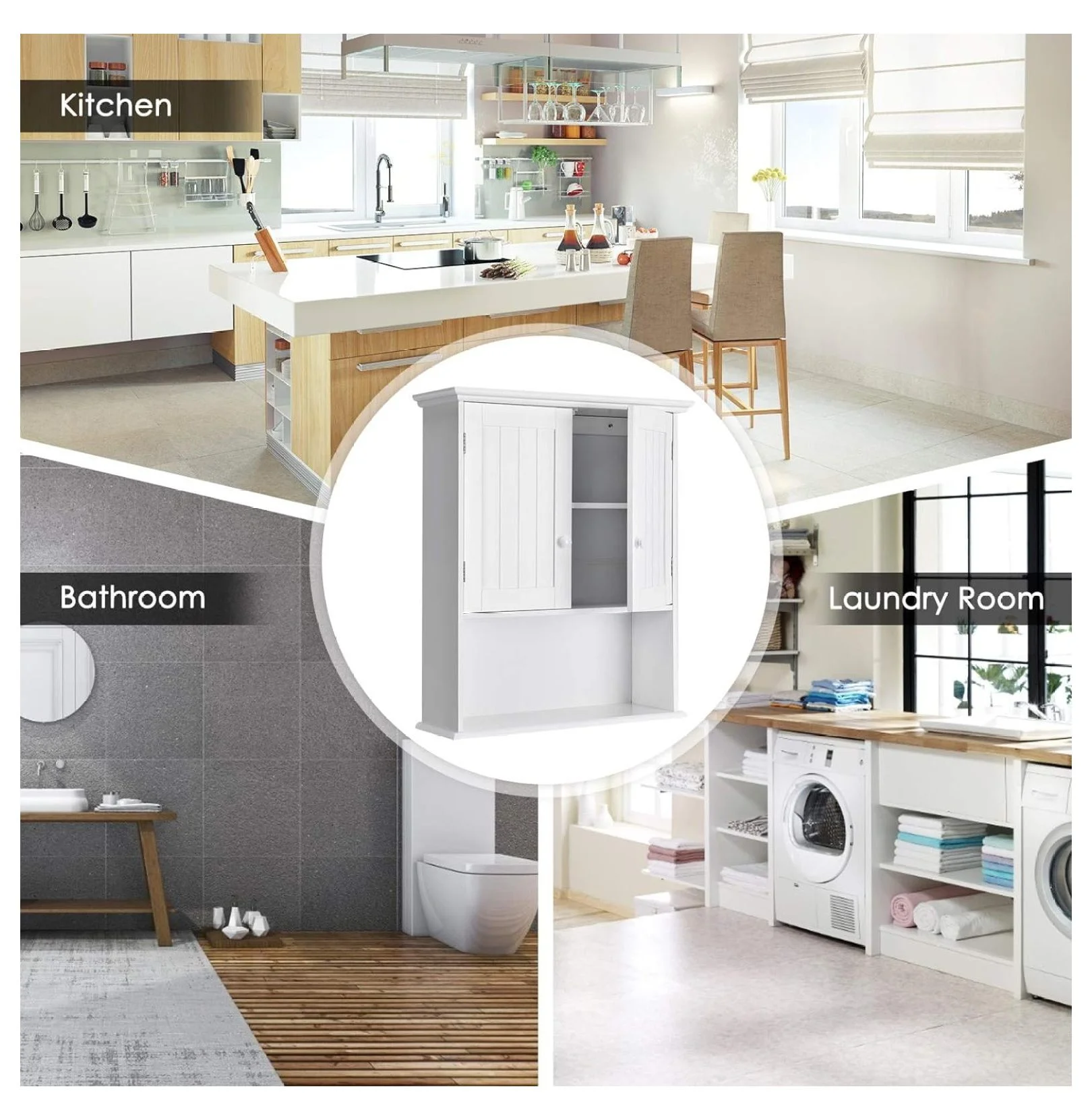 - 【Multifunctional Wall Cabinet�?This customizable storage organizer can work well as a kitchen cabinet to store dishes and spice jars, or a bathroom cabinet to keep toilet paper and others. Simple and stylish design makes the cabinet suitable for laundry room, living room, kitchen, entryway and so on.