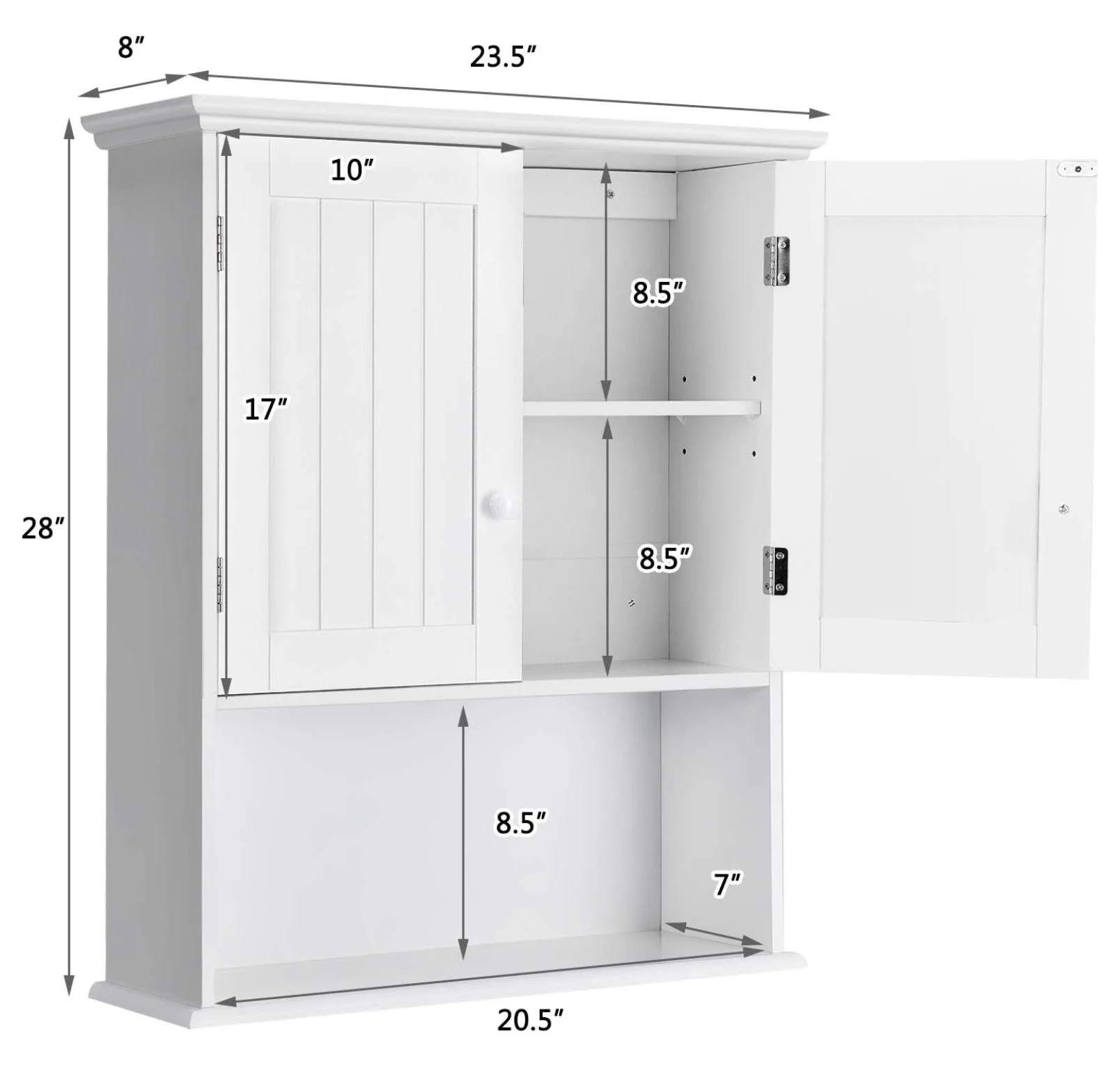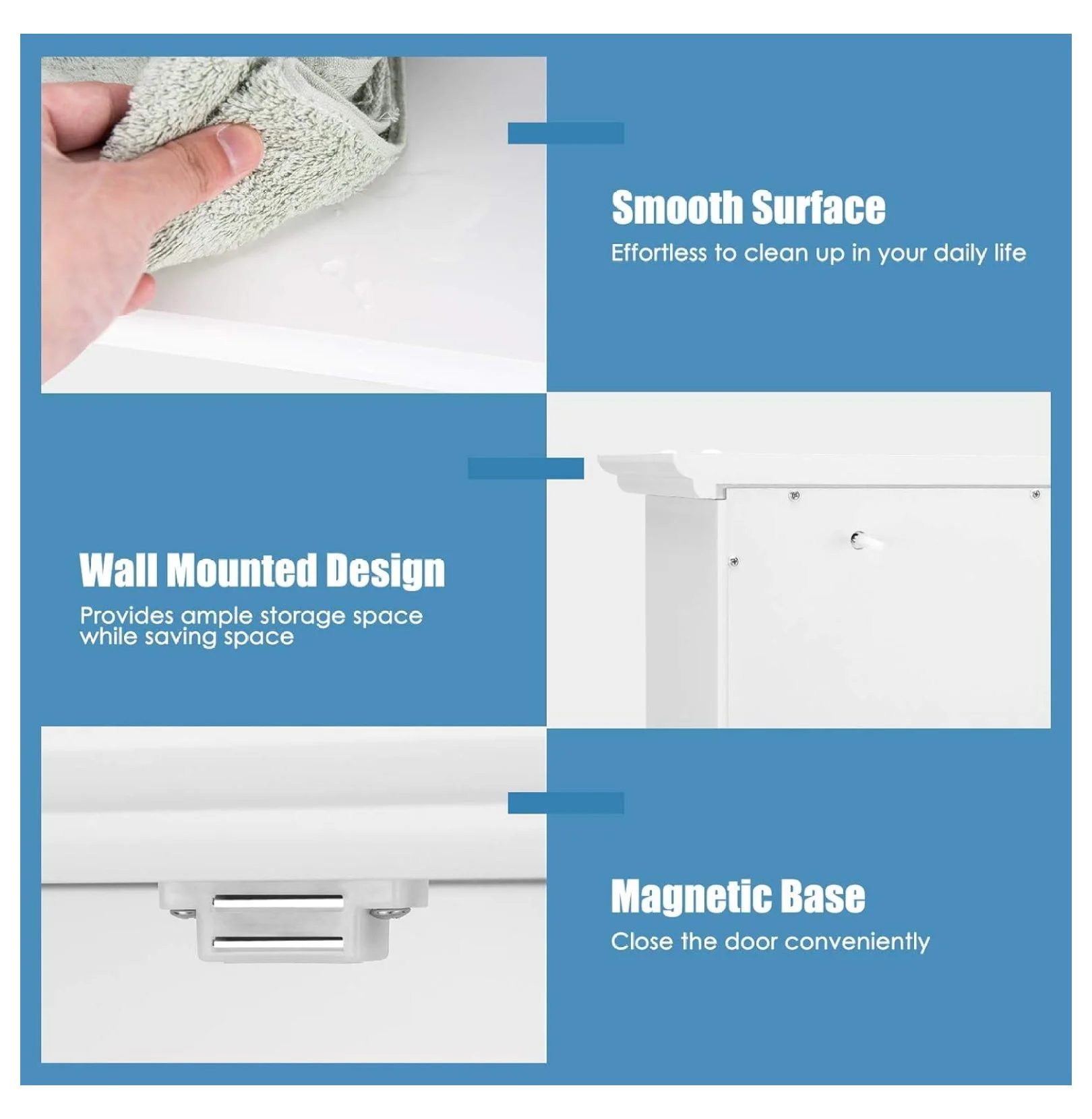 - 【Wall-mounted Design for Space-saving�?Coming with 2 holes at back, the medicine cabinet can be hung firmly on the wall or over the toilet to save floor space. Besides, the convenient round handles and the magnetic catch are designed to help you open and close the cabinet doors easily.
