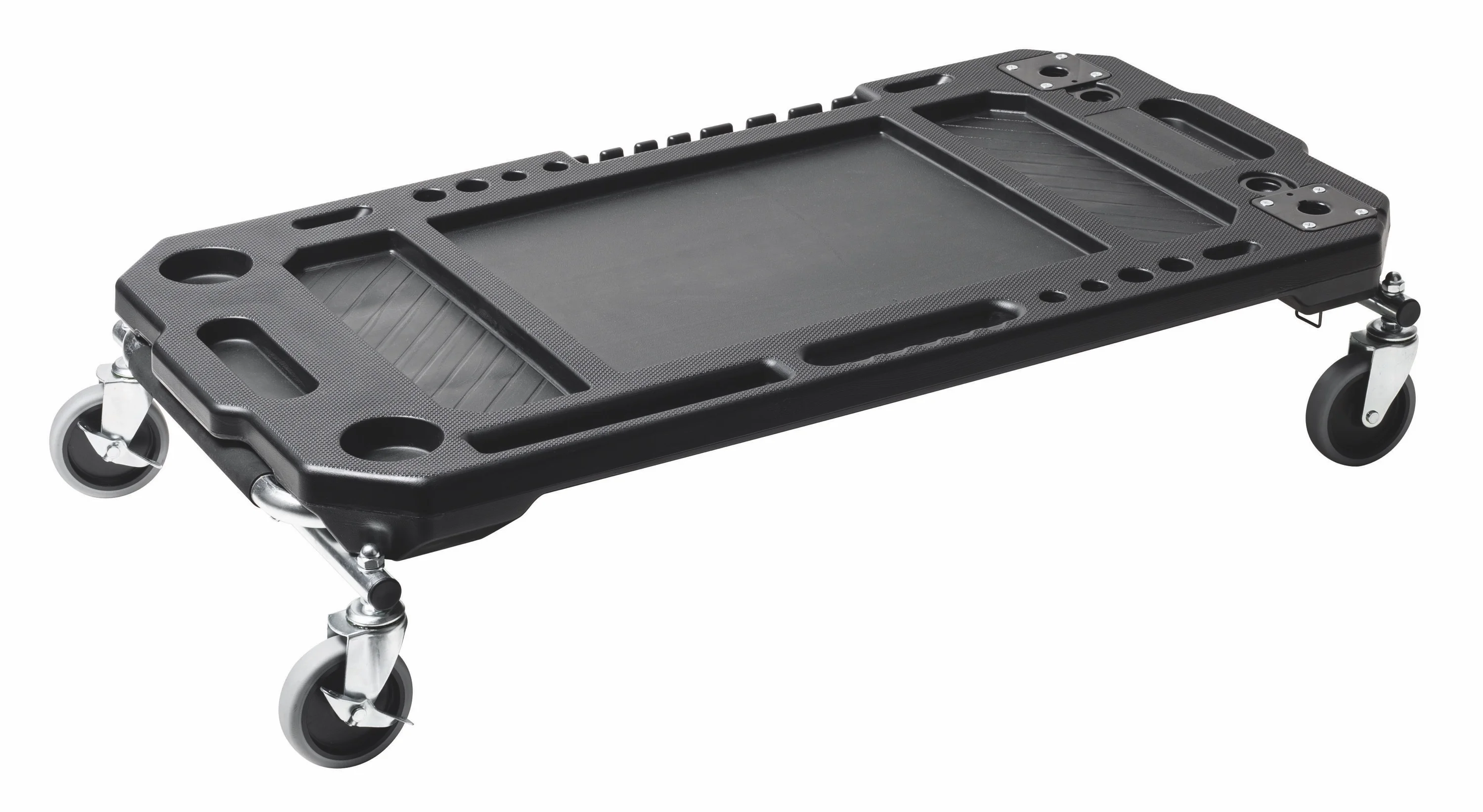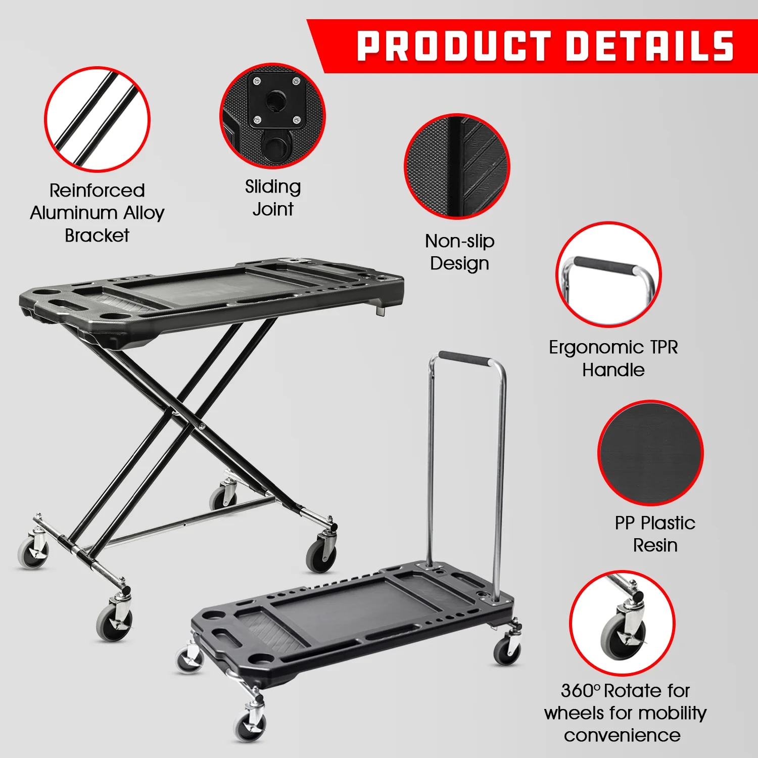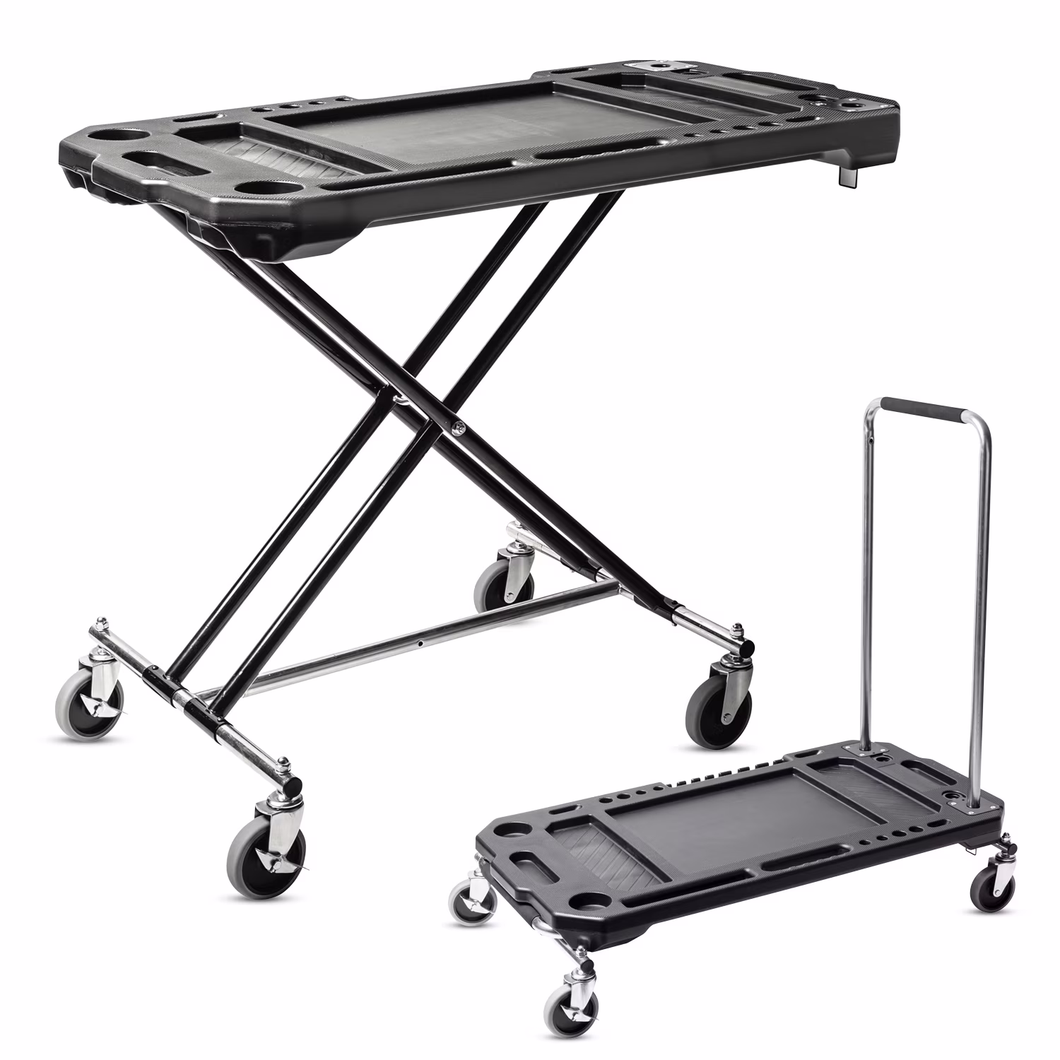 Powerbuilt versatile 3in1 table, dolly, cart, all-in-one multi-functional platform, use it as a mobile workspace to store your needed tools or lower the table to the dolly position for easy transportation of tools or heavy objects. When the table is extended, it provides a spacious work surface with slotted storage areas for your basic tools, cup holders, and other essentials. Lower the folding legs to the bottom dolly position to help move heavy objects on the rolling lockable casters. This multi-height position table extends up to 31 inches high and has a 40.5 inches x 20.5 inches platform. Constructed of heavy-duty blow mold plastic materials and metal legs and handle, the max load weight in the high table position is 180 pounds. In the lowest dolly or cart position, the max load weight is 330 pounds. With its practical design and versatile features, this table/cart is a reliable companion for various tasks, offering both convenience and functionality.TABLE FUNCTION: Multi height position table extends up to 31" high and is 40.5" x 20.5" with assorted tool and drink holders. In table position max load 180 lbs. Constructed of heavy-duty blow mold plastic materials.