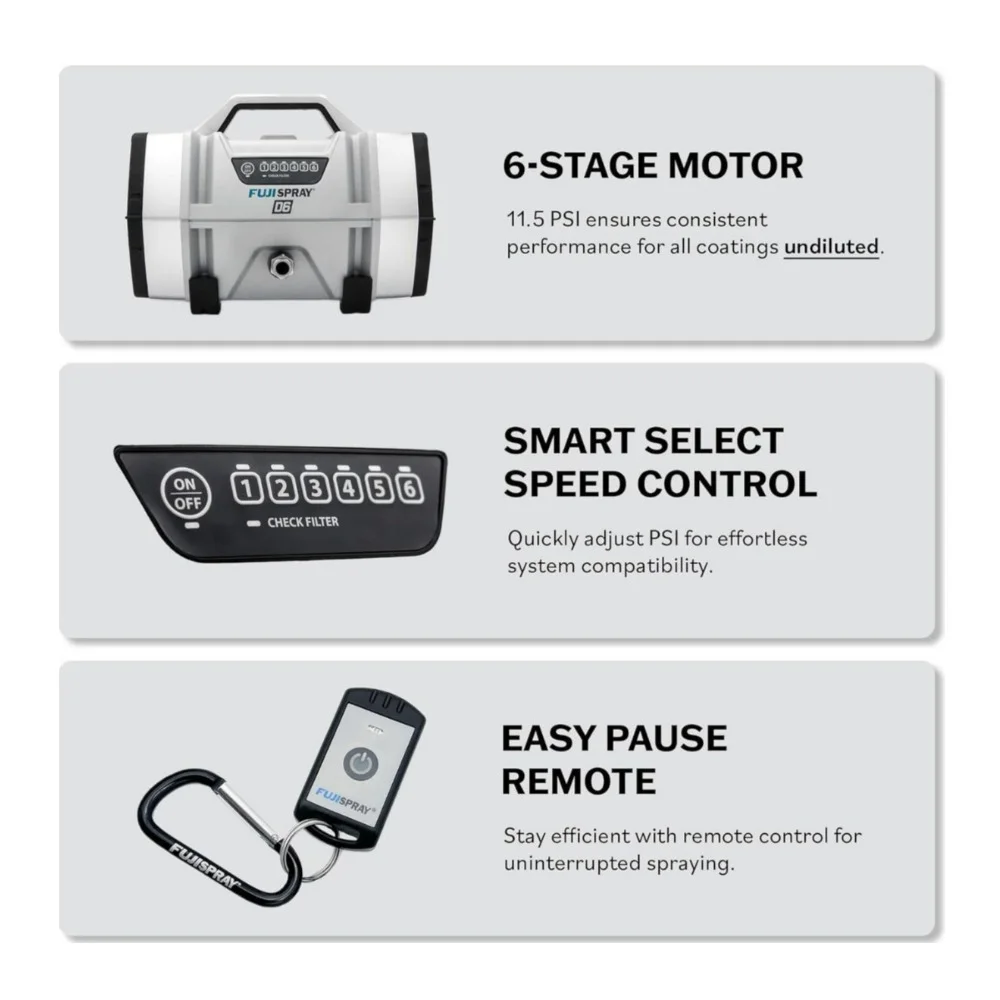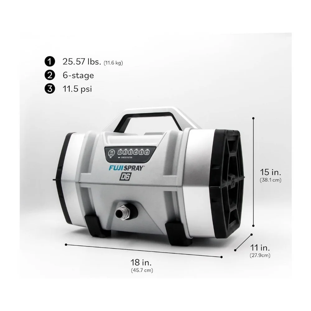 - 6 Stage Motor: The Fuji Spray D6’s 6-stage motor delivers exceptional power with a maximum PSI of 11.5, allowing you to atomize virtually all coatings undiluted, ensuring even coverage and a stunning finish