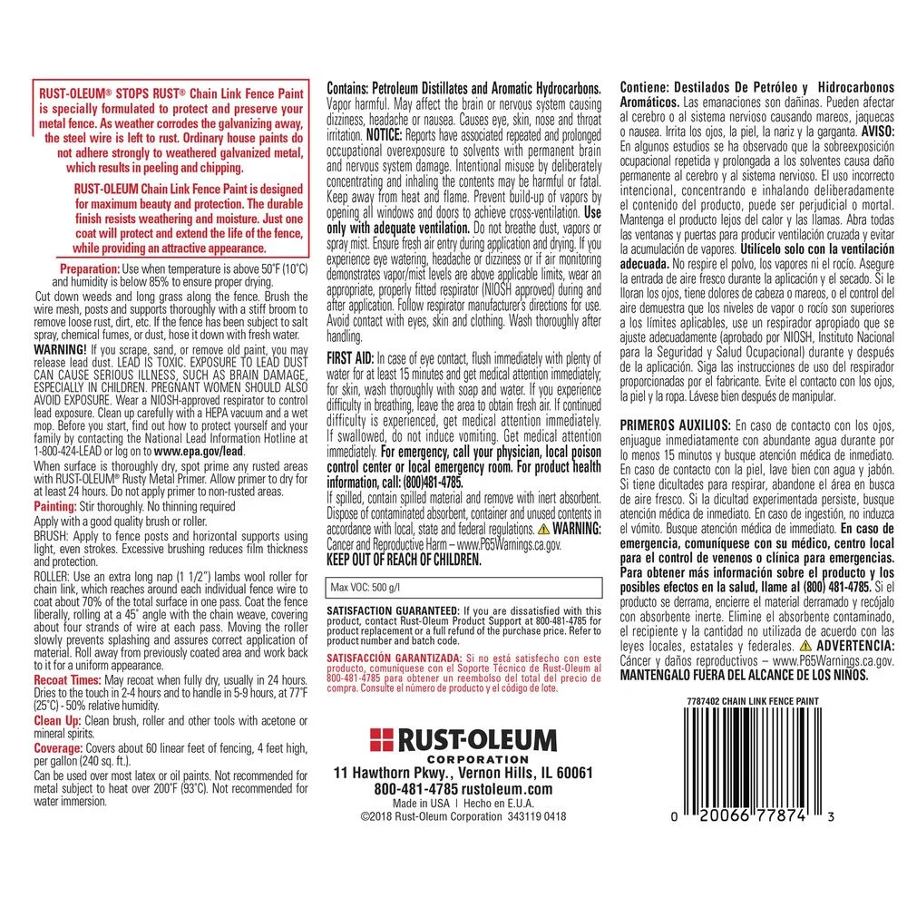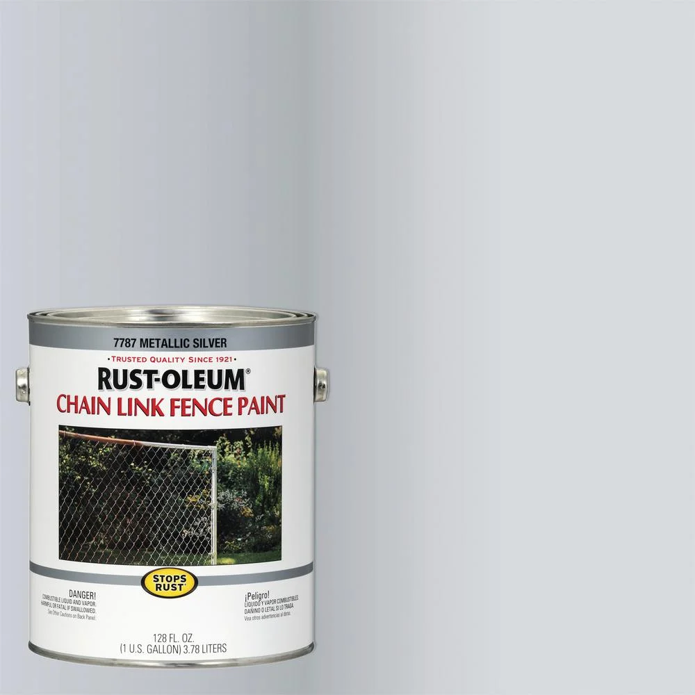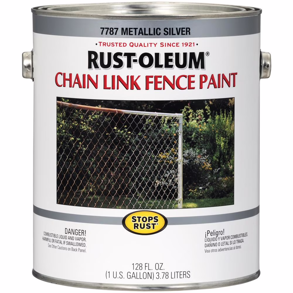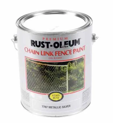 Size: 1 Gallon.; Chain Link Fence.; Oil based.; Resists moisture, weathering cracking, peeling & chipping.; Rust preventative.; Can be used without a primer on new or lightly rusted surfaces.; Covers about 60 linear feet of fencing, 4 feet high per gallon (240 sq ft.).; Finish: Metallic silver.; Can.;Chain Link Fence Oil based Resists moisture, weathering cracking, peeling & chipping Rust preventative Can be used without a primer on new or lightly rusted surfaces.