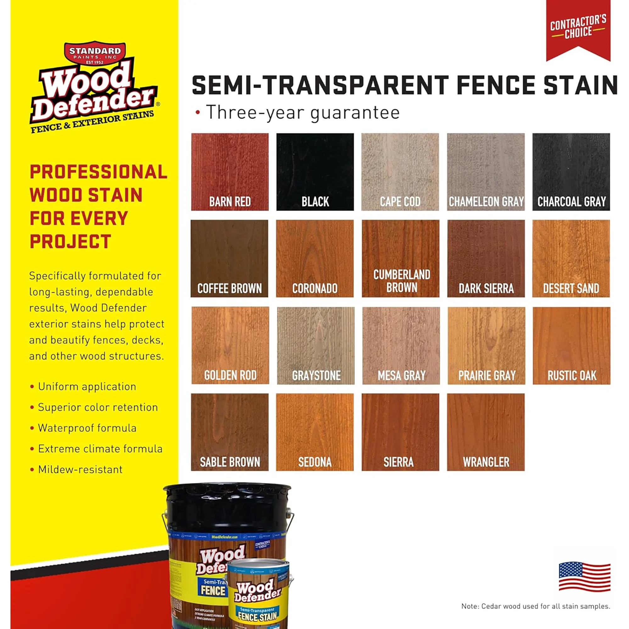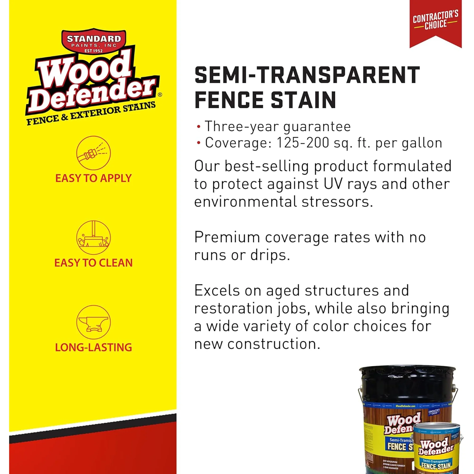 Uses a lower concentration of opaque pigments to create a stained look. The distinct pigment blend has undergone testing to demonstrate its exceptional UV resistance. This combination of pigments also provides increased coverage per gallon. Over the years, Wood Defender Semi-Transparent Fence Stain has become a preferred choice for contractors nationwide due to its reliable performance. It is recommended for use on exterior wood fences, but not advised for staining decks.