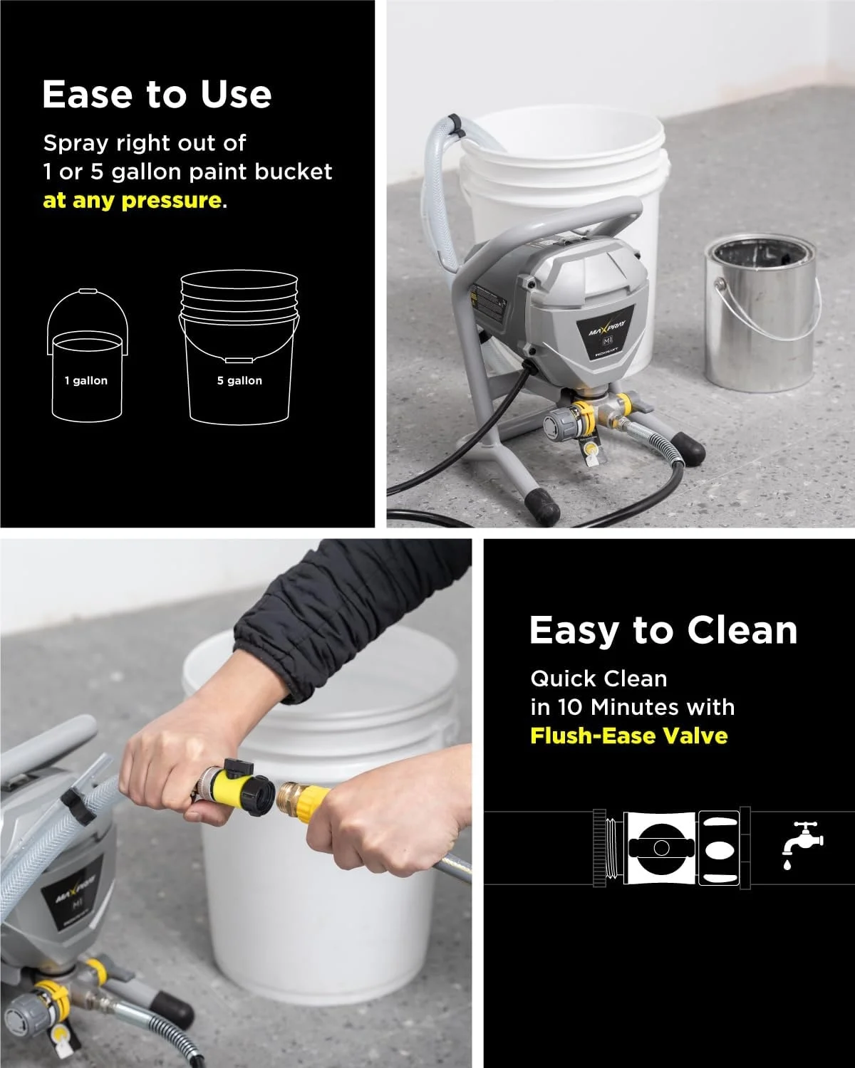 - Enjoy enhanced agility and precision thanks to the 360° swivel joint, and easily clean the sprayer in just 10 minutes with the quick-clean Flush-Ease Valve.