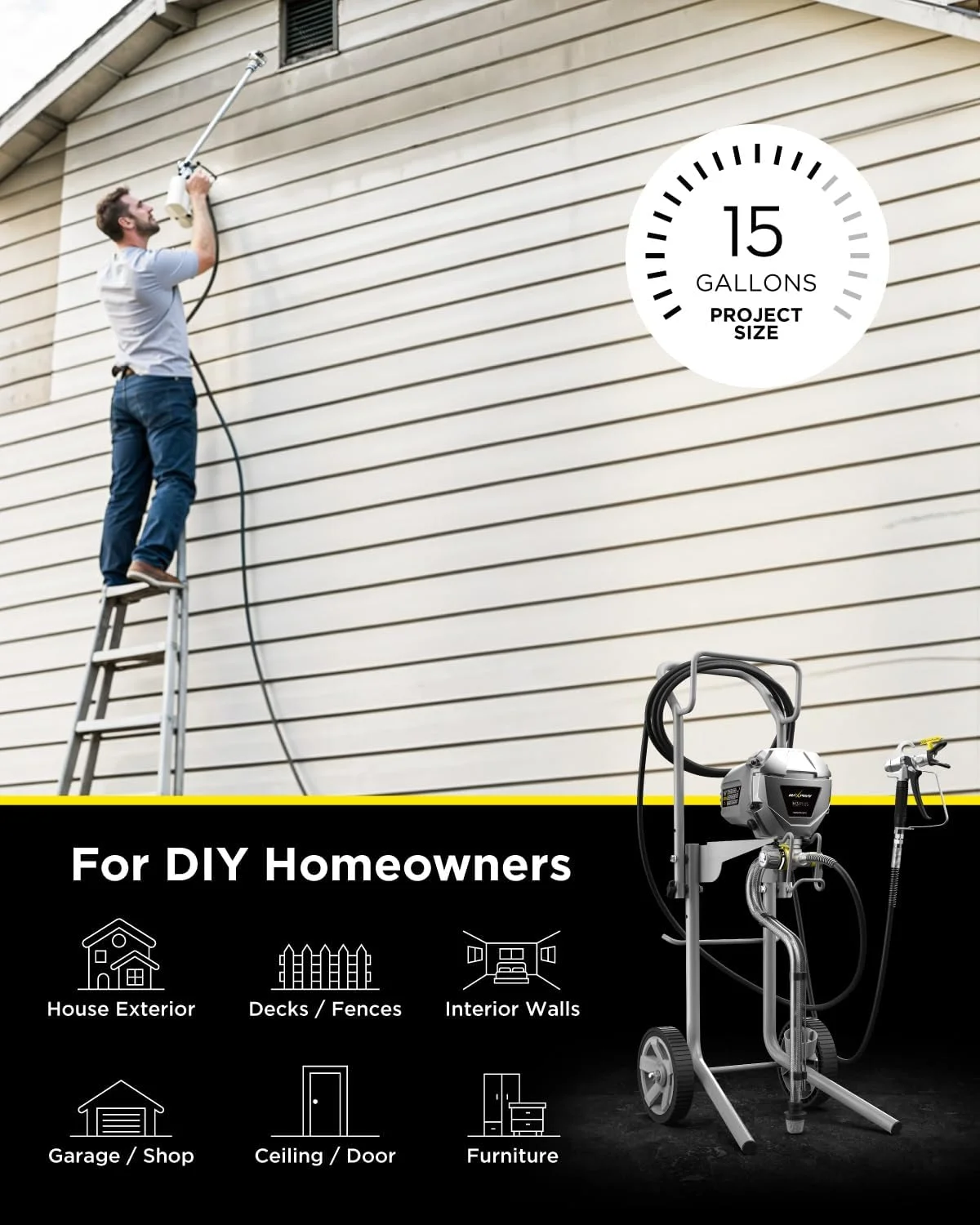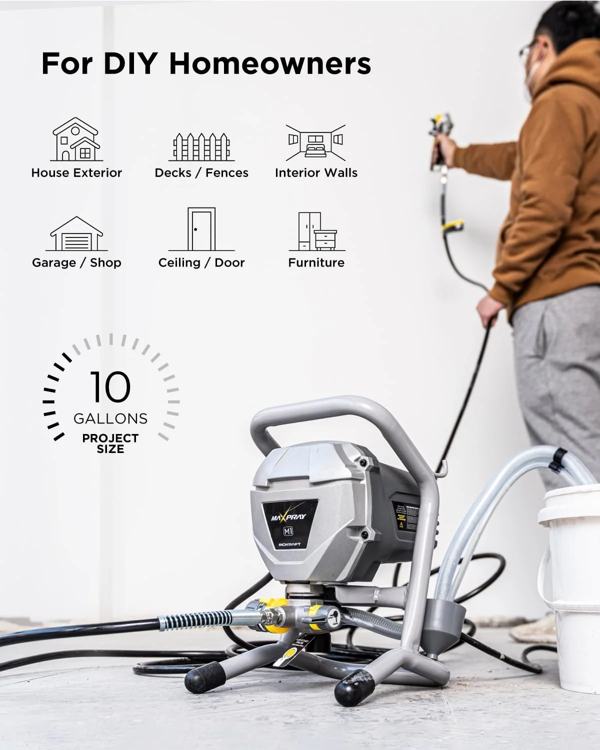 - Recommended for up to 200 gallons of annual use, the MaXpray M1 is ideal for projects ranging from 1 to 15 gallons, and can be used on a variety of interior and exterior surfaces.