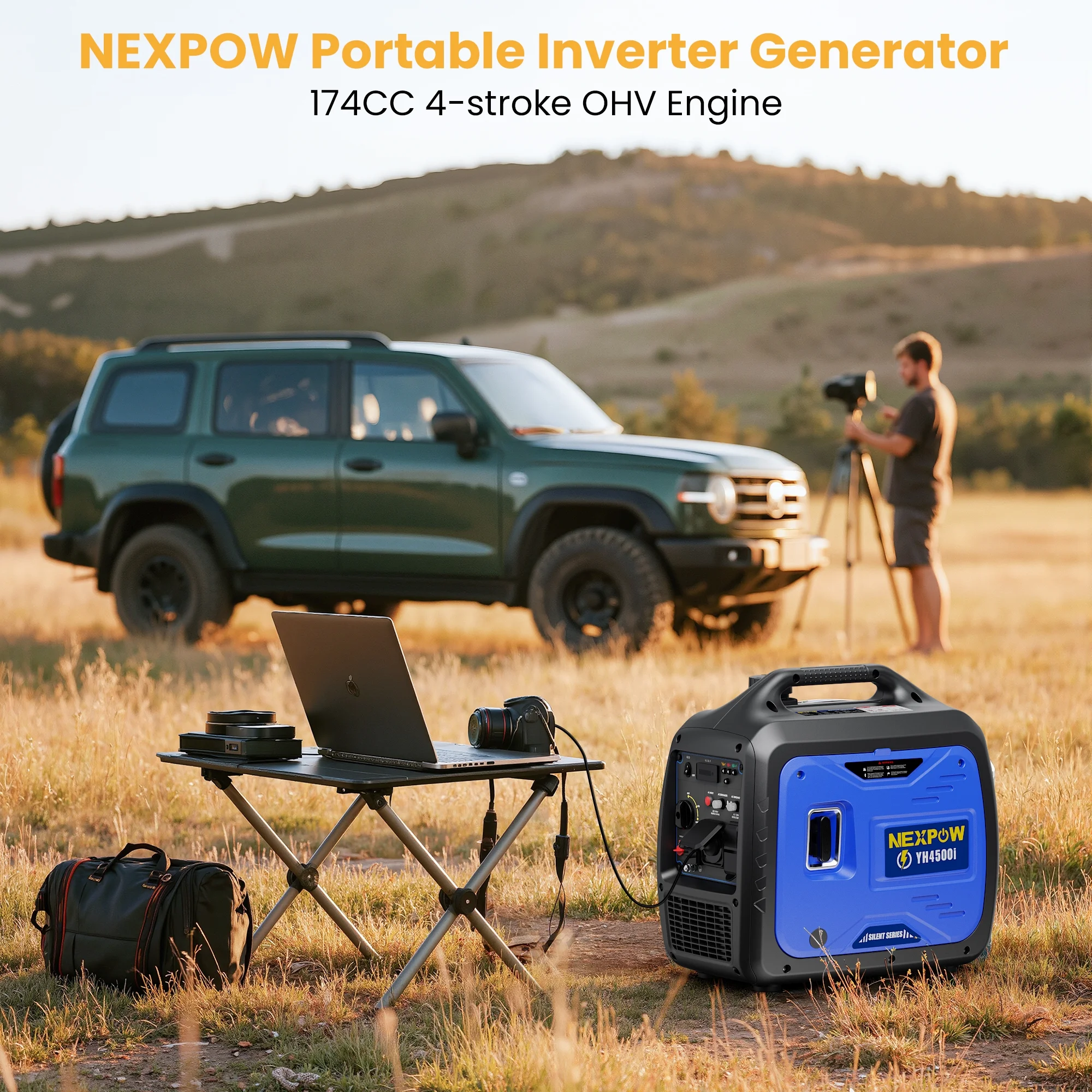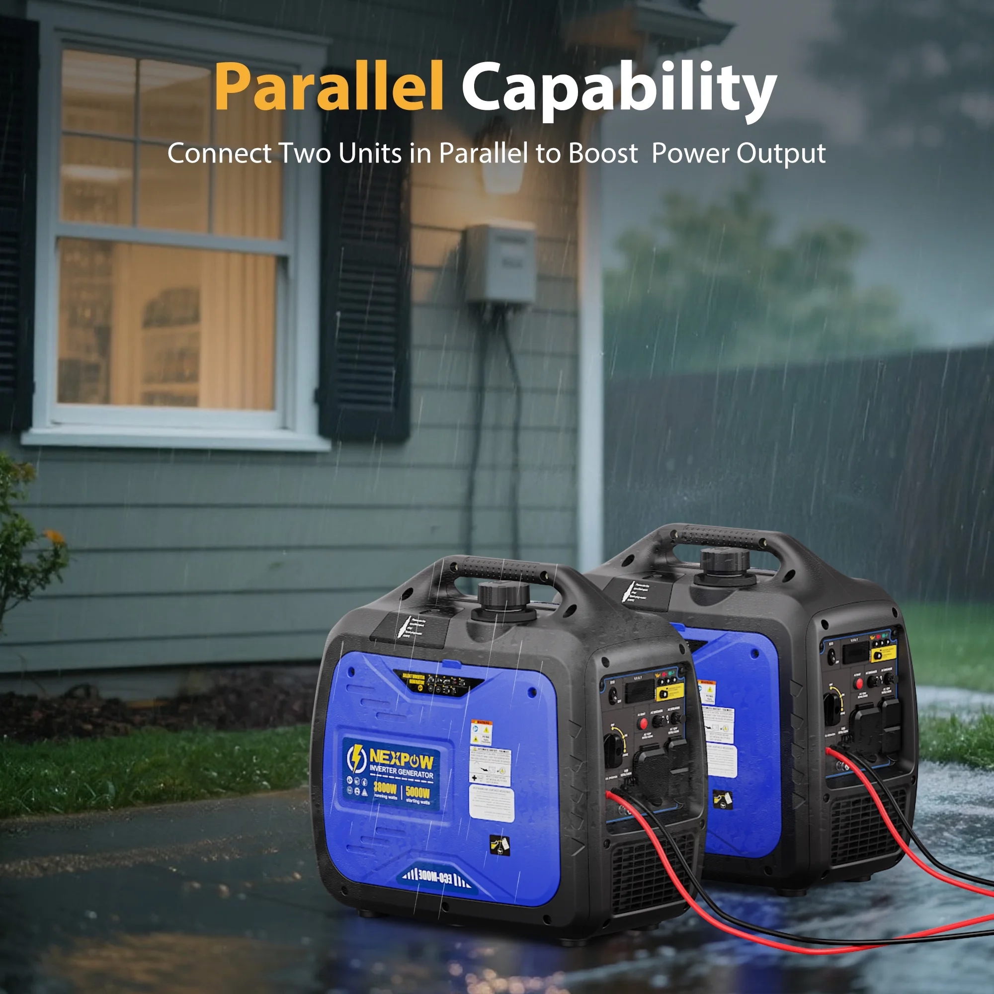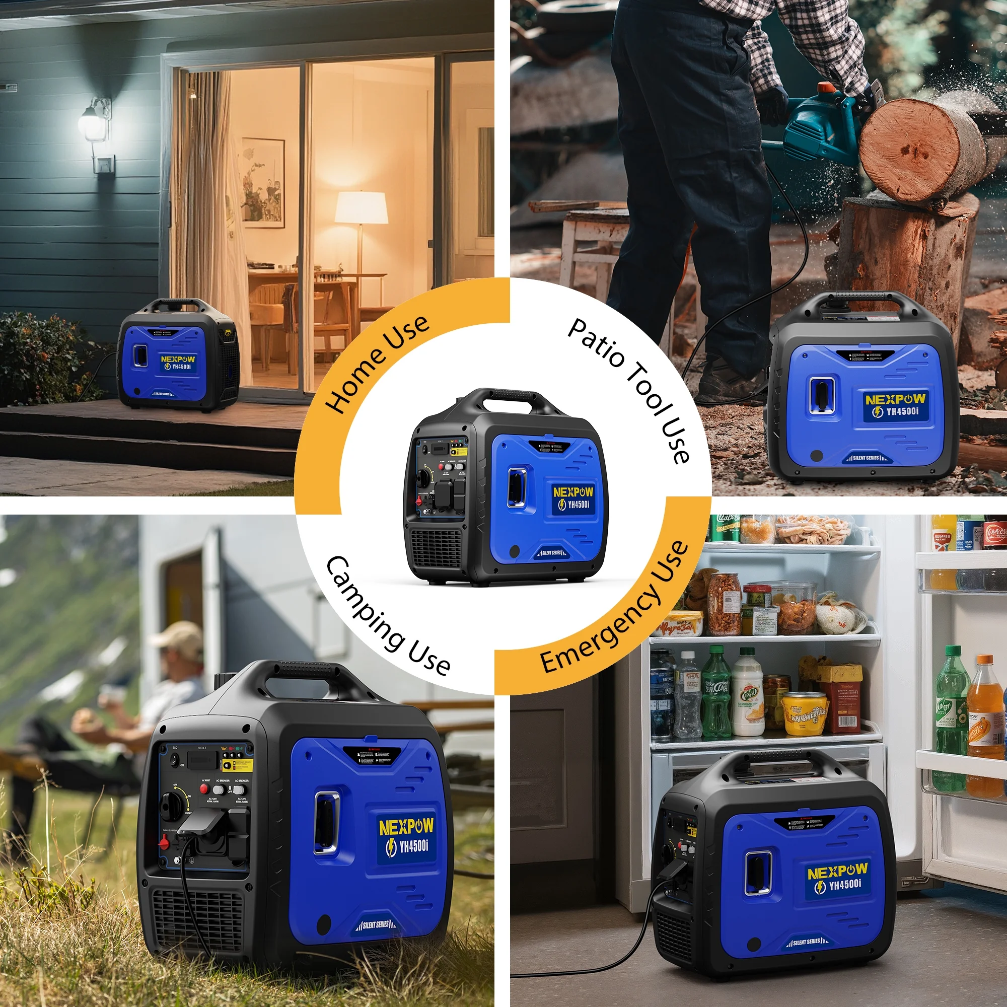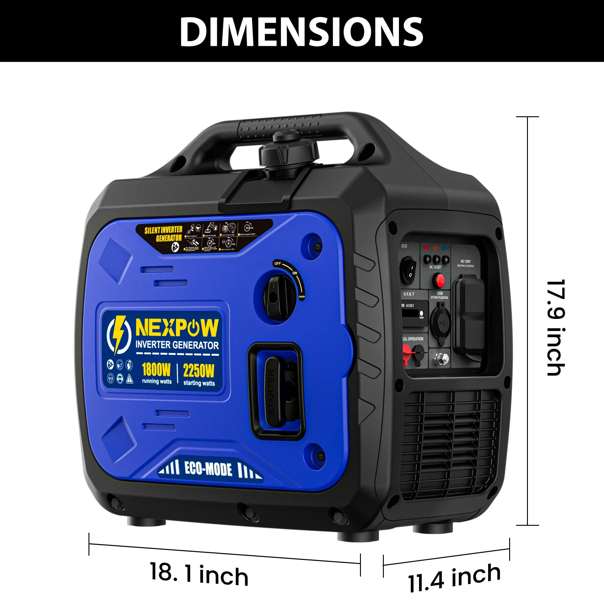 - ��Multi-Purpose Portable Inverter Generator��The NEXPOW Inverter Generator, powered by gasoline, delivers 2250W peak watts and 1800W running watts with overload protection. Designed for versatility, it effortlessly runs small home lighting systems, refrigerators, and other appliances. Even during power outages caused by extreme weather, this generator serves as a reliable energy source for sustained emergency use, ensuring uninterrupted power when you need it most.