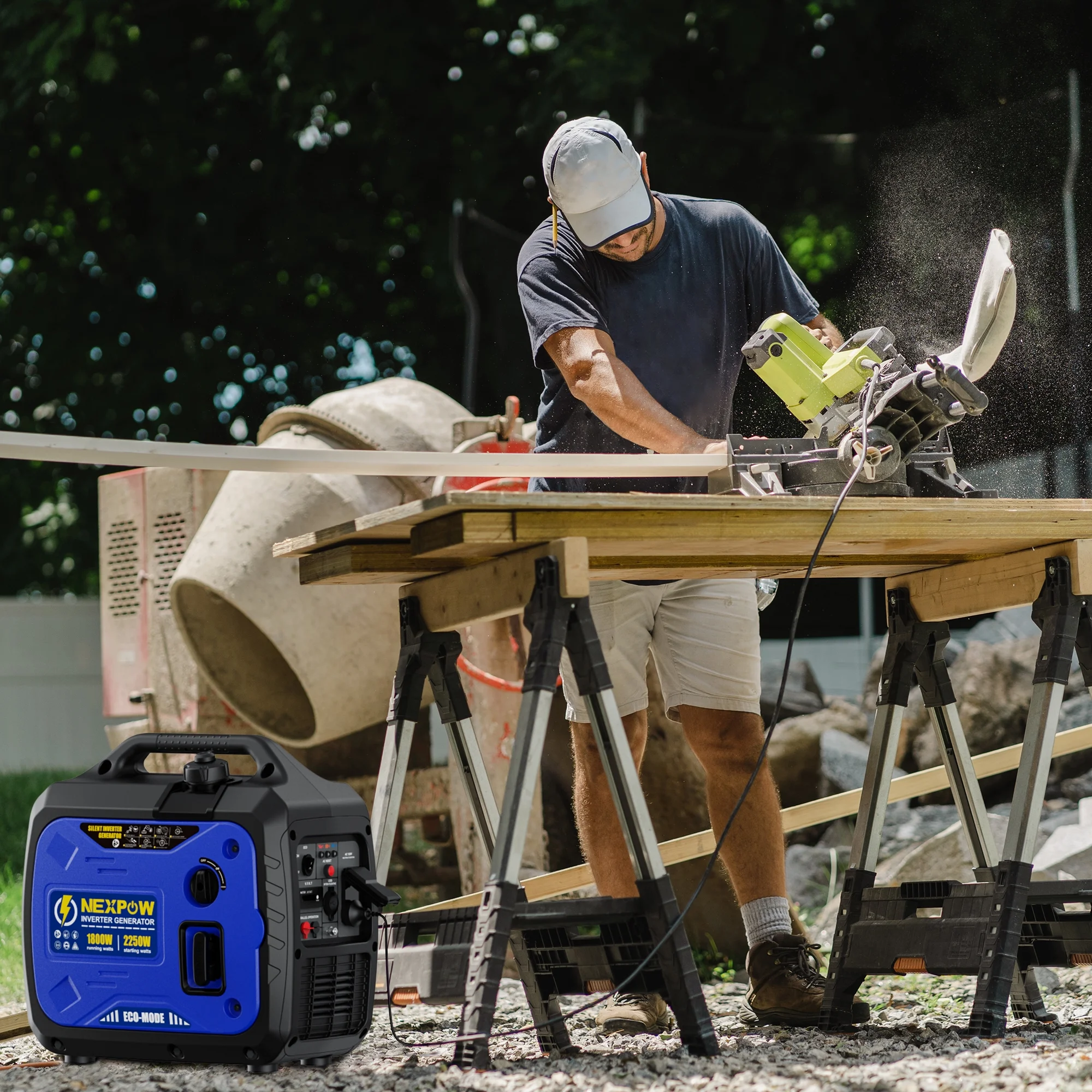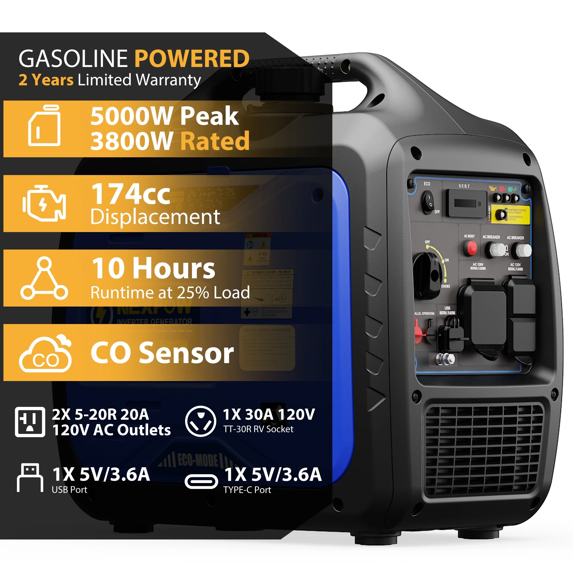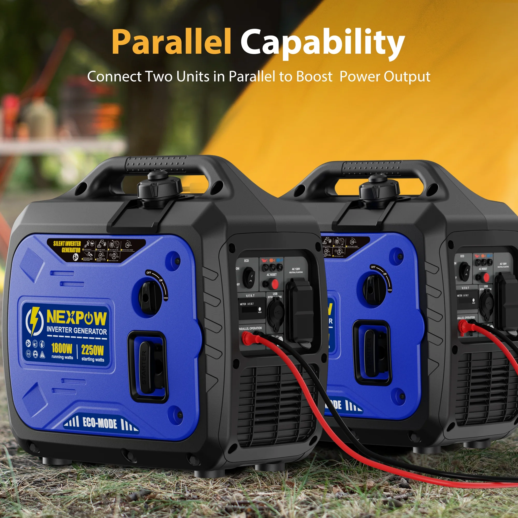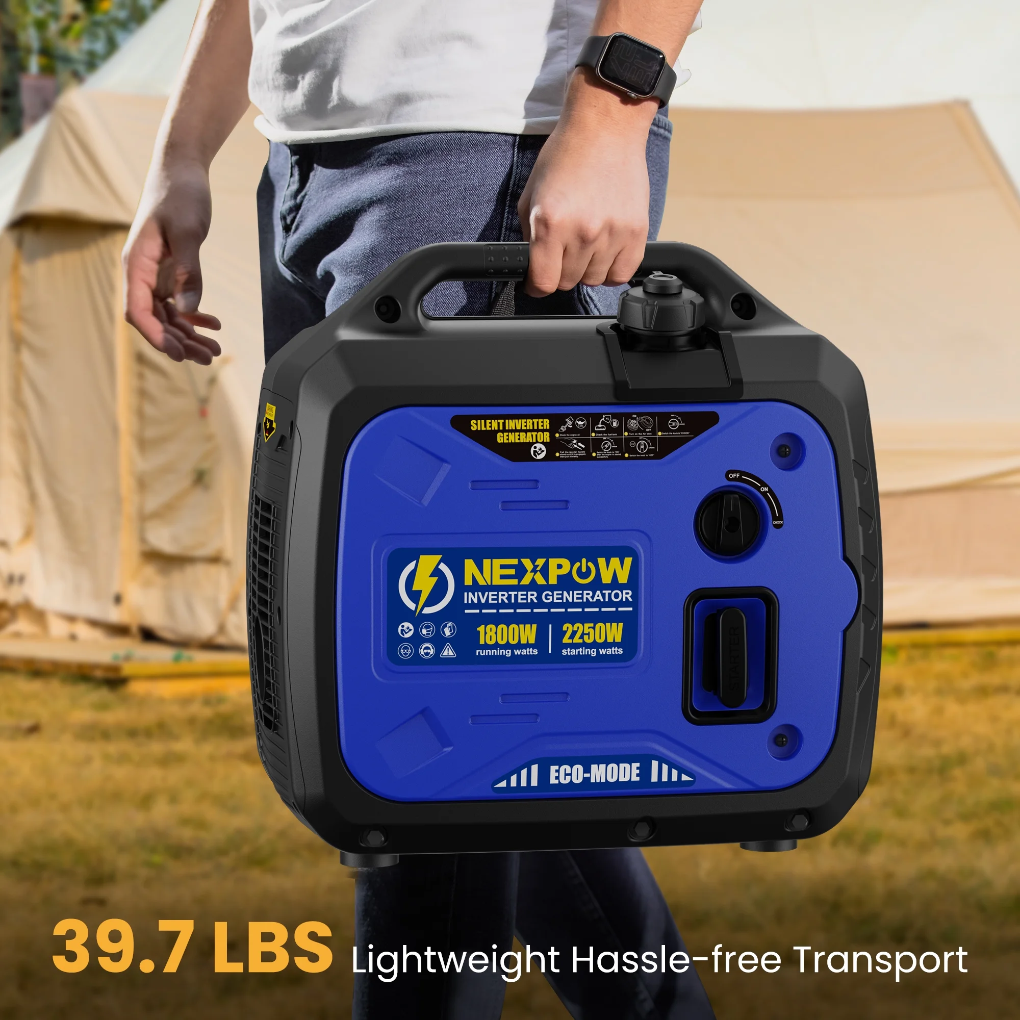 The NEXPOW Portable Inverter Generator is a robust power solution designed for home and outdoor use. Powered by gasoline, it delivers 2250W peak watts and 1800W running watts. Equipped with a 20A 5-20R duplex outlet with waterproof cover, 5V/3.6A USB port, and 5V/3.6A Type-C port, it enables safe multi-device connectivity. Its AC parallel operation capability allows dual-unit linkage for increased output.EPA-certified for safety, this generator features an Eco Mode that extends runtime to over 10 hours at 25% load. Operating at just 58 dB from 23 feet, it minimizes noise disturbance. Built with premium copper wiring for superior conductivity and heat dissipation, it houses a 79.7cc 4-stroke OHV single-cylinder engine.Weighing only 39.7 lbs with a sturdy carry handle, this lightweight powerhouse is ideal for home backup and camping adventures, delivering reliable power wherever you go.