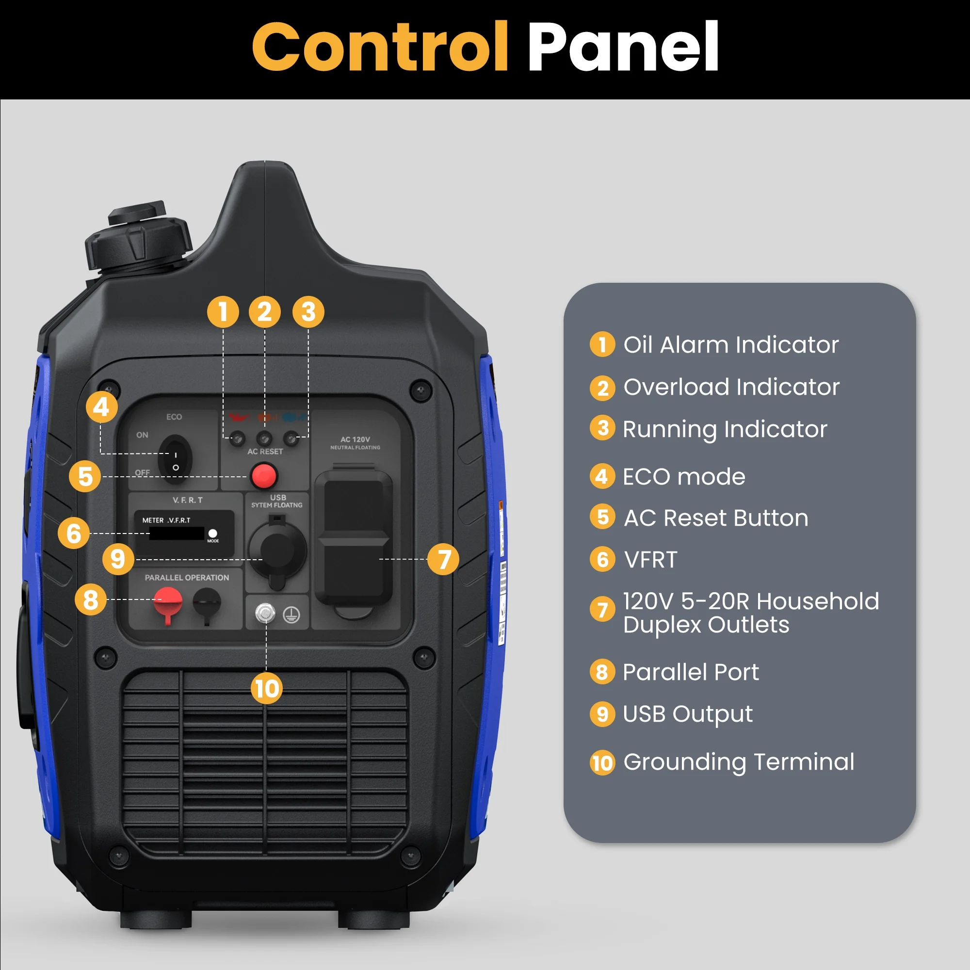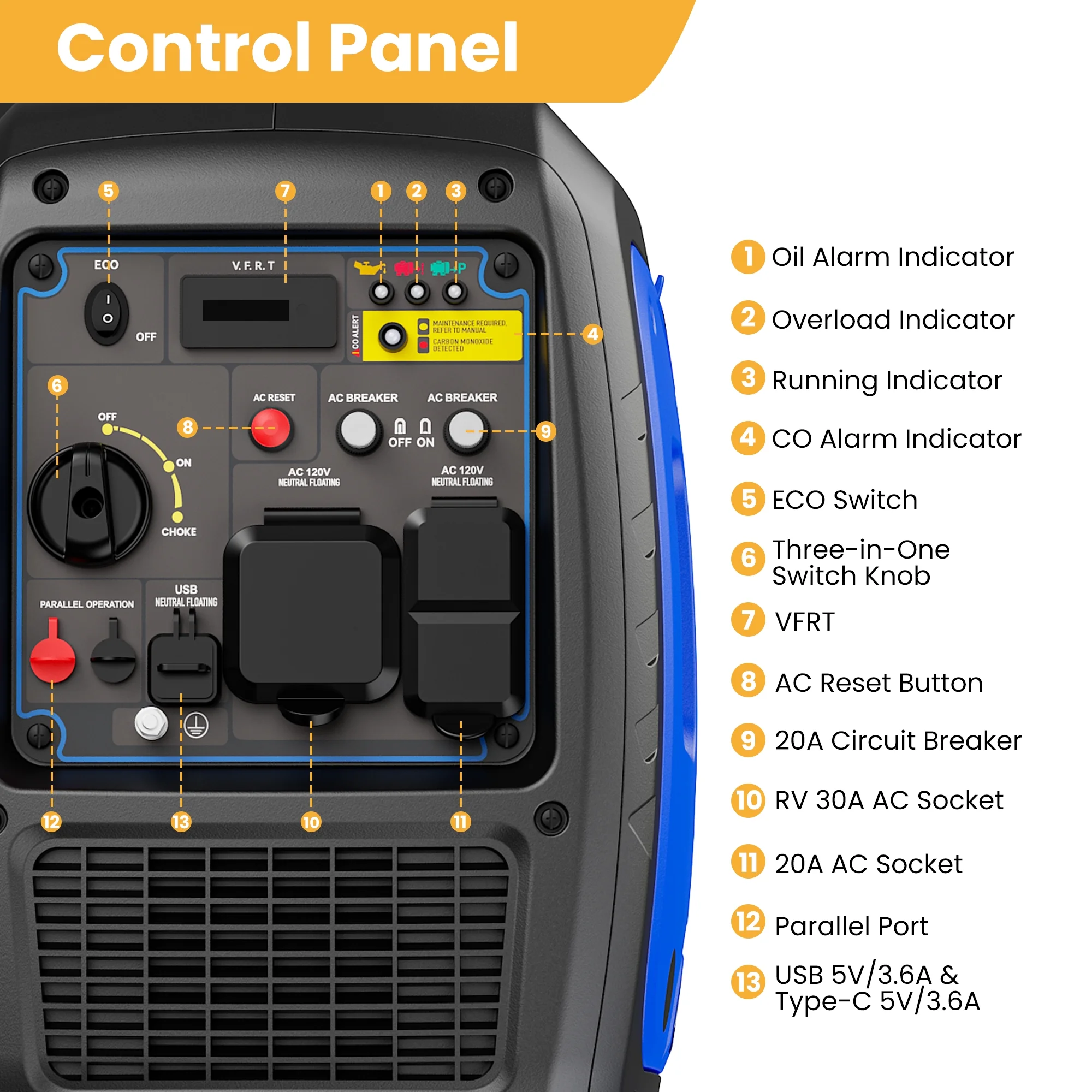 - ��Multiple Output Ports & Parallel Capability��Features a 20A/5-20R duplex outlet with a weatherproof cover, a three-in-one digital display (voltage, frequency, remaining runtime), an oil warning indicator, overload indicator, running indicator, a 5V/3.6A USB port, and a 5V/3.6A Type-C port, ensuring safe and stable power delivery to multiple devices simultaneously. Equipped with AC parallel operation capability, this generator allows you to effortlessly connect two units with identical voltage and frequency for increased power output.