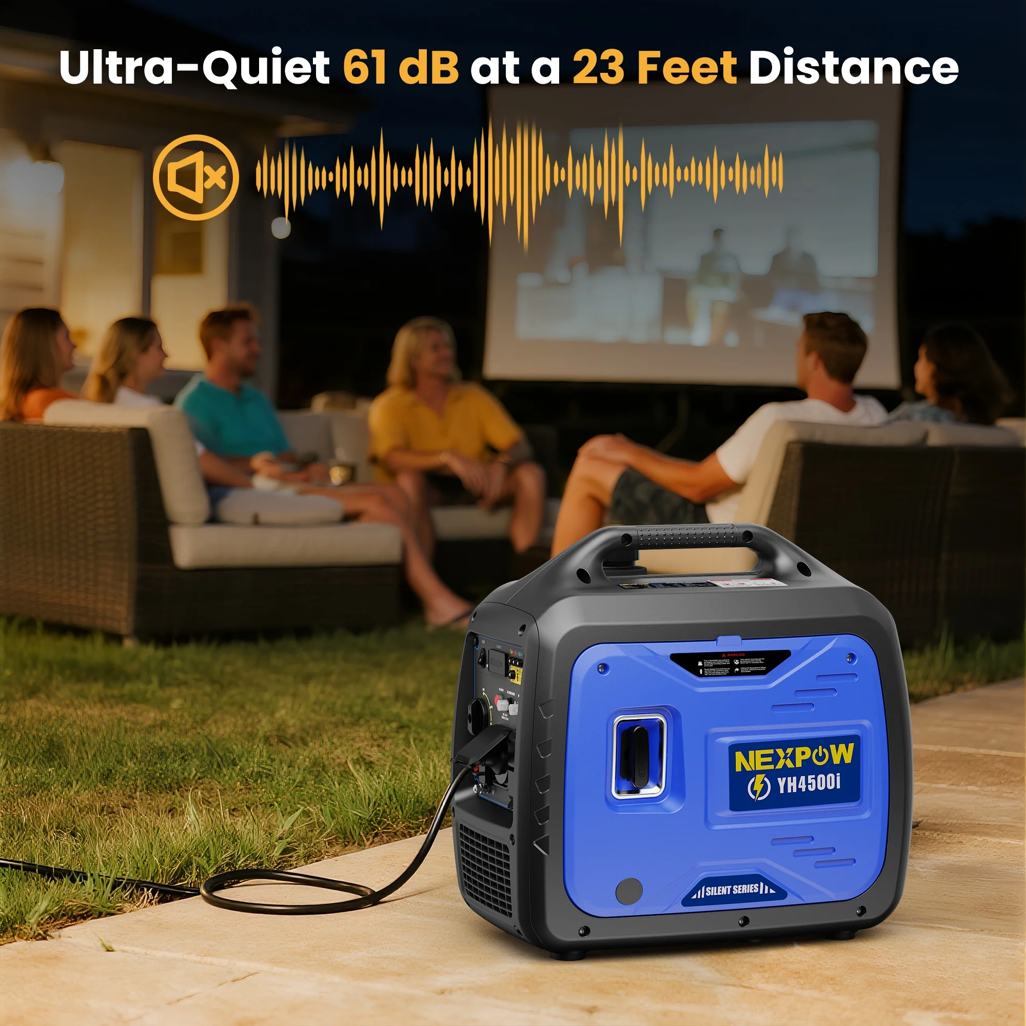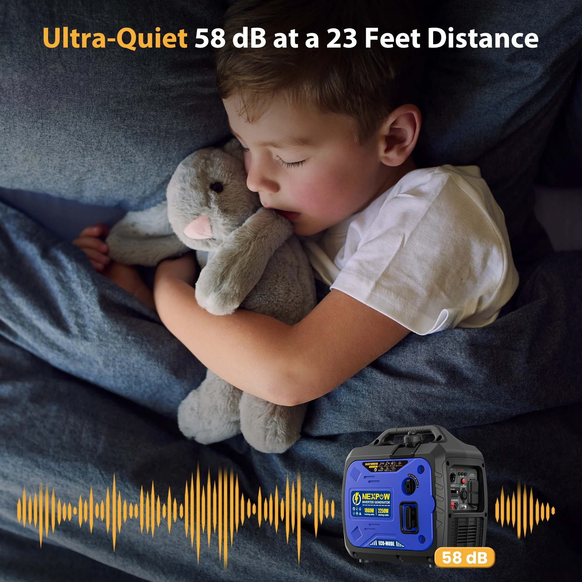 - ��Ultra-Quiet Mode��Features an advanced muffler and a fully enclosed design, significantly reducing operational noise. Compared to traditional generators, the NEXPOW operates in ultra-quiet mode, producing just 58 decibels at a 23 feet distance in ECO mode. This noise level is comparable to normal conversation or a running dishwasher, ensuring minimal disturbance to users or nearby individuals.