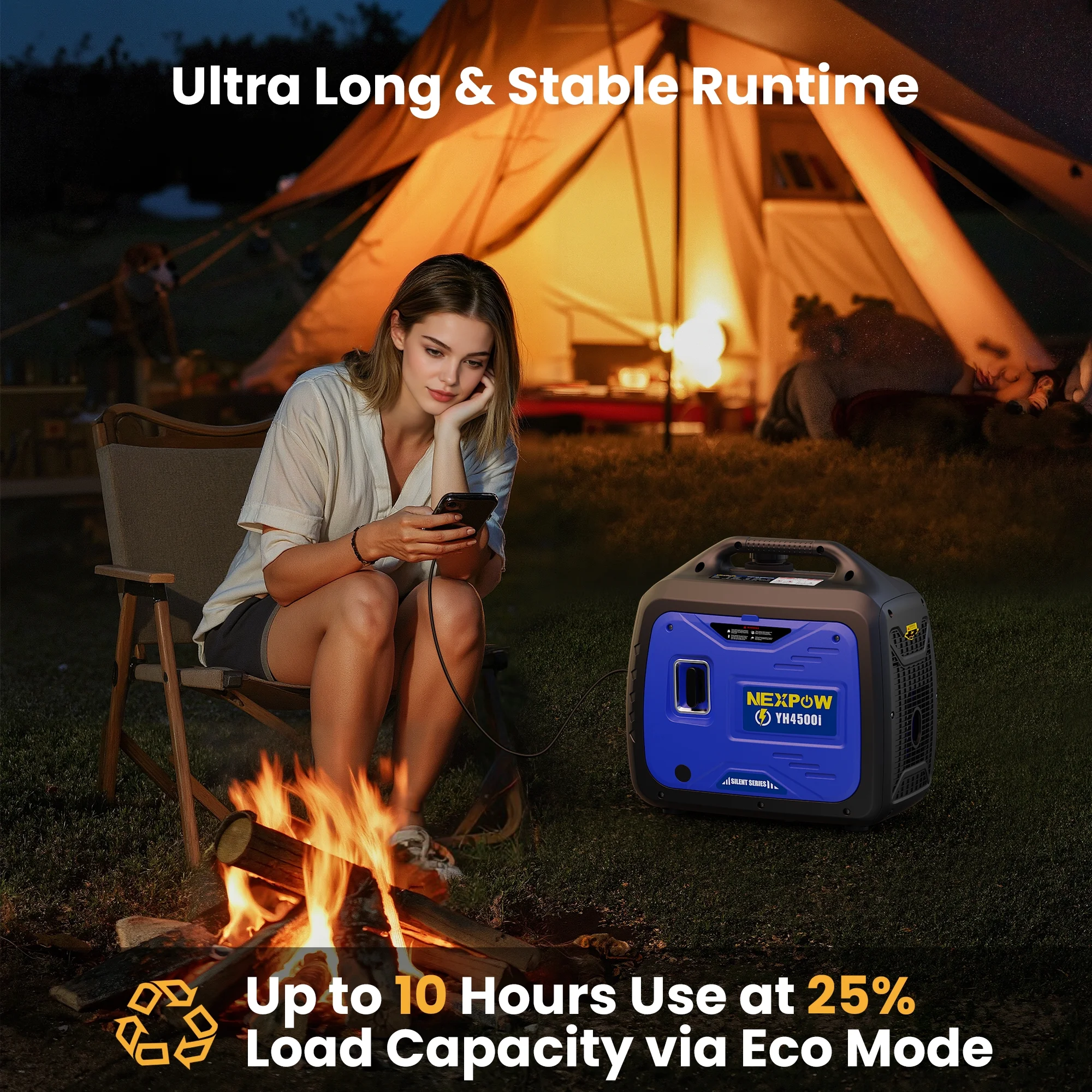 - ��Eco Mode and EPA Certification��The NEXPOW Inverter Generator is EPA-certified, ensuring safe and reliable operation. It also features an Eco Mode to extend runtime. With its 1.06-gallon fuel tank capacity, the generator can run for over 10 hours at 25% load capacity.
