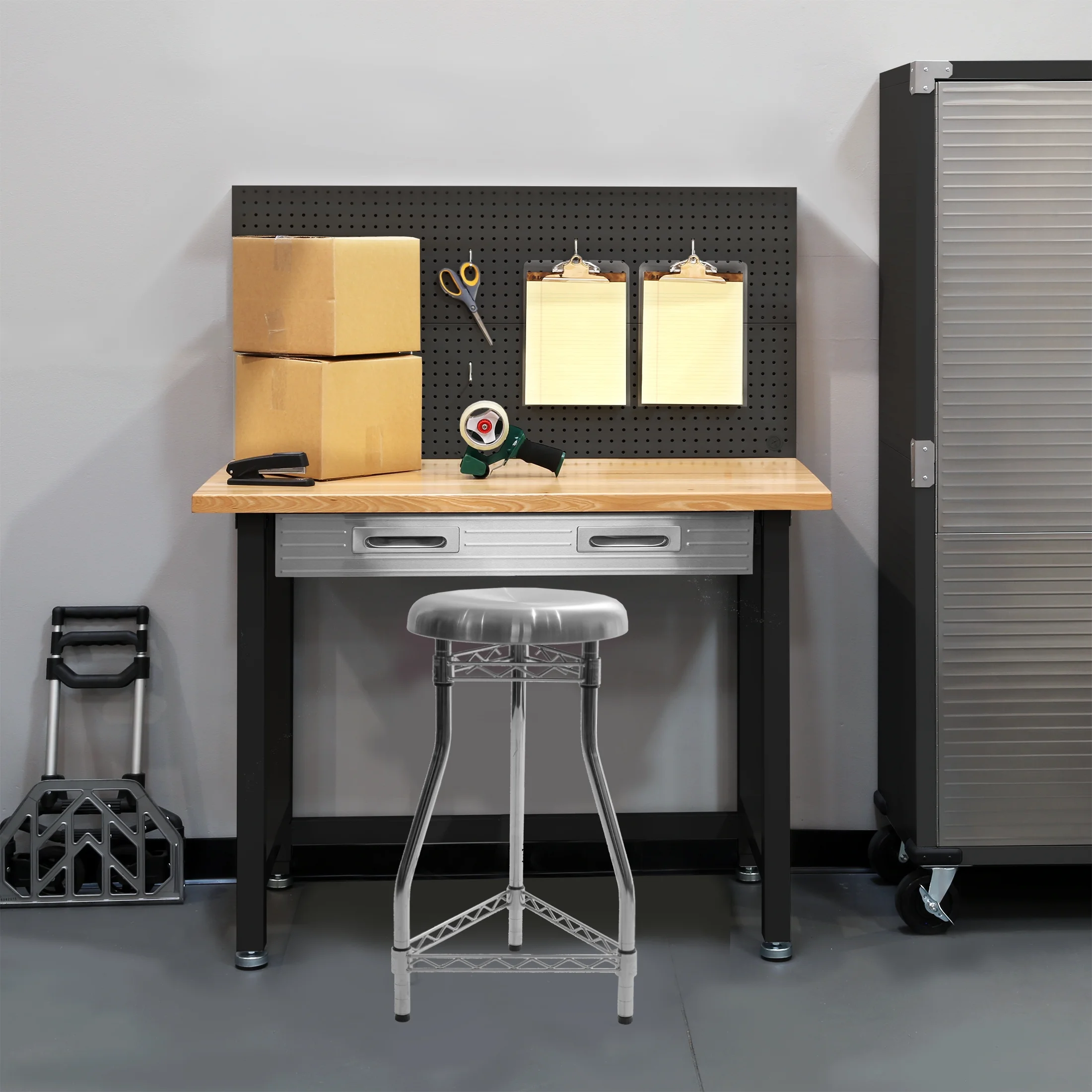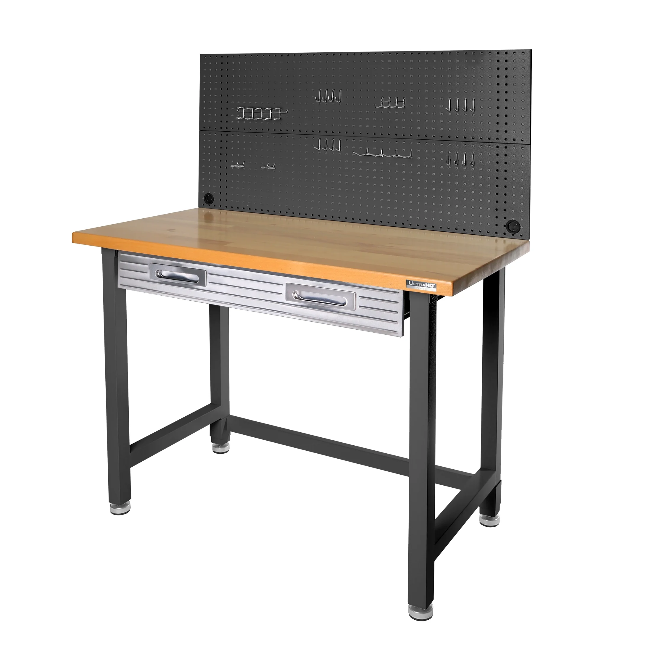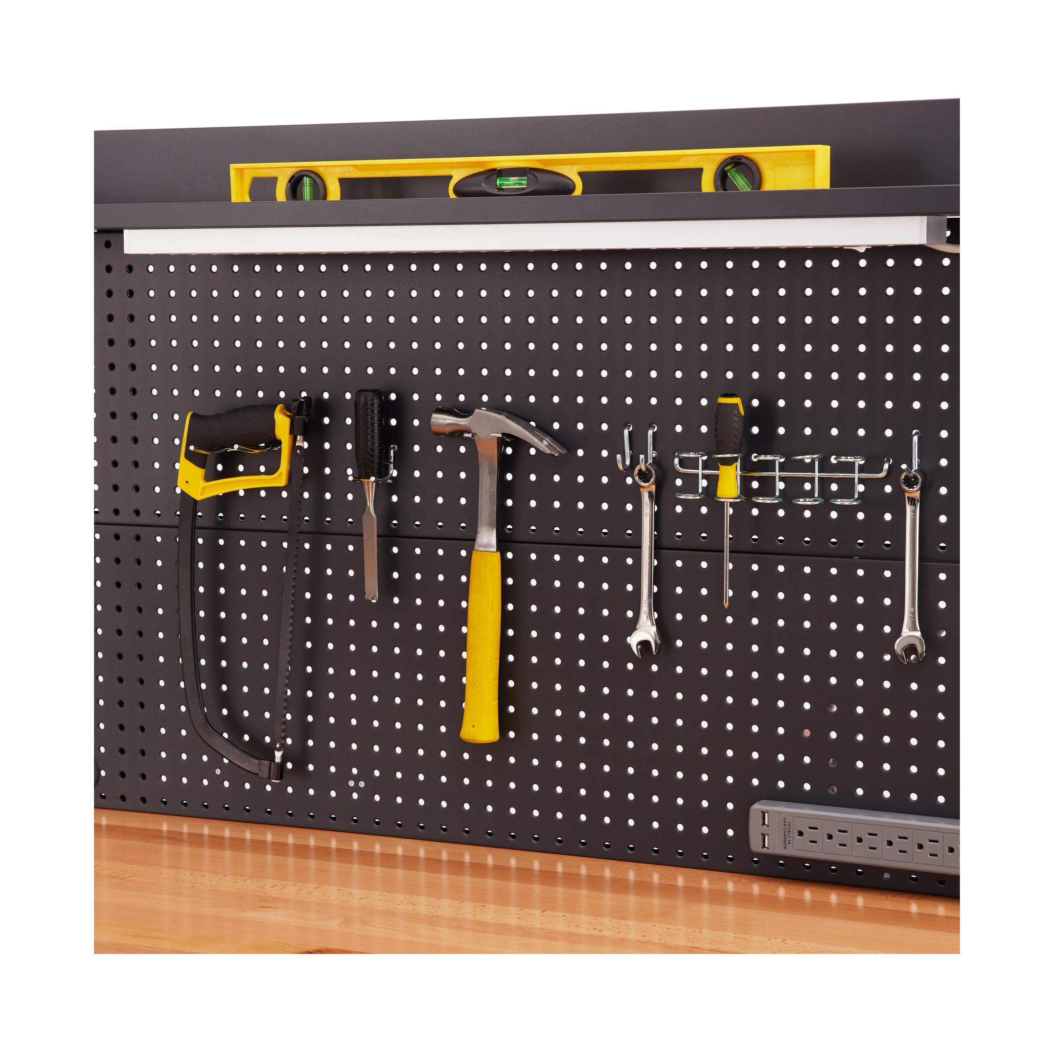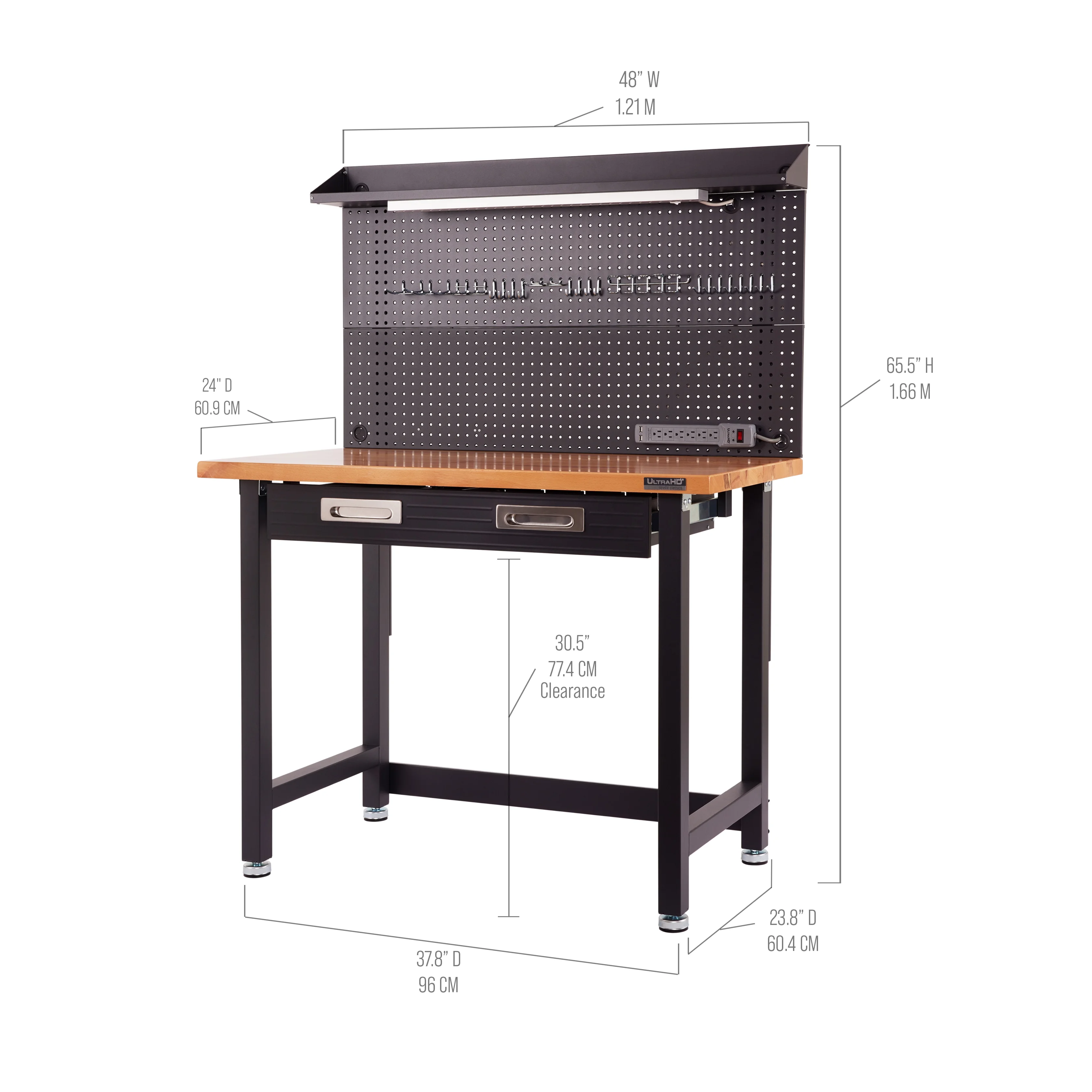 - Steel pegboard: 48" W x 24" D