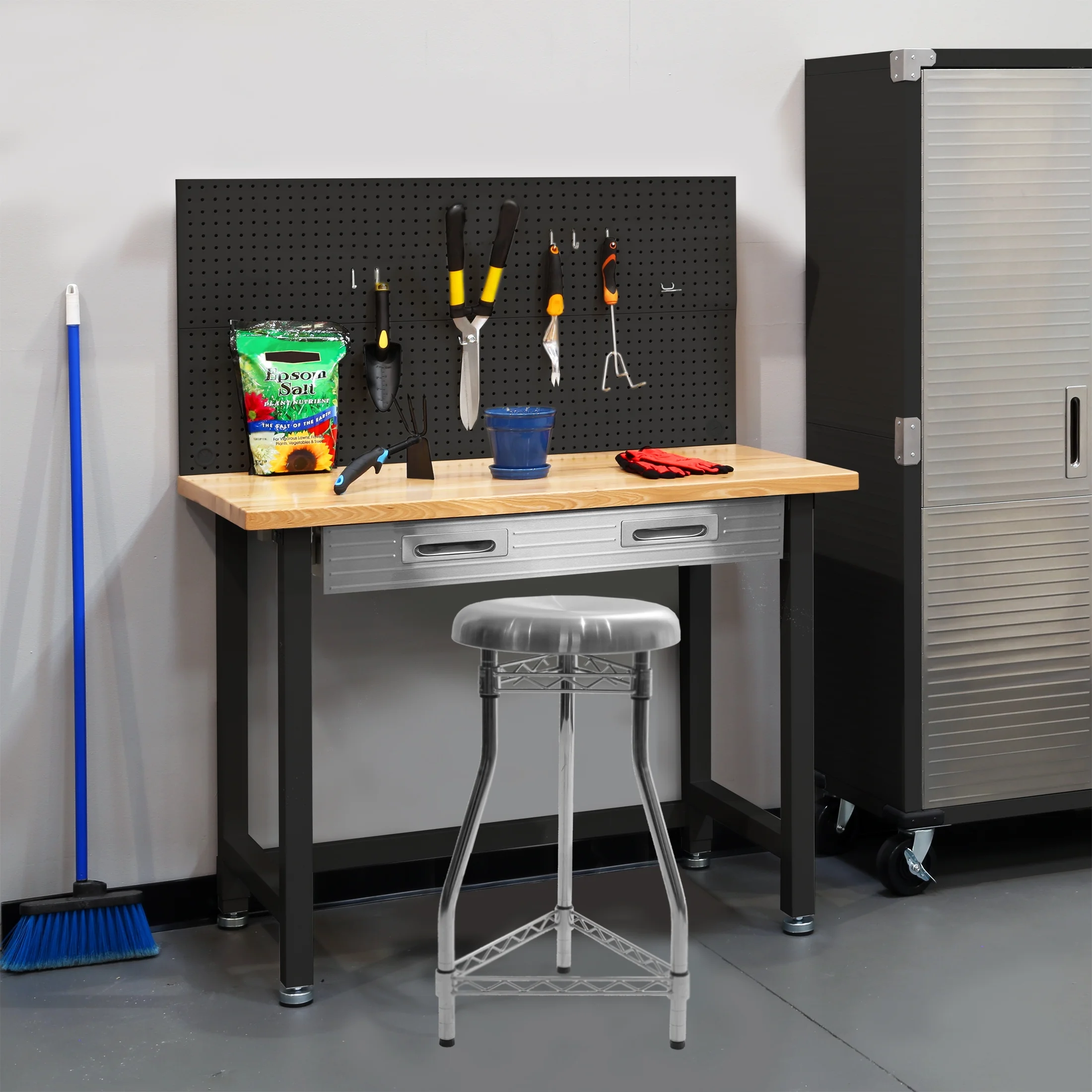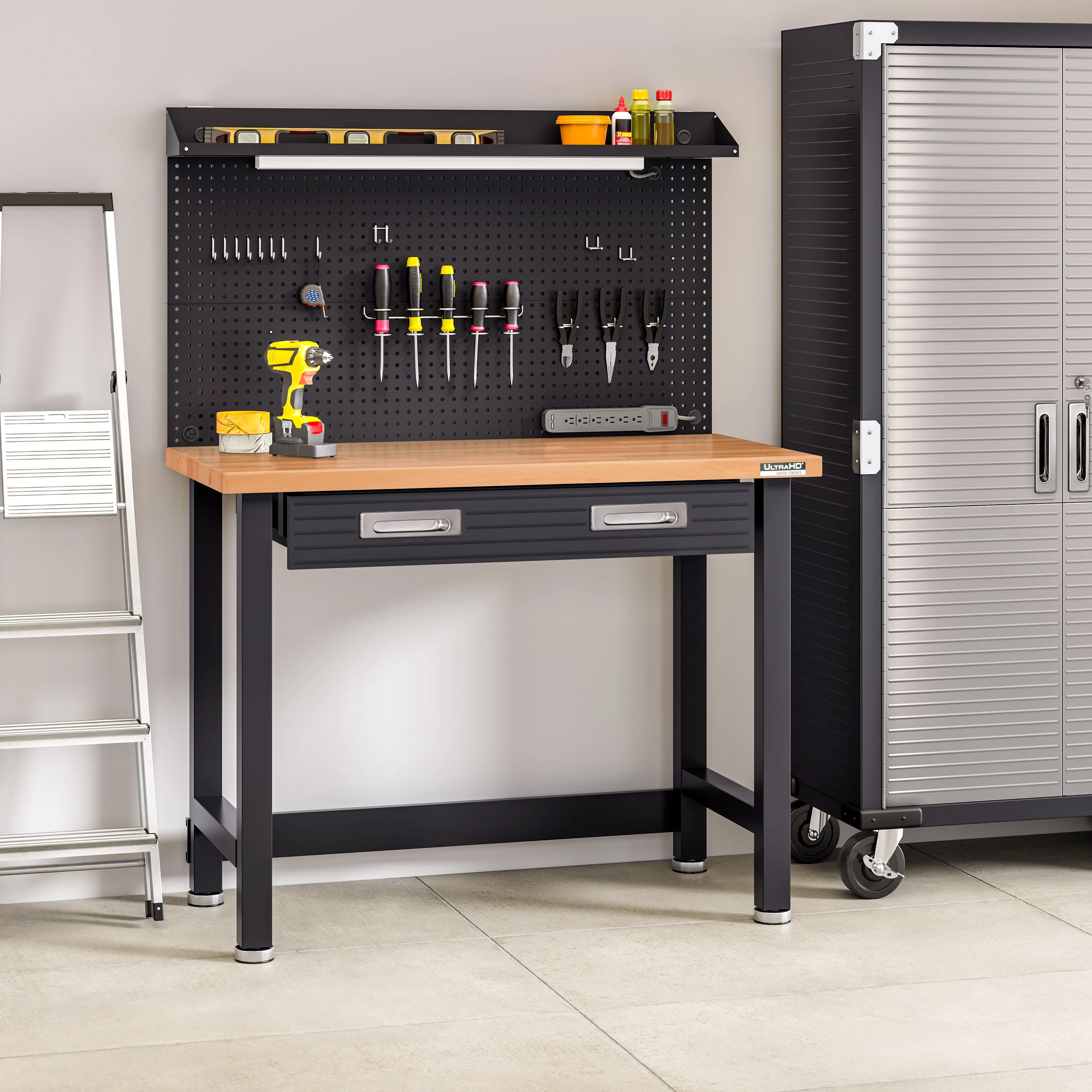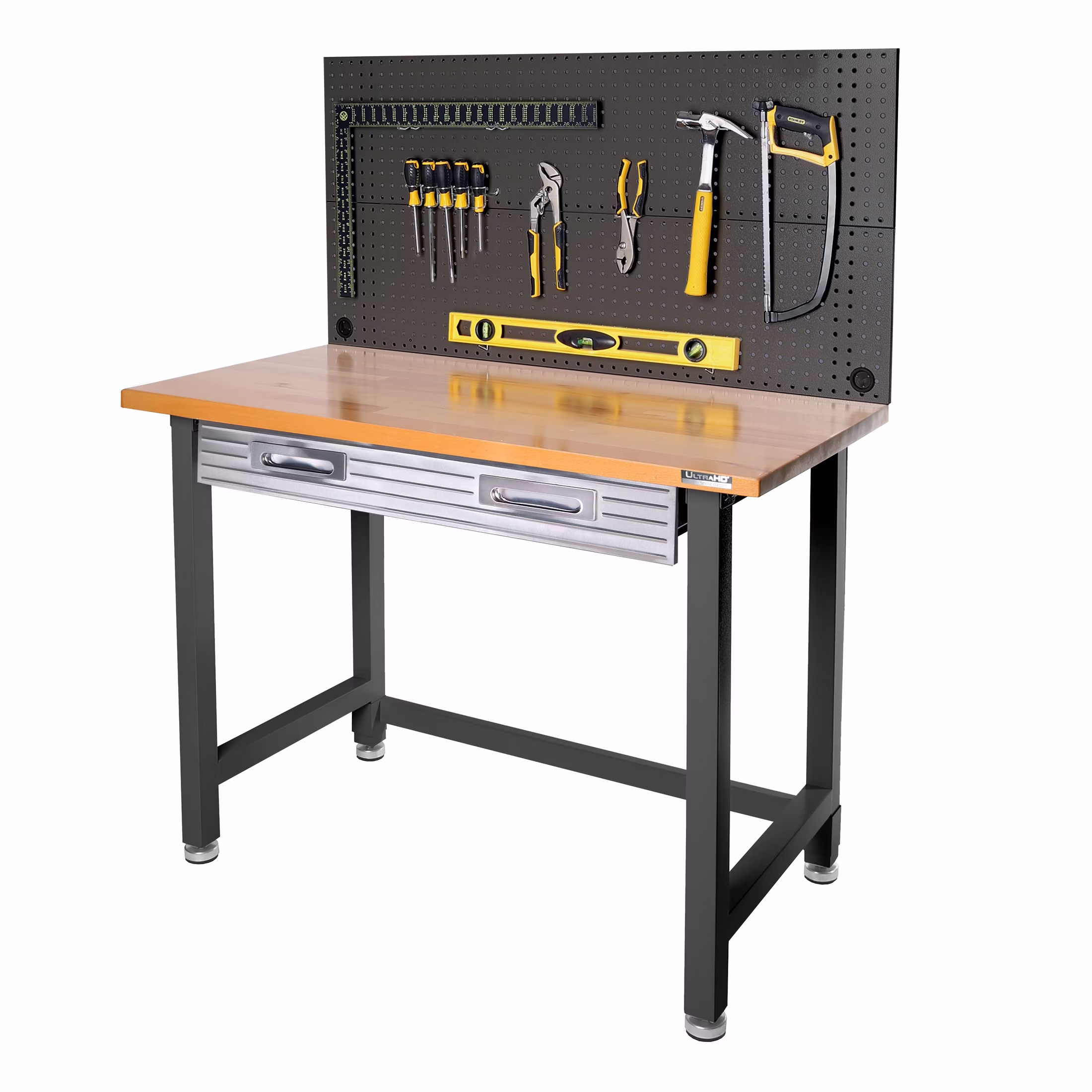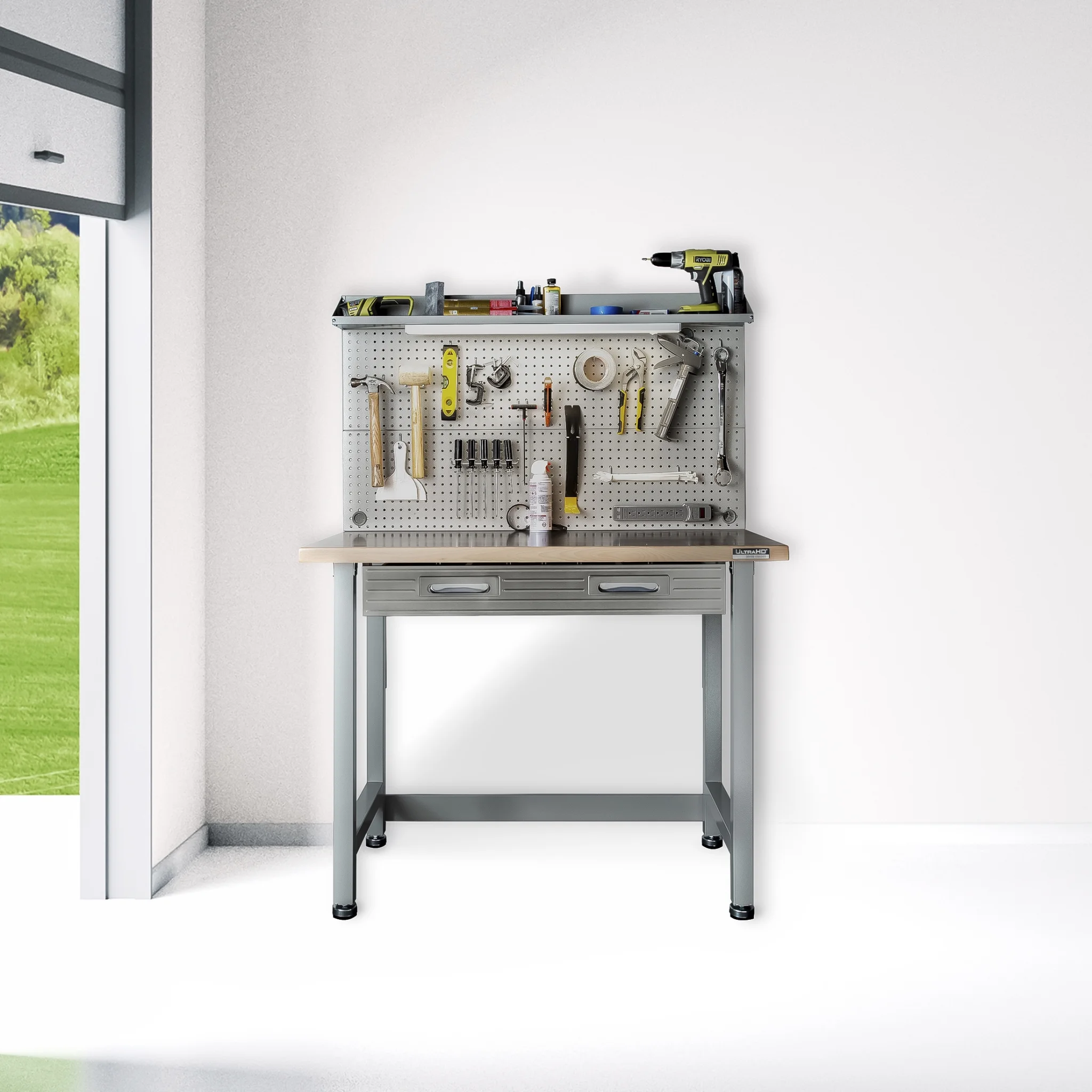 - Steel pegboard: 48" W x 24" D