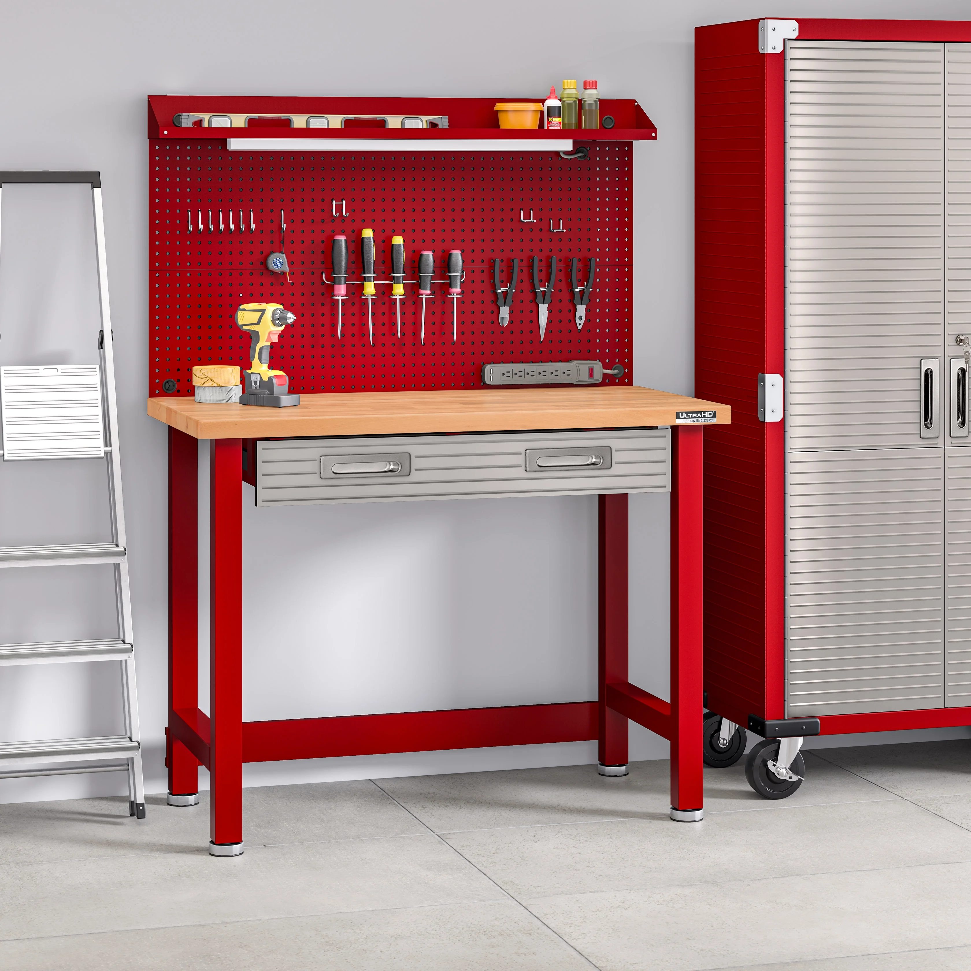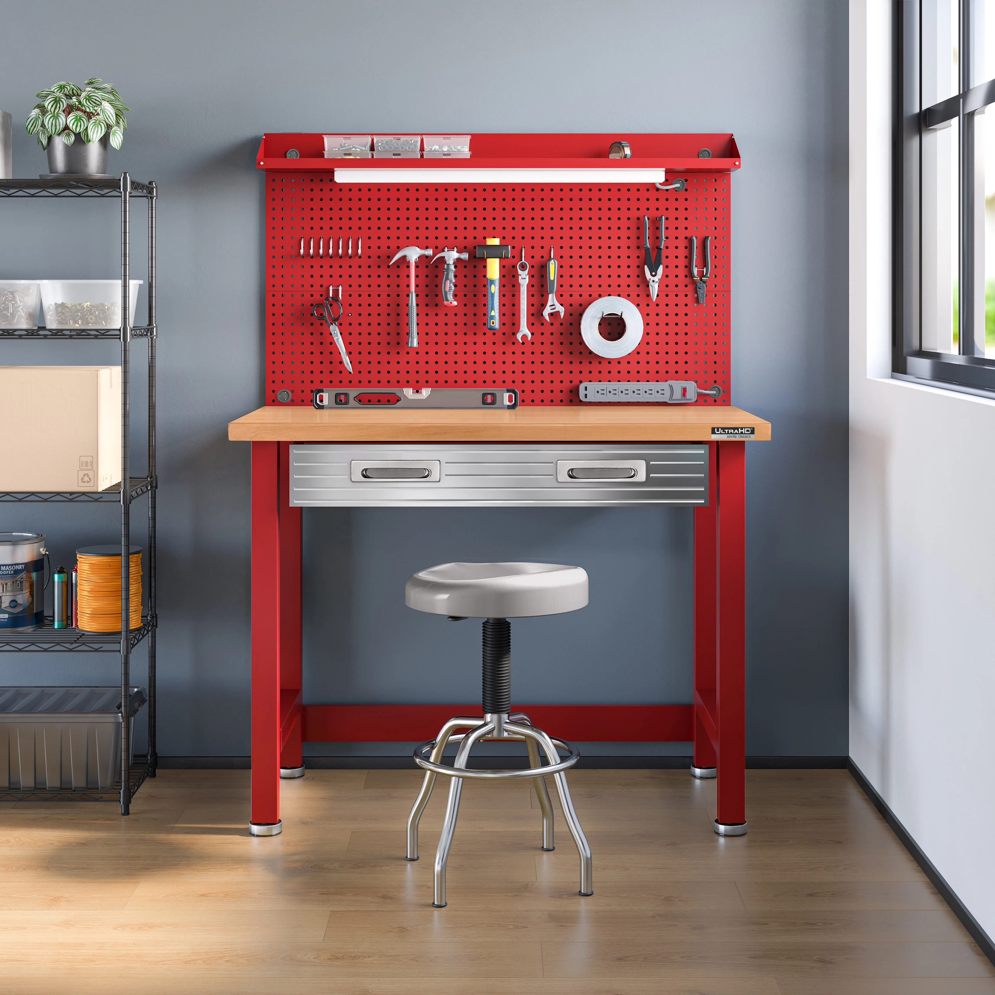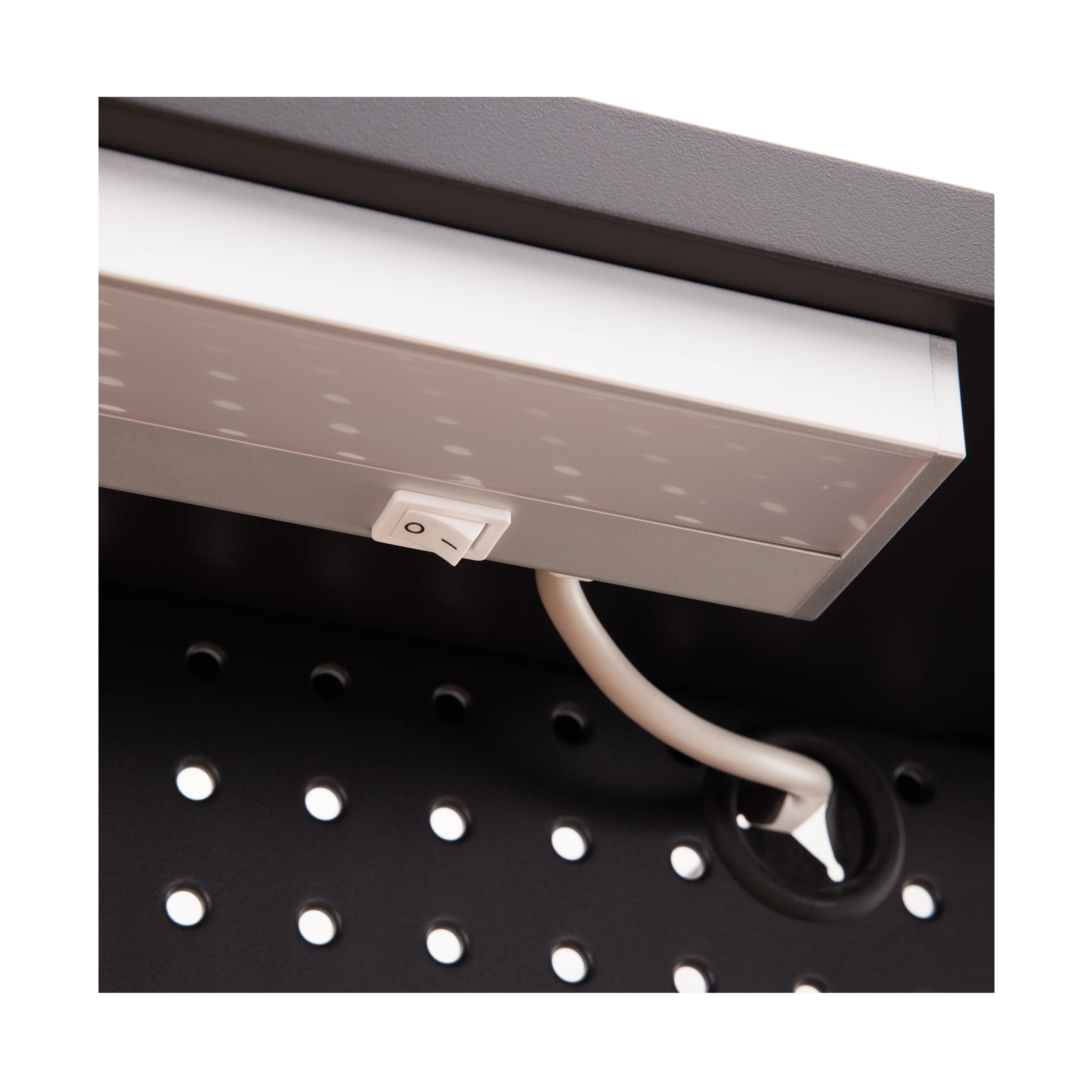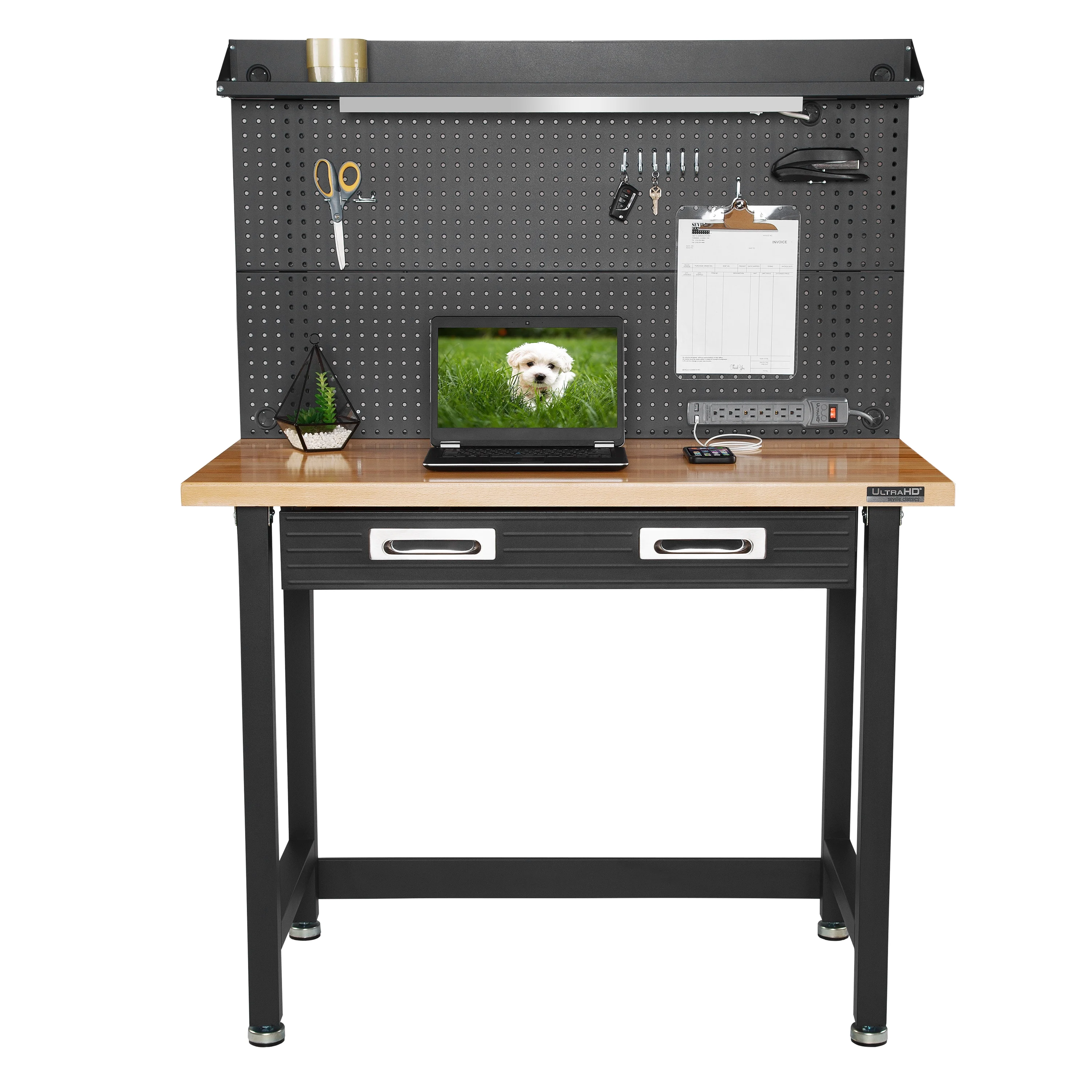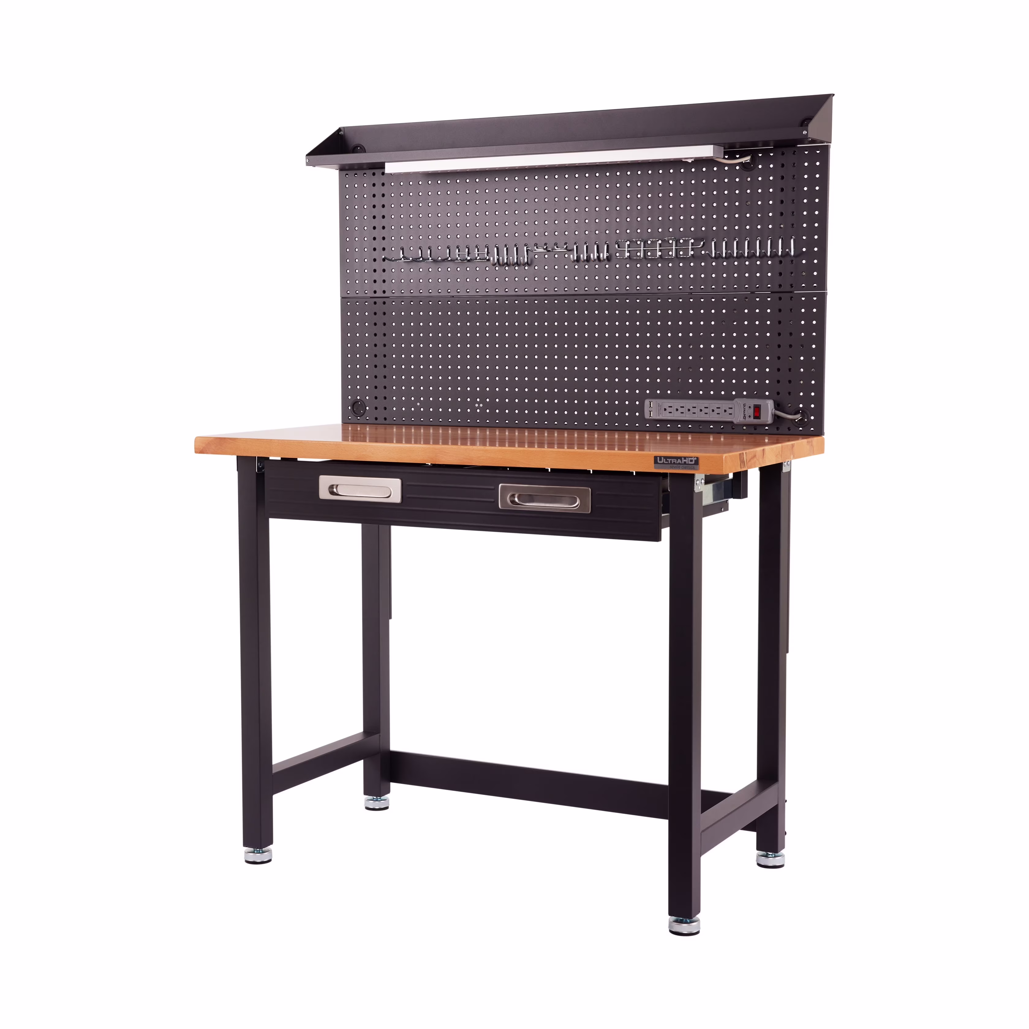 - Steel pegboard: 48" W x 24" D