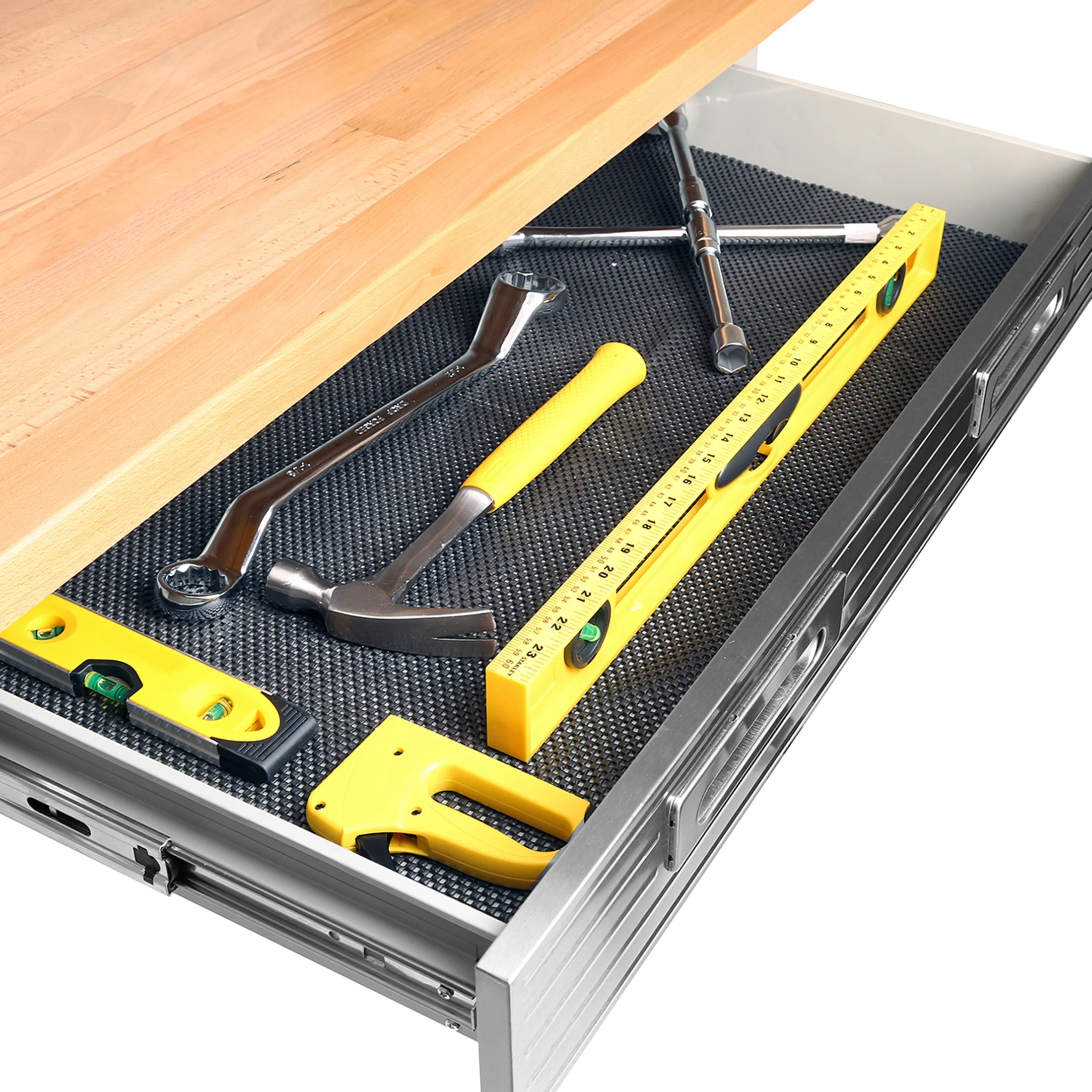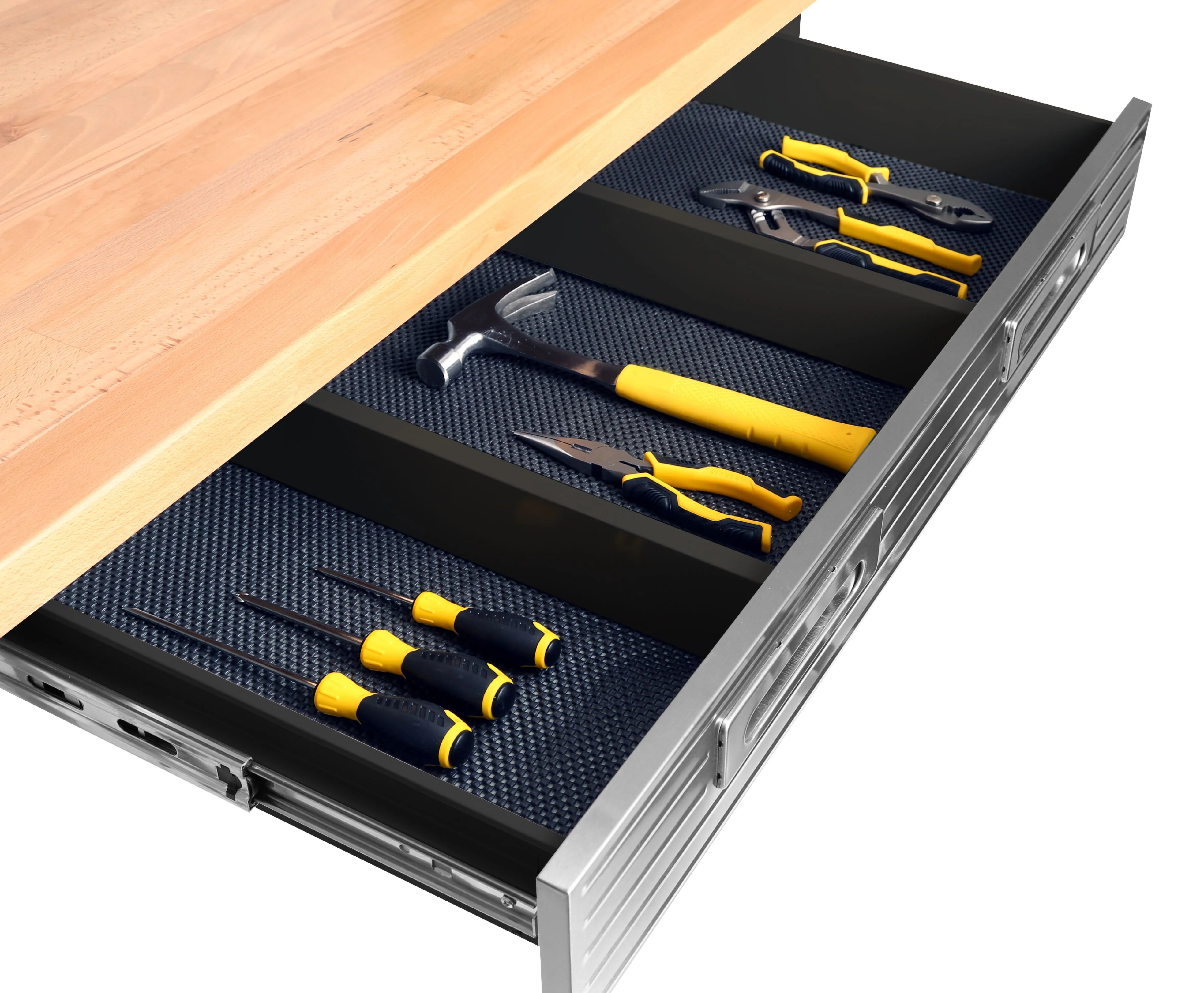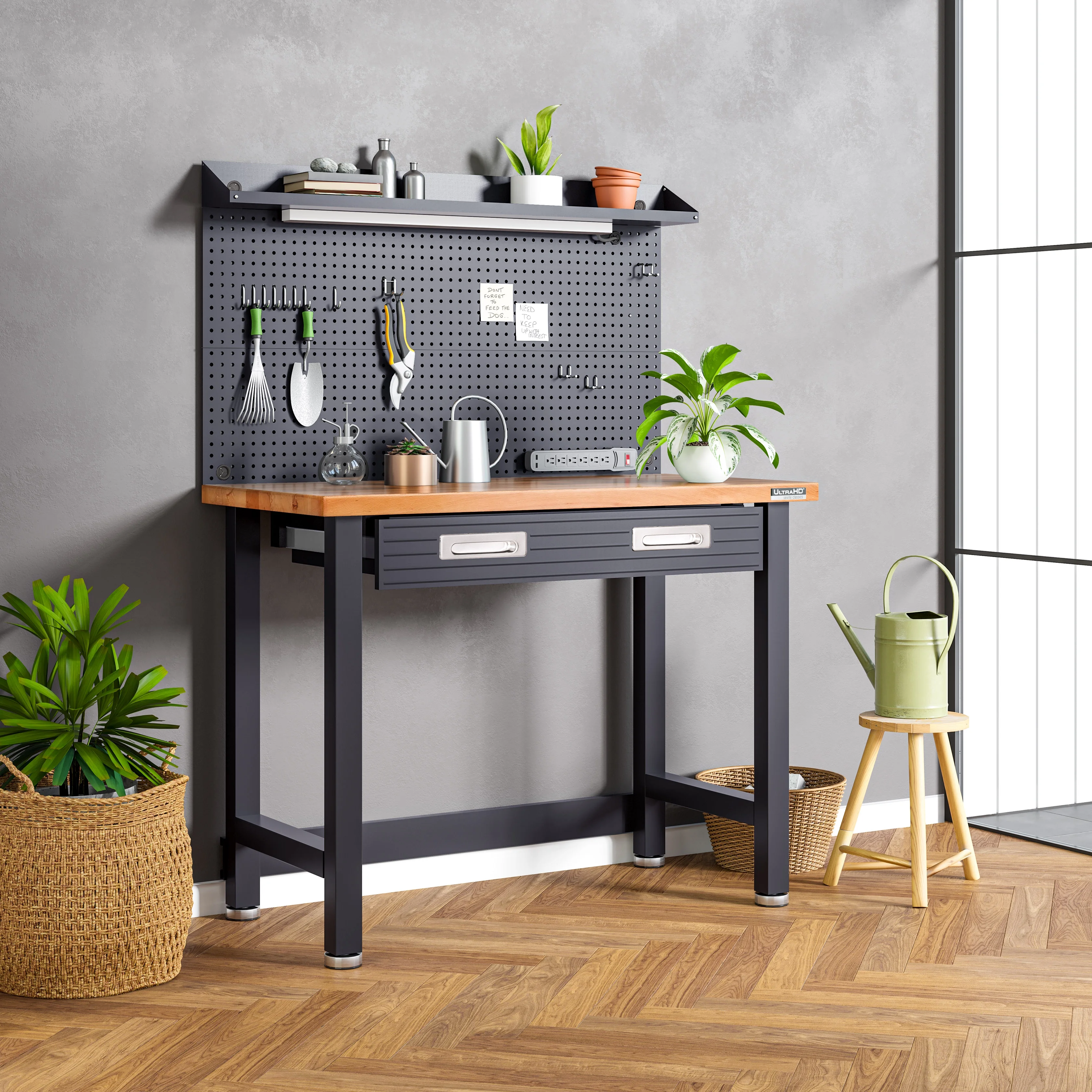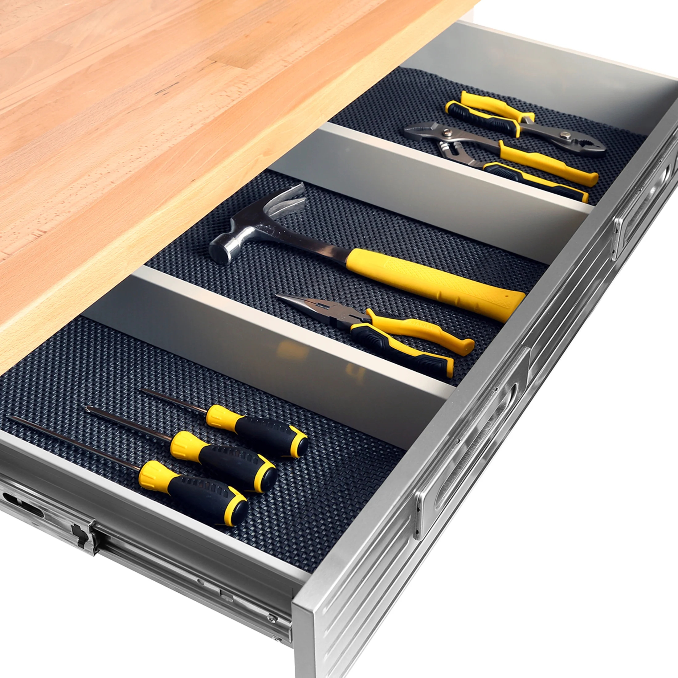 - Steel pegboard: 48" W x 24" D