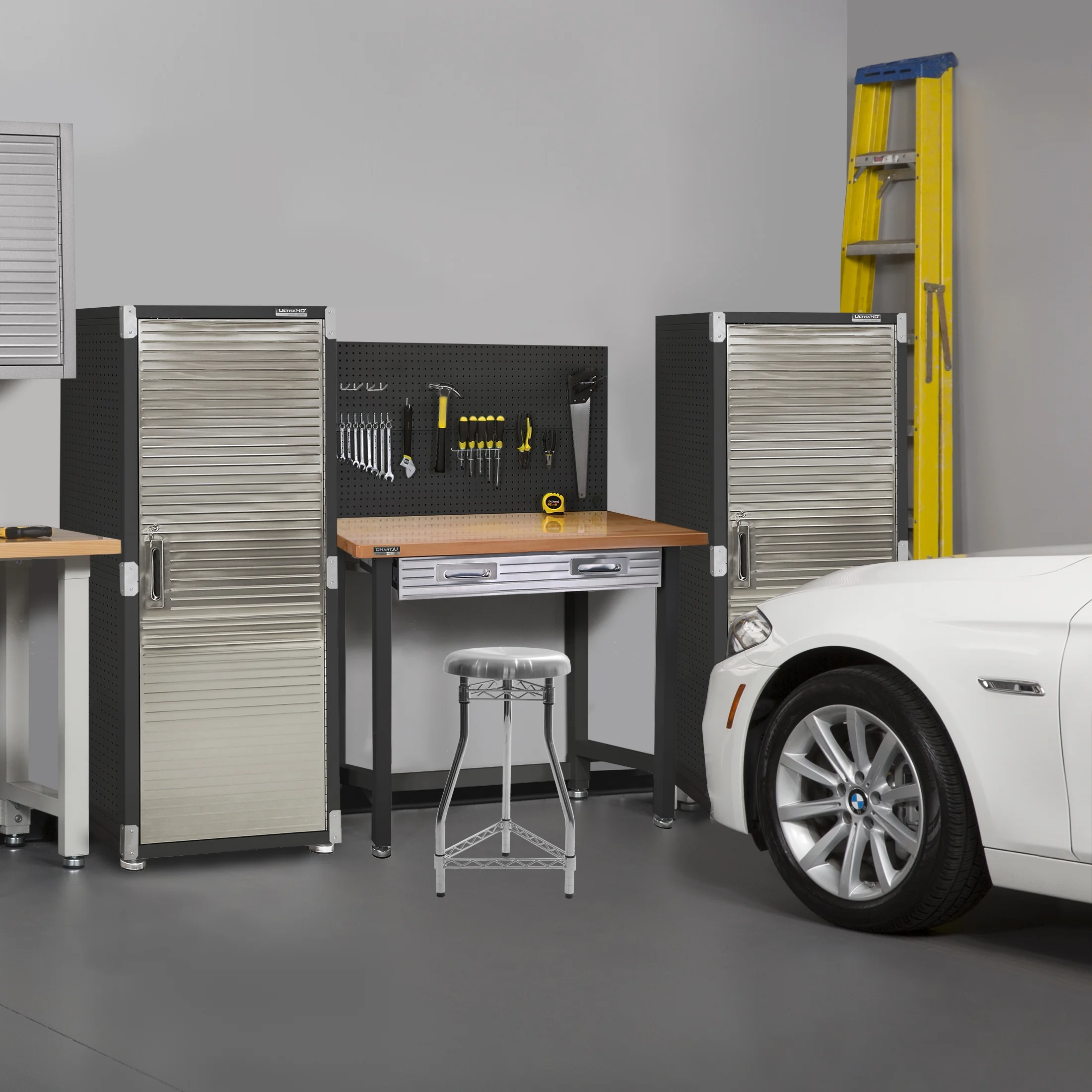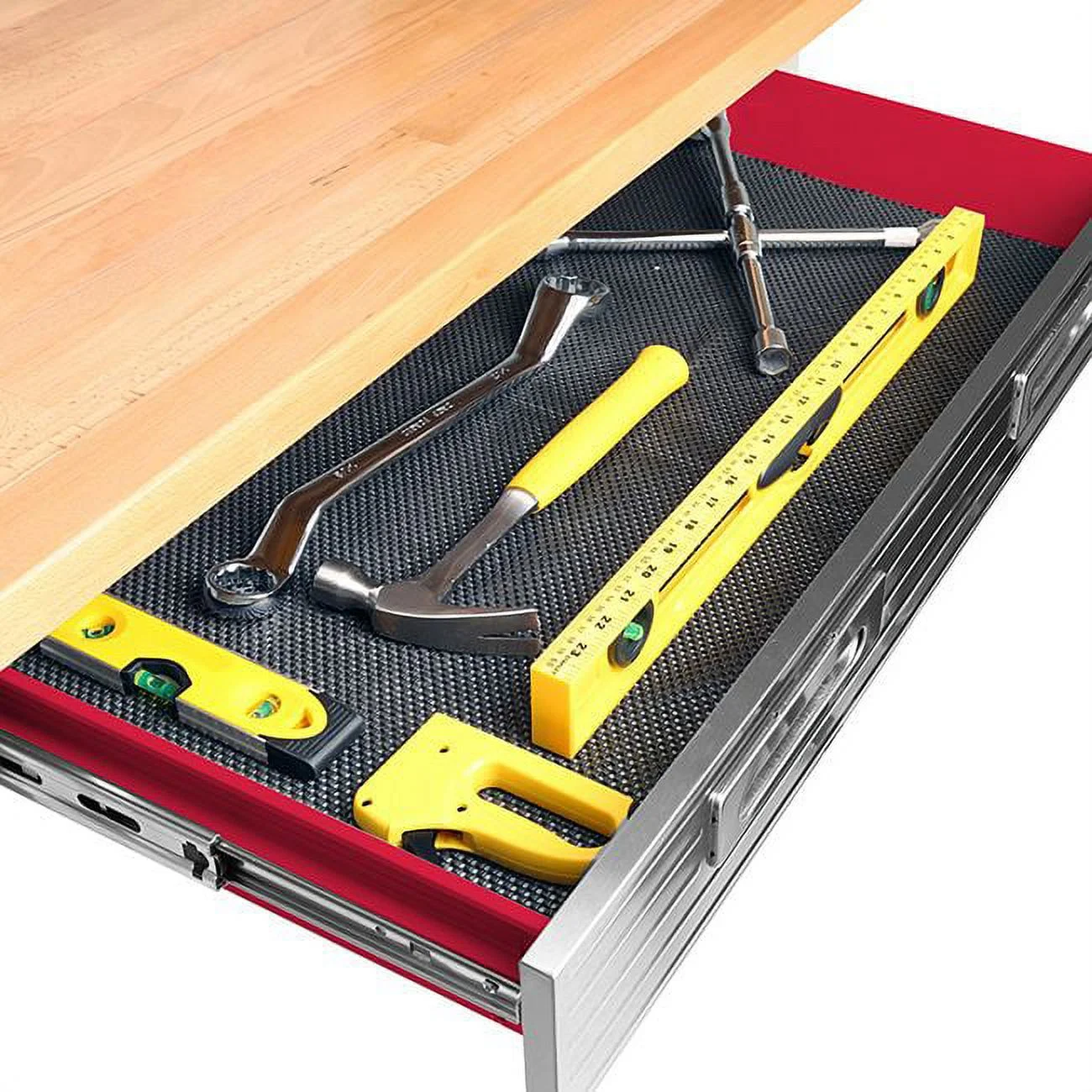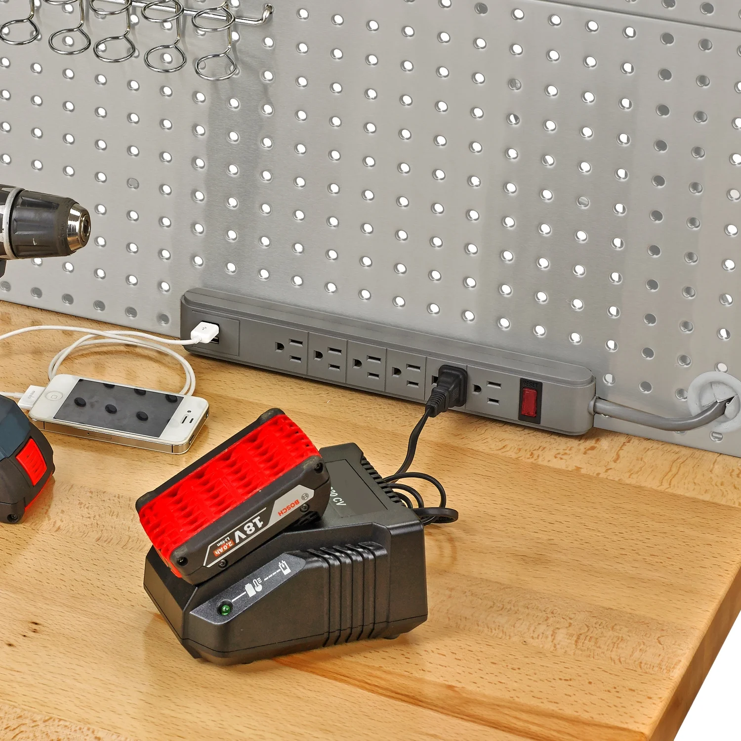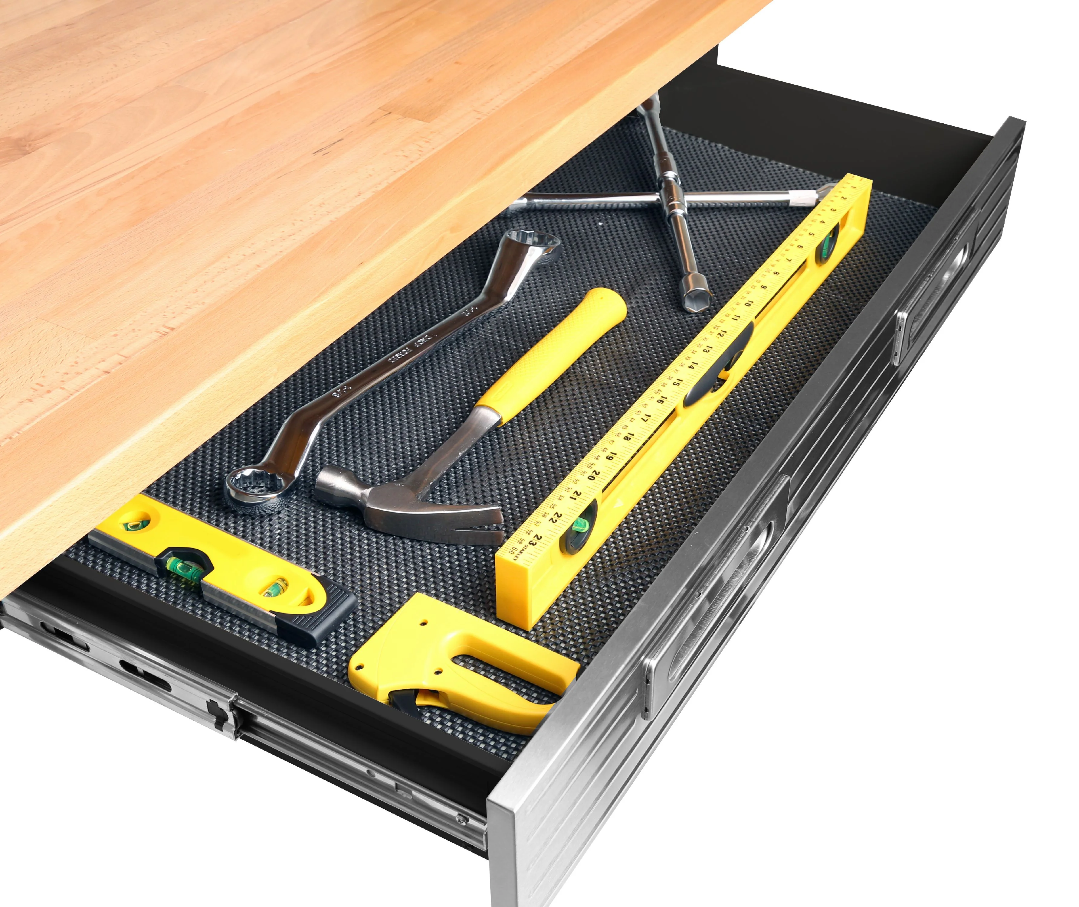 - Steel pegboard: 48" W x 24" D
