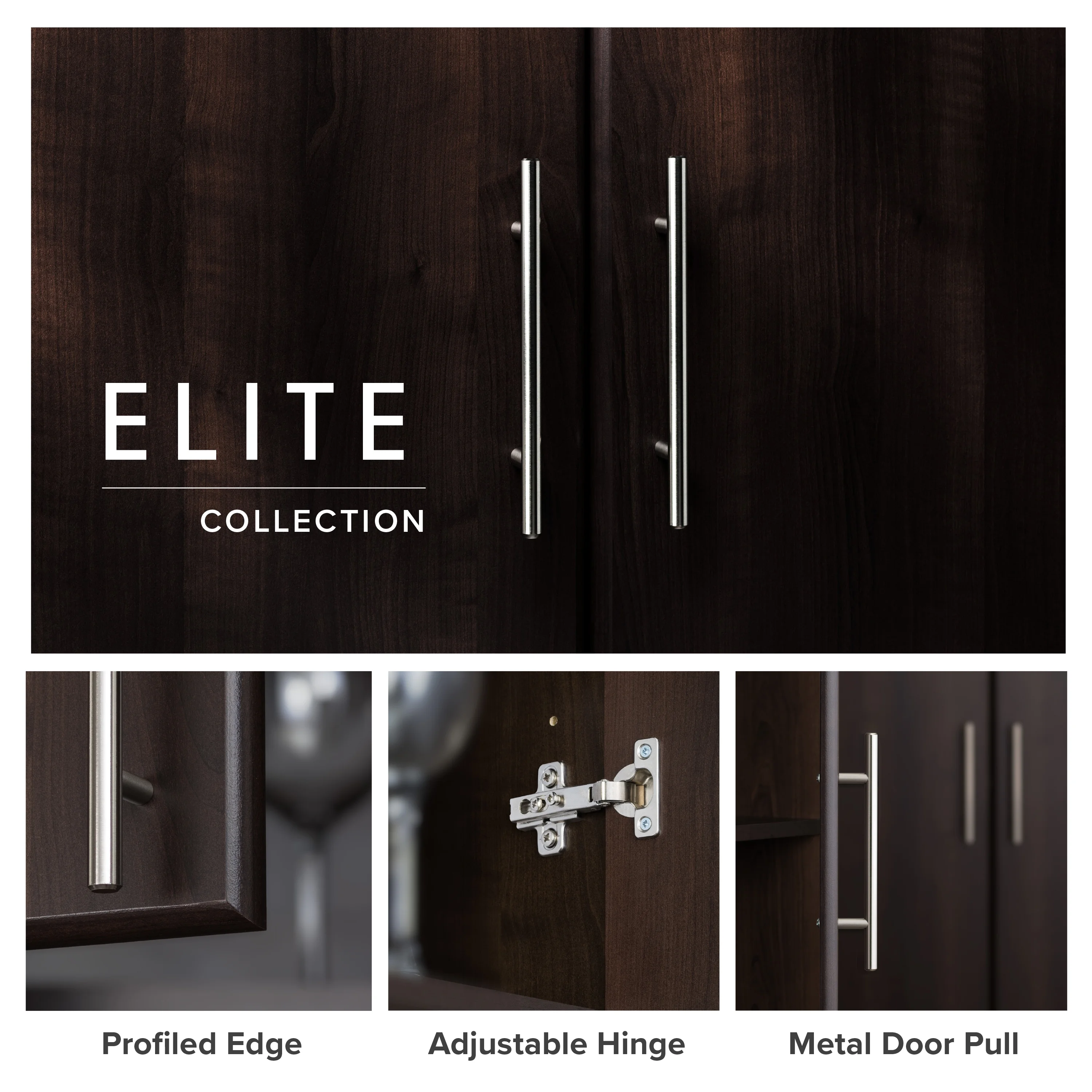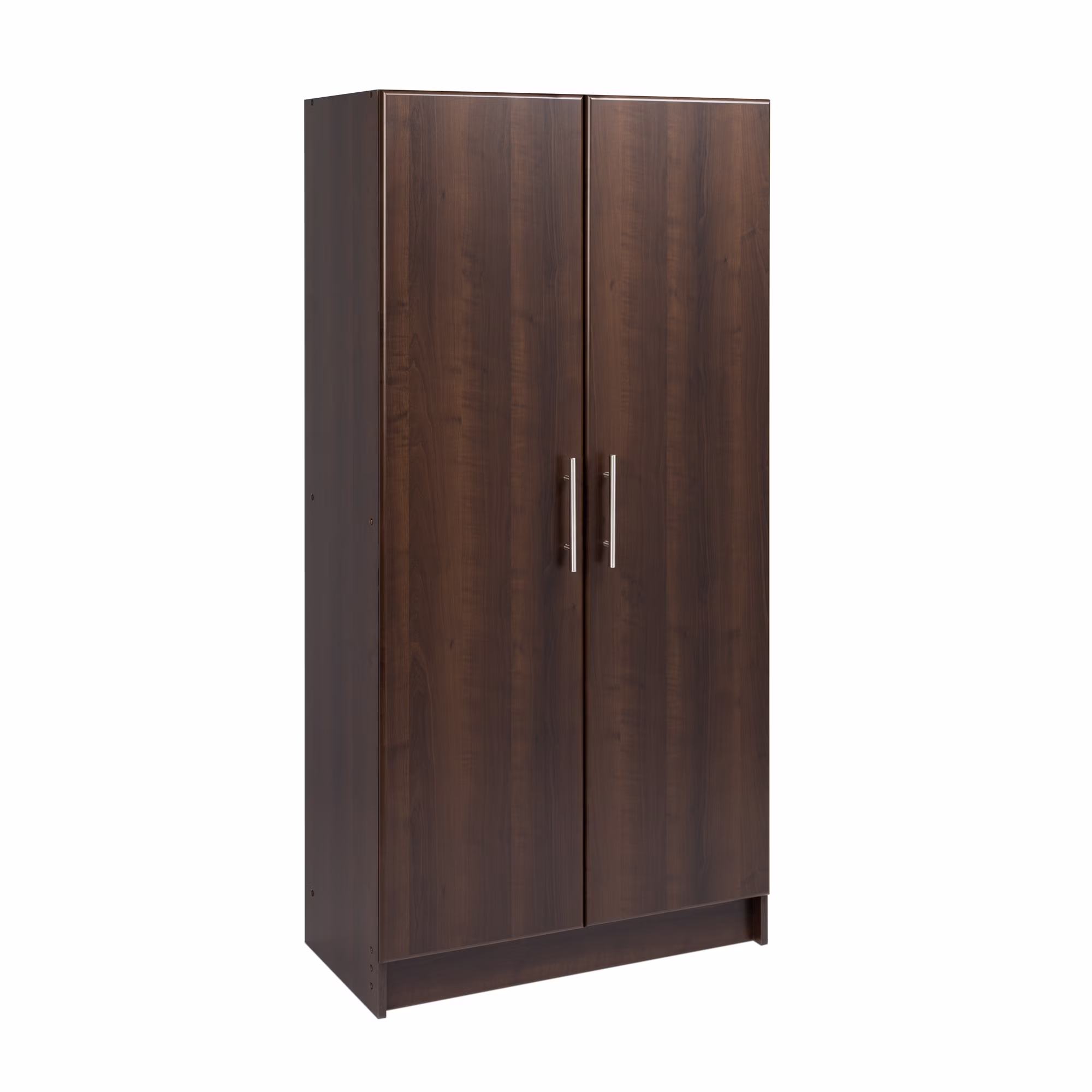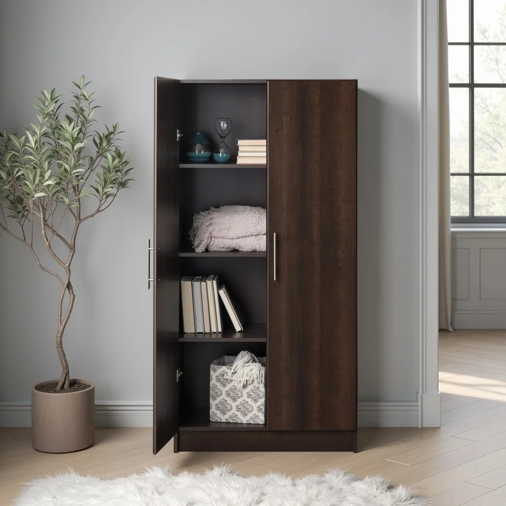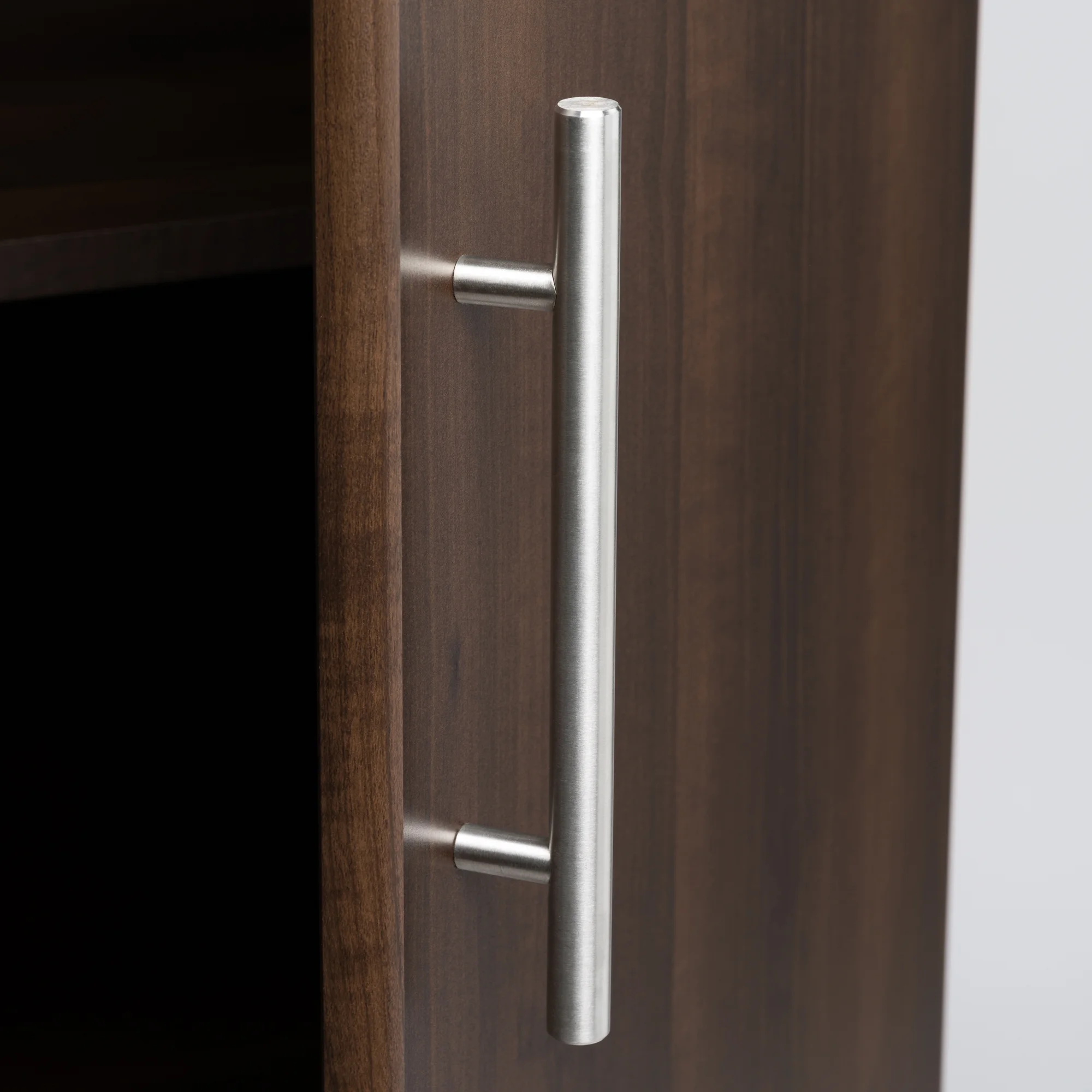 - HIGH-QUALITY BROWN STORAGE CABINET: This white storage cabinet with doors and shelves features a modern, sleek design with a espresso laminate finish and satin nickel-finished handles, enhancing the aesthetic of any room.