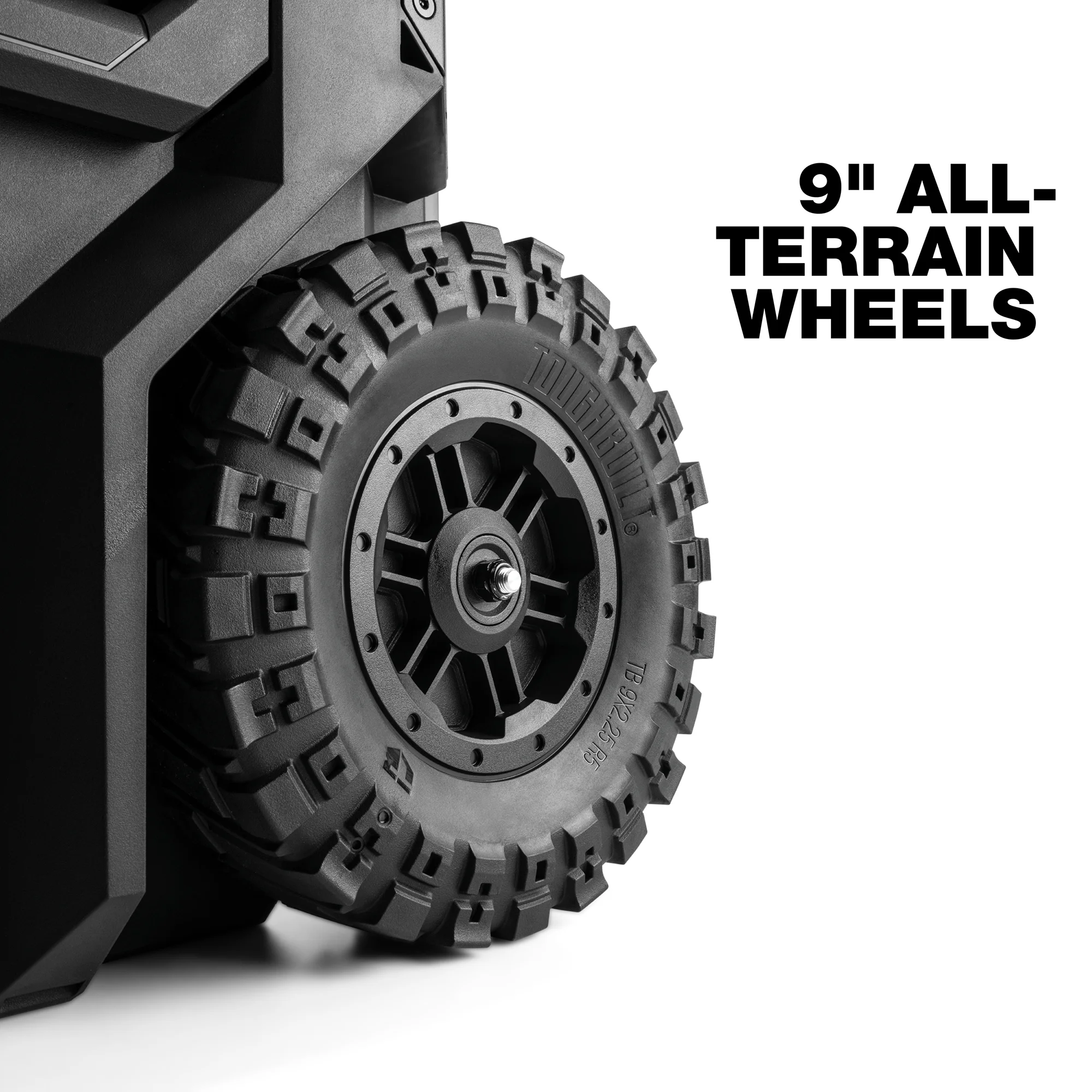 - 9-inch all terrain wheels help you easily travel over rough terrain, gravel, and uneven floors