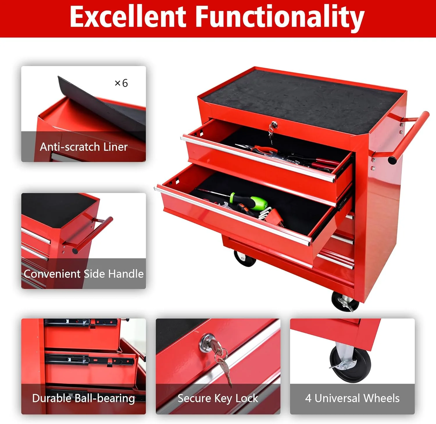 - Effortless Operation: Featuring ball-bearing drawers, this tool cart chest ensures smooth opening and closing, promoting work efficiency by facilitating quick access to tools without any hassle.