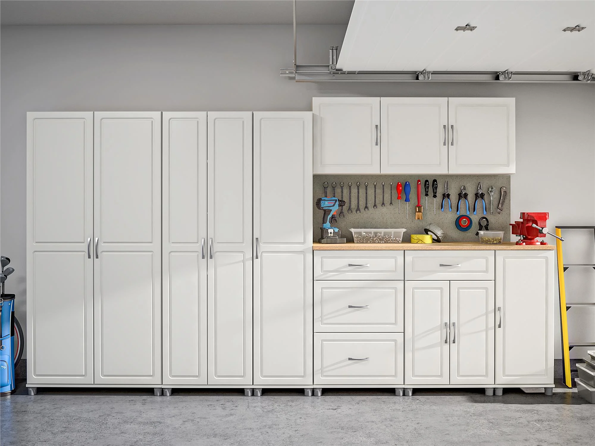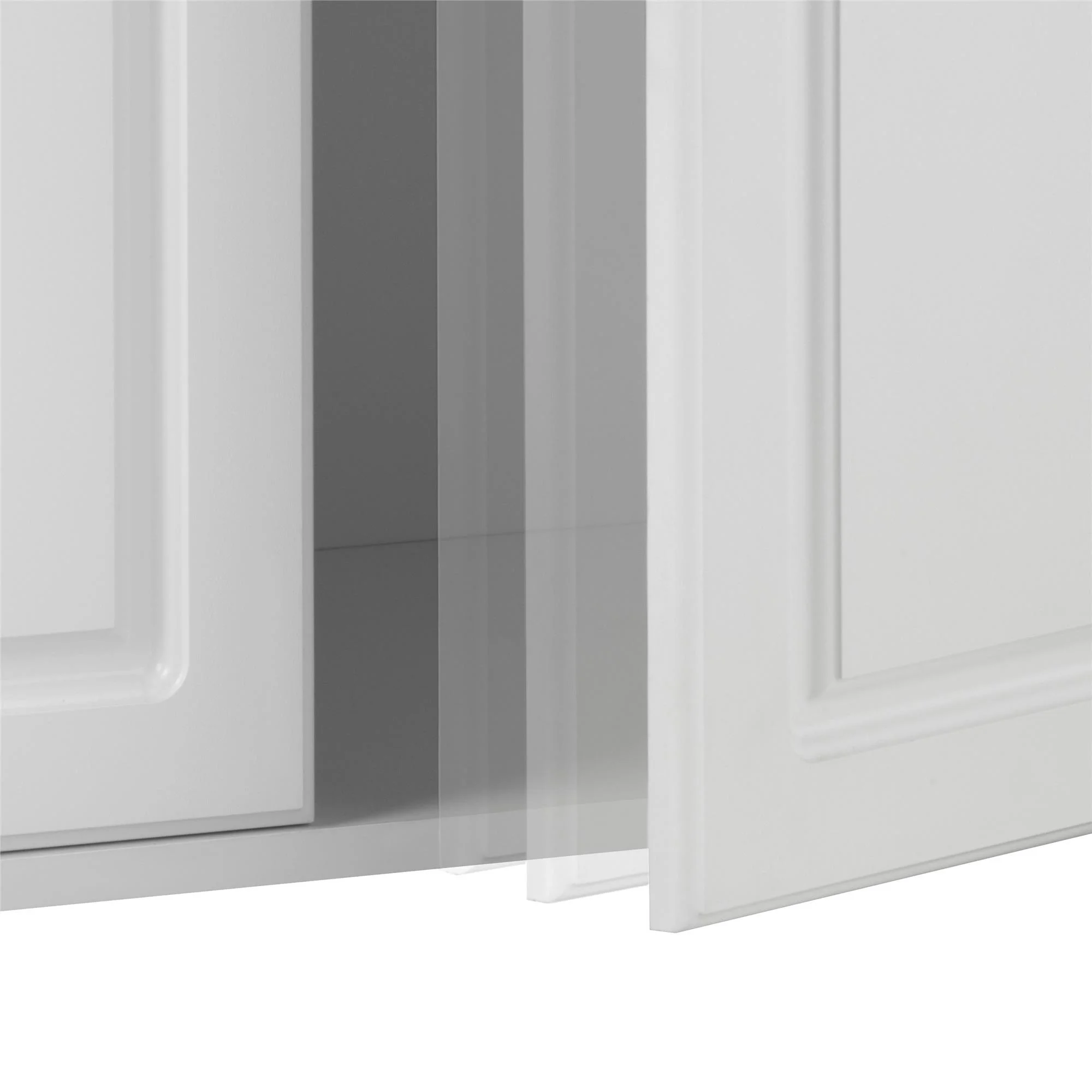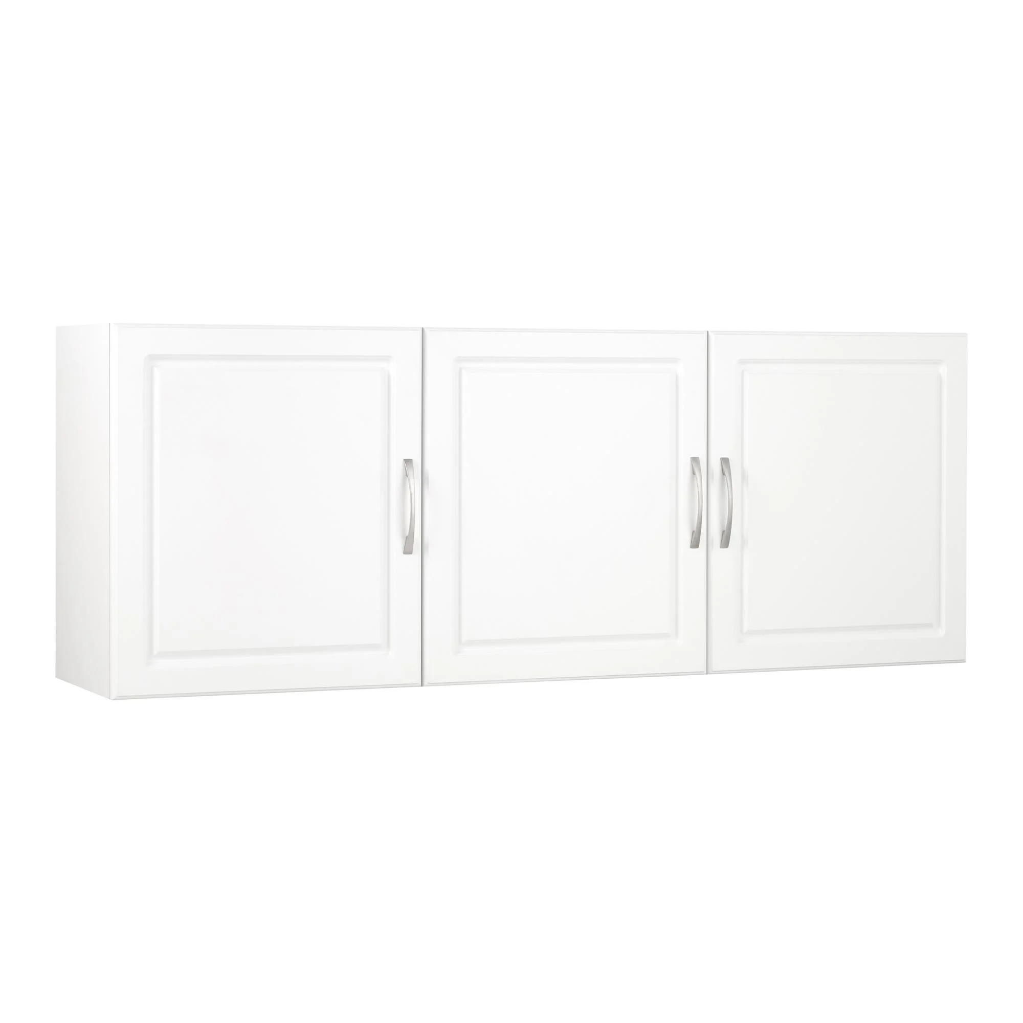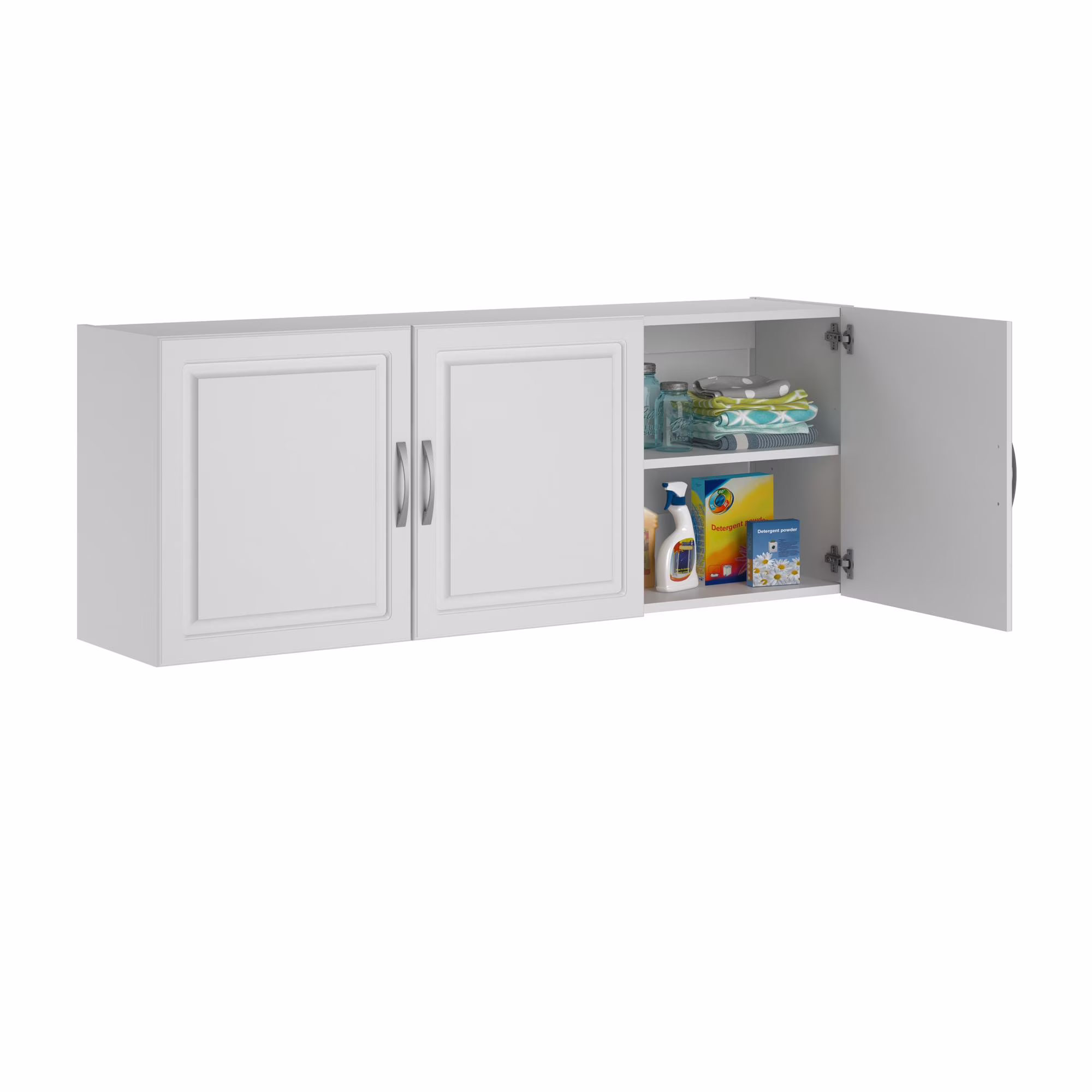 - Two shelves, 1 adjustable, behind the 3 doors provides optimal storage for cleaning supplies, office supplies, or crafting tools. EZ Hang system gives you a level and sturdy hang on the first try. Soft closing hinges prevent slamming doors