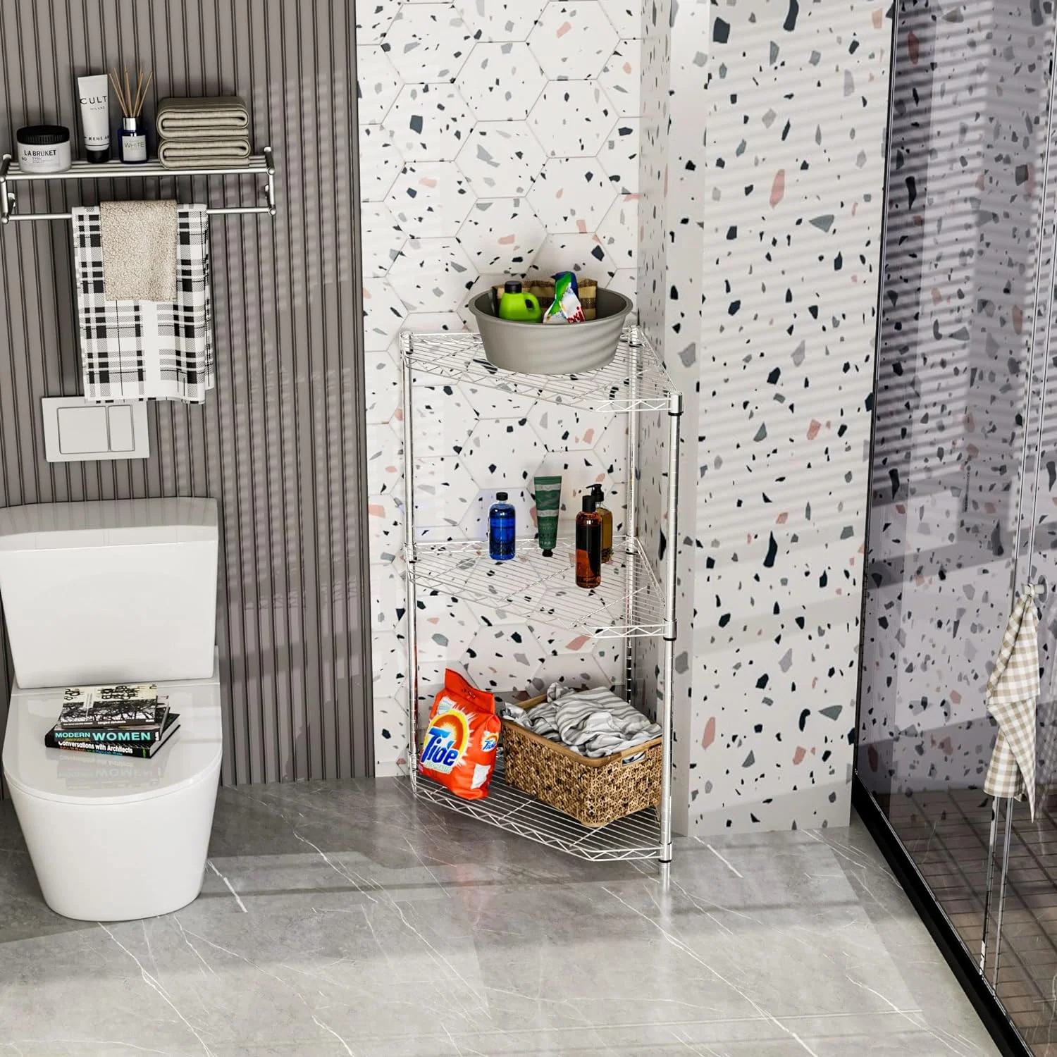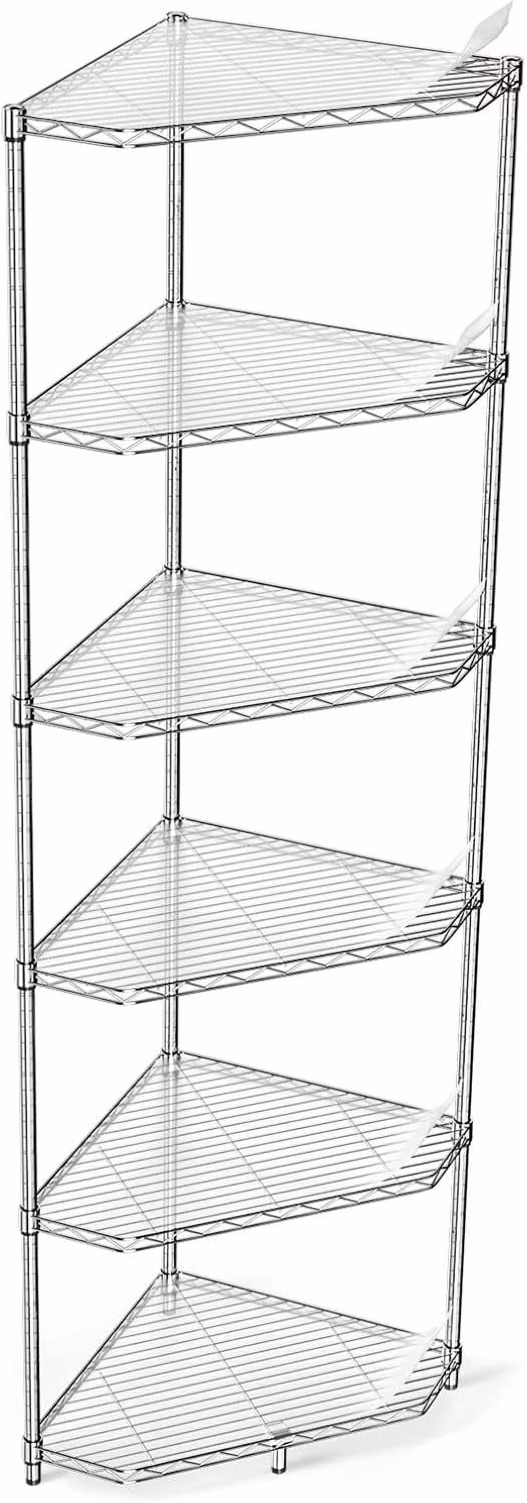 - [SUTABLE FOR INSTALLATION IN THE CORNER] - Our 6-tier pentagonal corner storage rack is very suitable for placing in the corner, especially for places where space is limited and requires large storage space. Simple modern design is well coordinated with any family and store decoration style. For example, bathroom, door, entrance, garage, kitchen, kitchen, laundry room, office or closet.