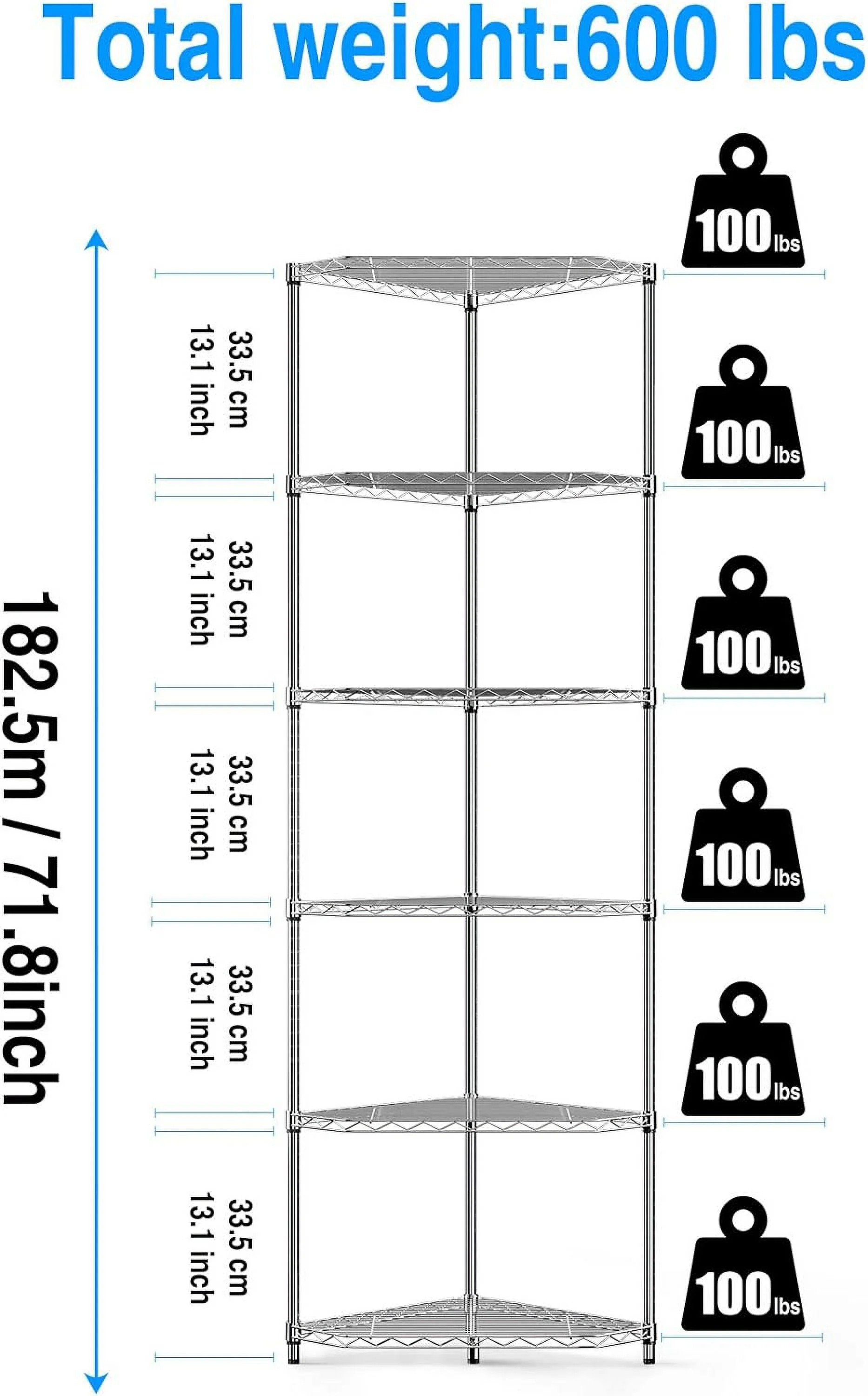 - [6 TIER LARGE CAPACITY] - Heavy duty shelving with leveling feet - each layer shelf can hold 100lbs (evenly distributed), maximum load capacity is 600 lbs. It is recommend that heavy items on the bottom shelf for maximum stability. Perfect for indoor, dry storage applications. Unique design makes this shelf perfect for a corner. 6 tier large capacity turns any corner into a functional use of space.