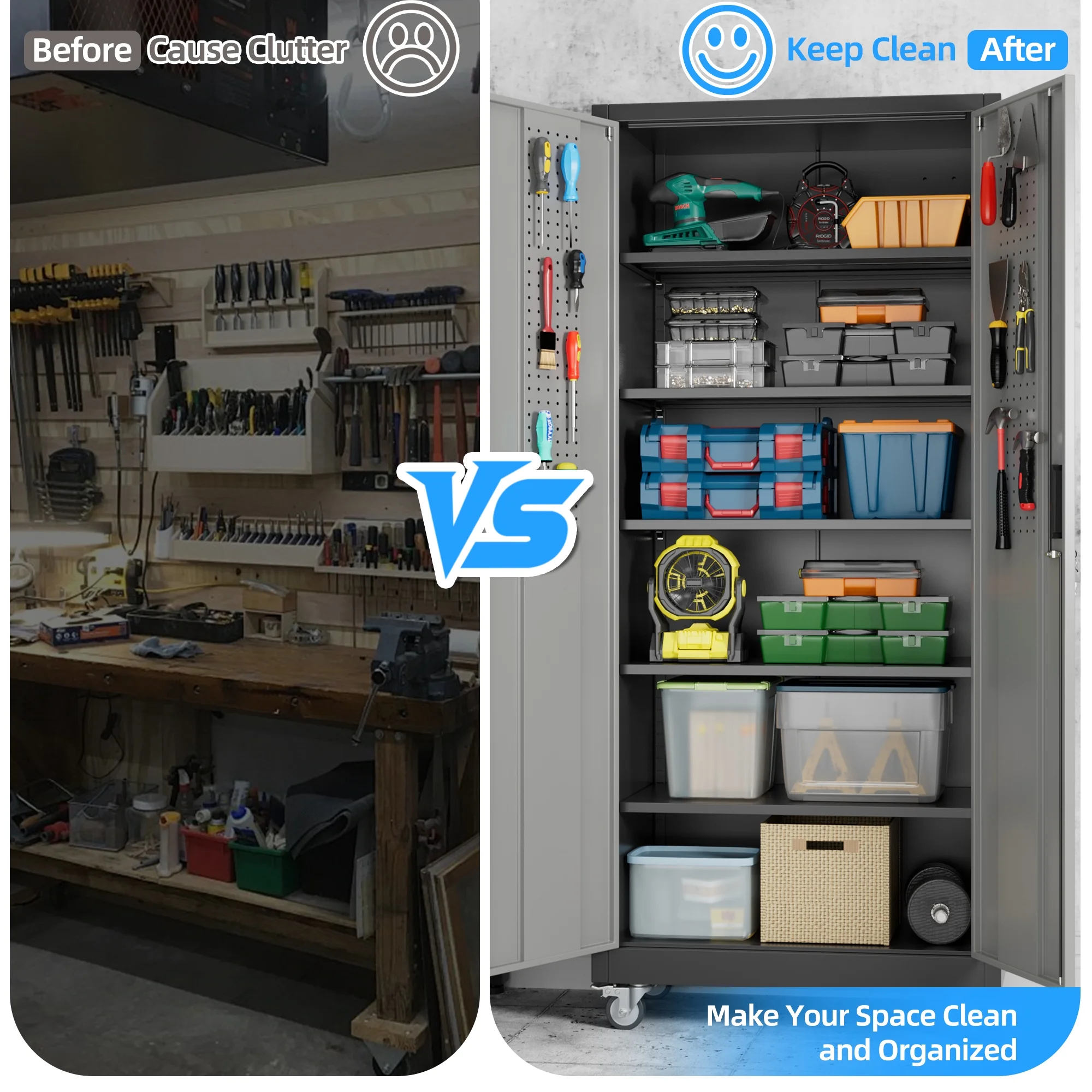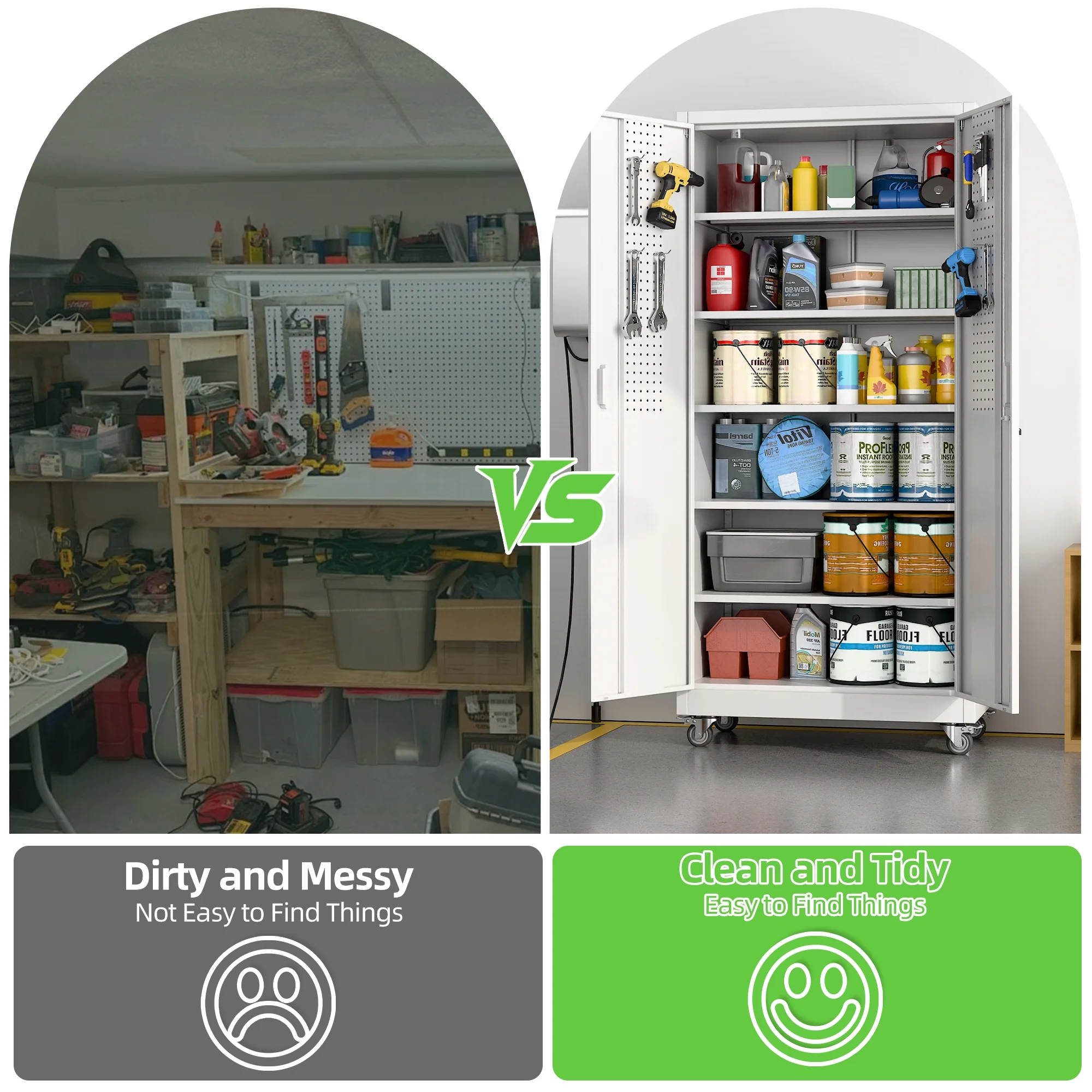 - ��Multipurpose��The metal cabinet is made of heavy steel plate, which has large load-bearing capacity, so you can use it in garage. The storage cabinet with a secure locking system, so it��s perfect for storing valuables or important documents. As a result, the metal storage cabinet can be used in offices, kitchens, garages, classrooms, living room, basement, etc.