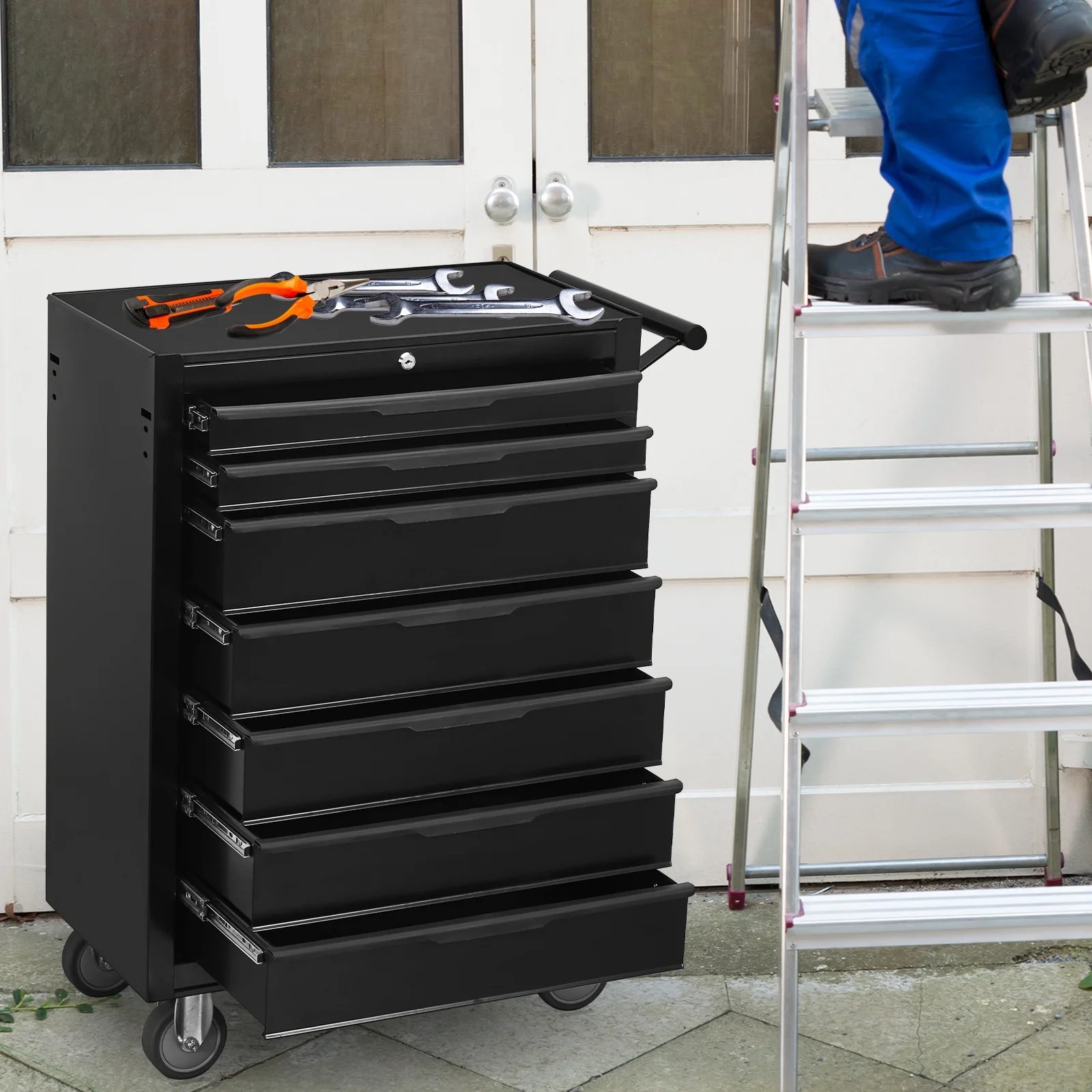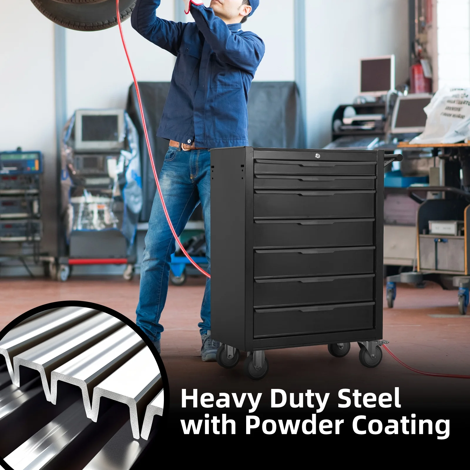 7 - Drawer Rolling Tool Chest Cabinet, Large Capacity Metal Tool Box with Wheels and Cylinder Locking, Roll Around Storage Organizer Tool Cart for Garage, Warehouse, Work Shop - Black