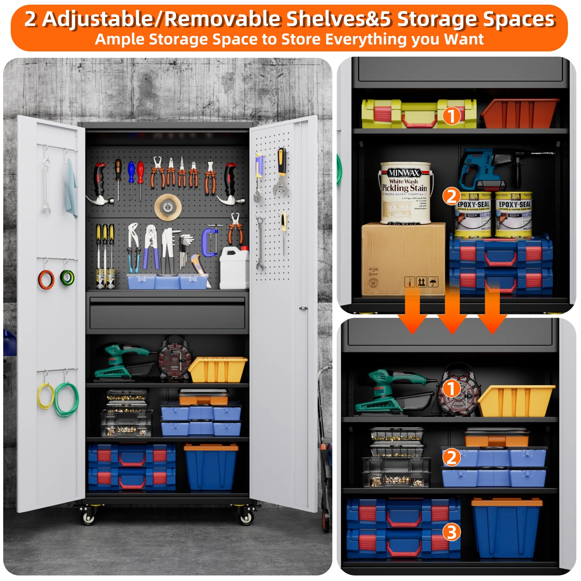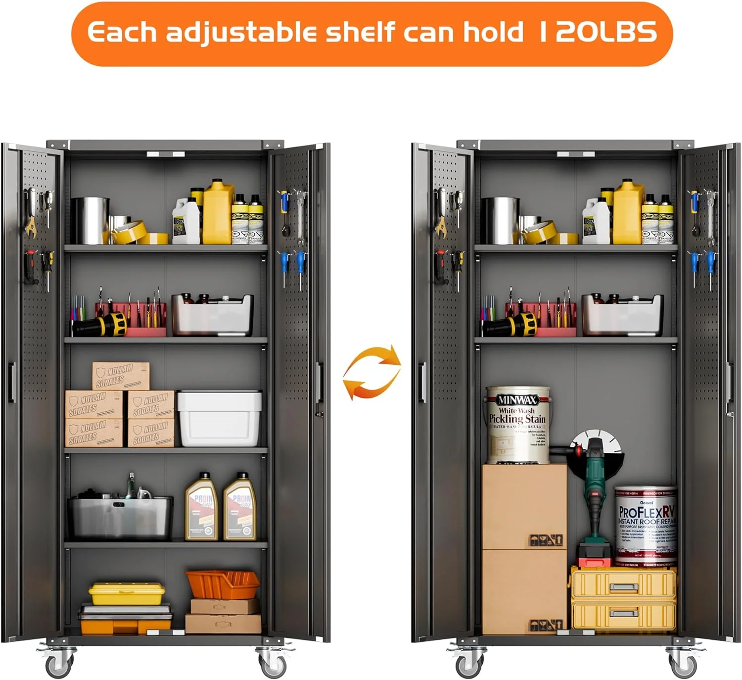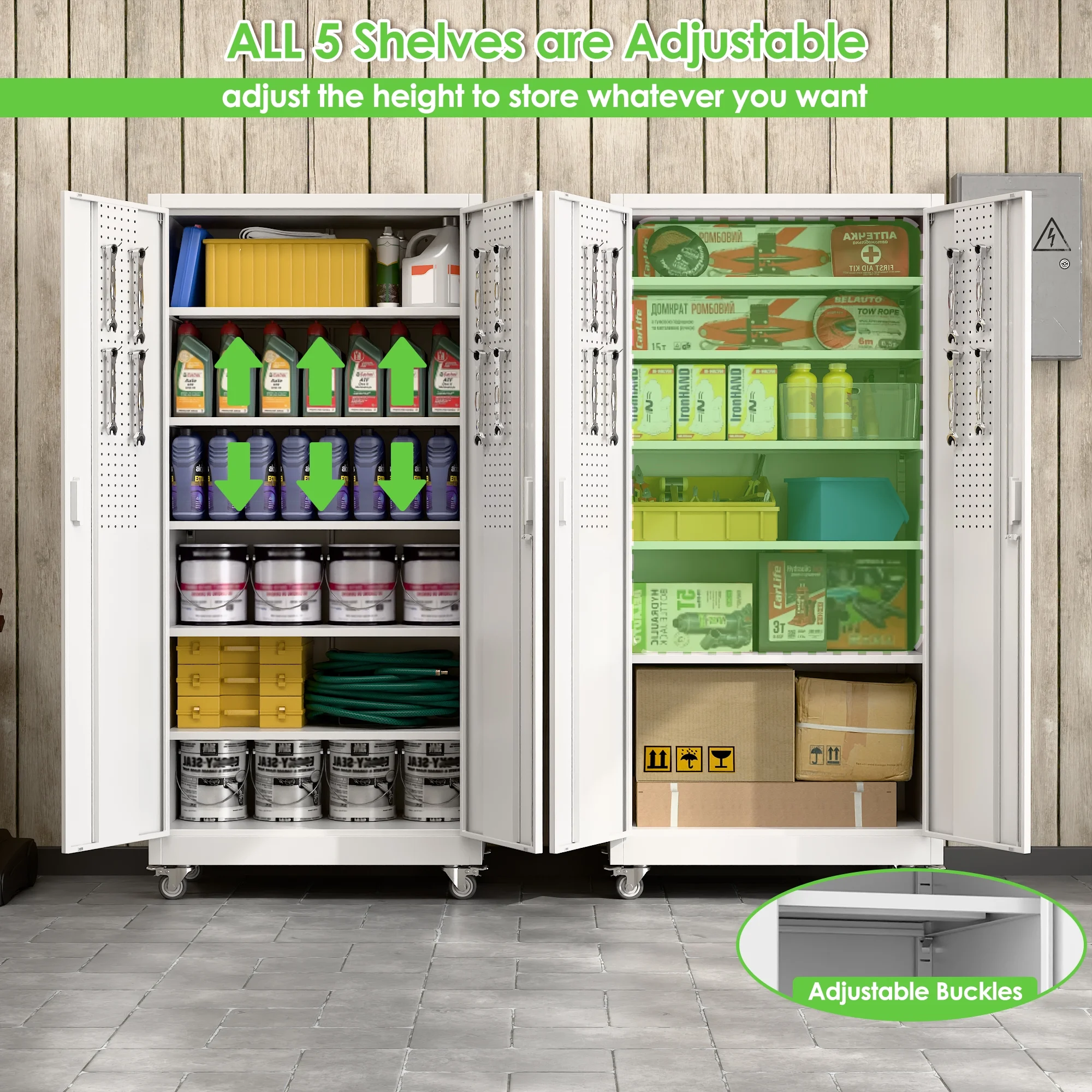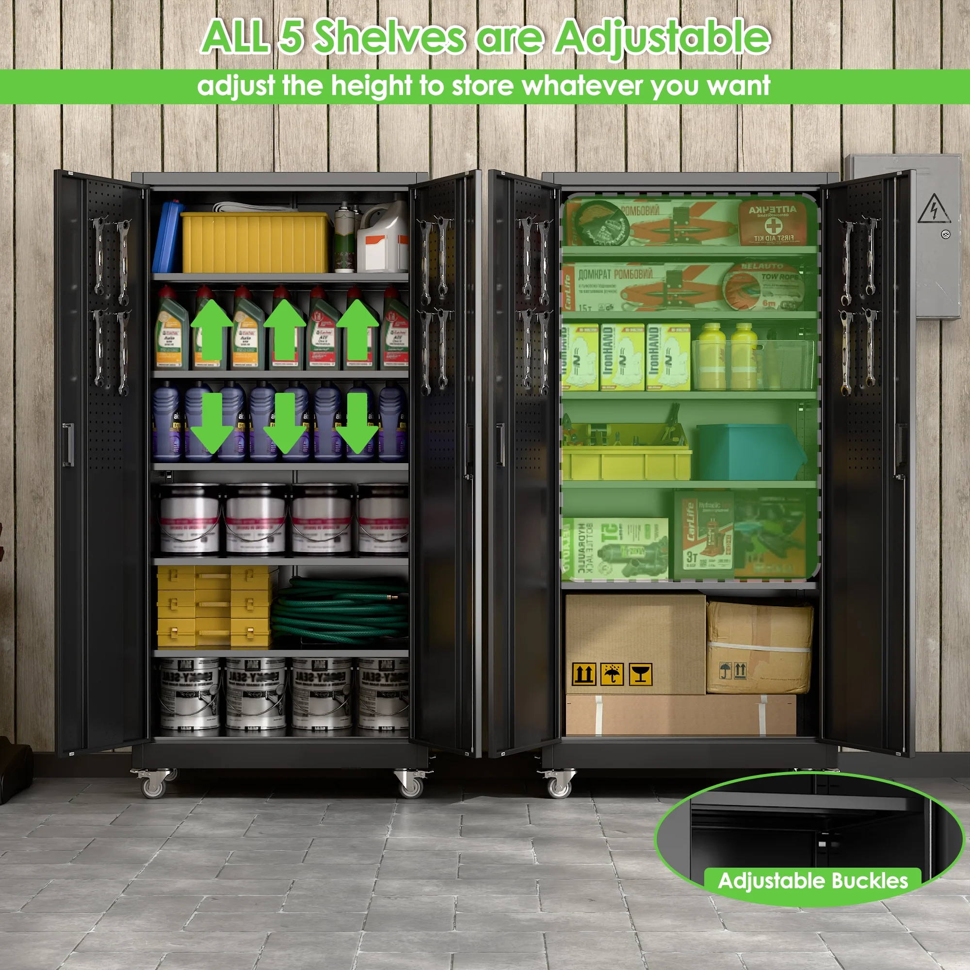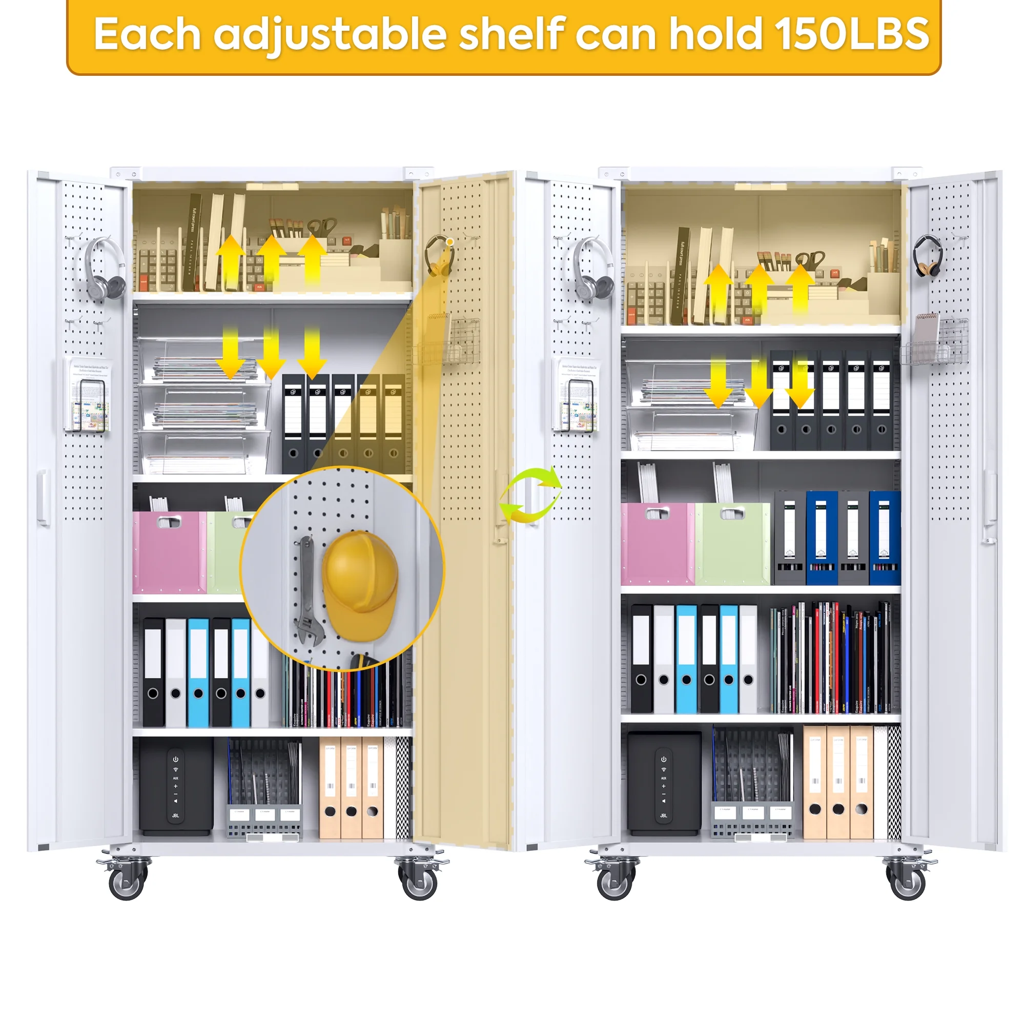 - ��Adjustable Shelves&Large Weight Capacity��The metal storage cabinet with wheels has 5 adjustable and removable shelves, which can offer you flexible space. Each shelf of the storage cabinet on wheels can hold up to 120lbs. you can add lighting by yourself on top of the cabinet if it was dark where you keep it.