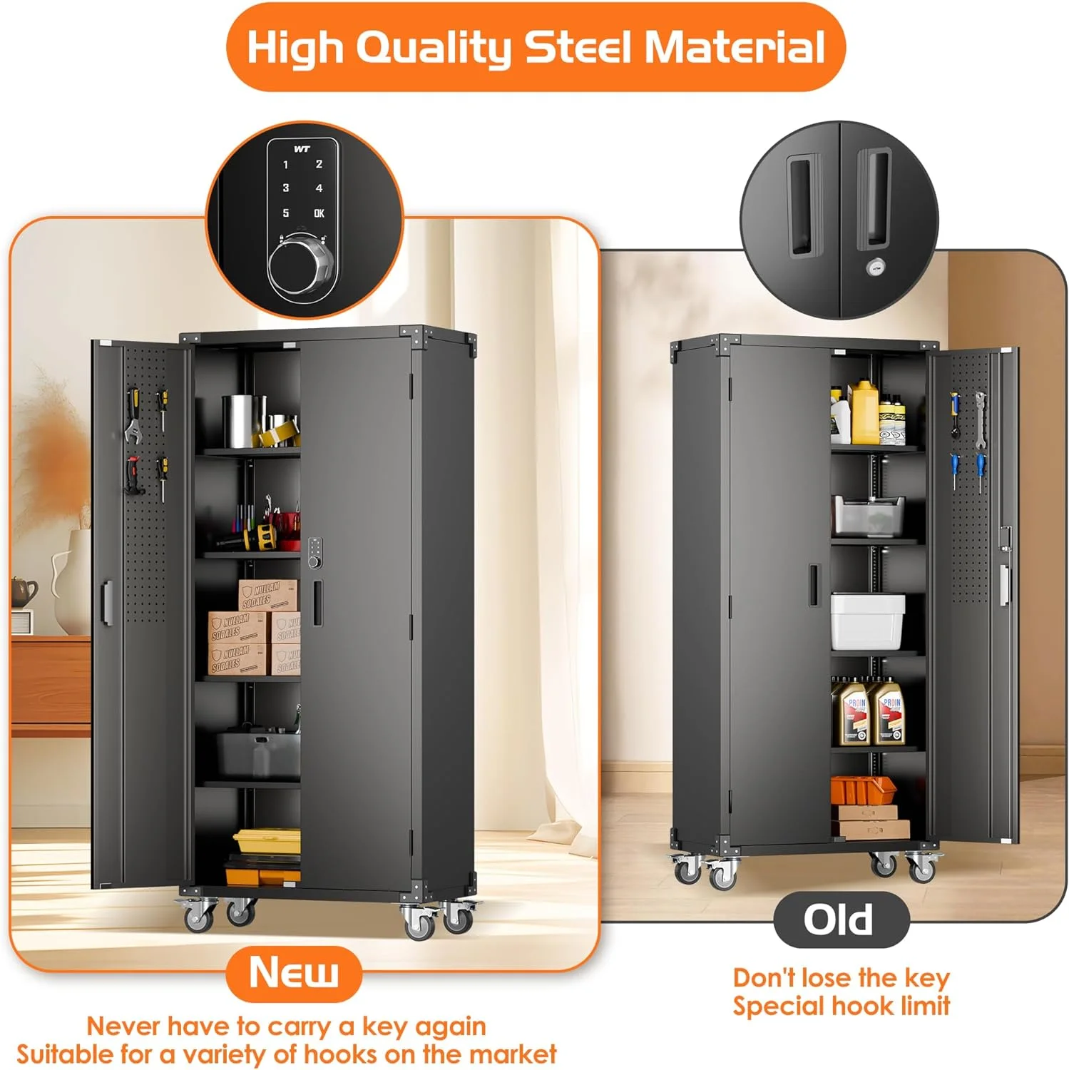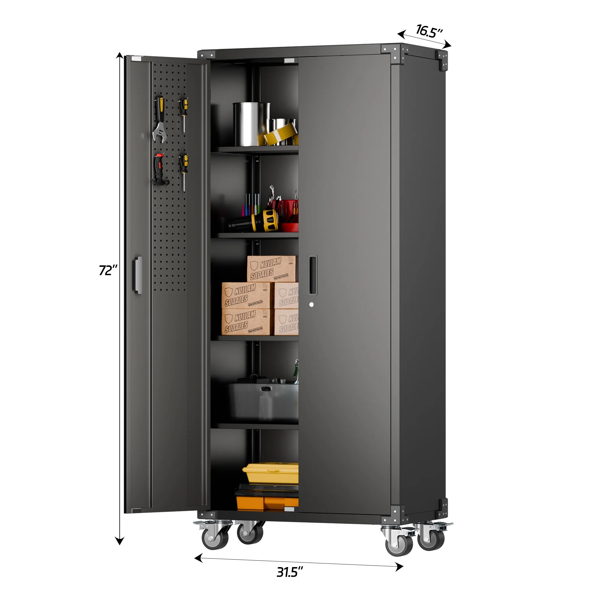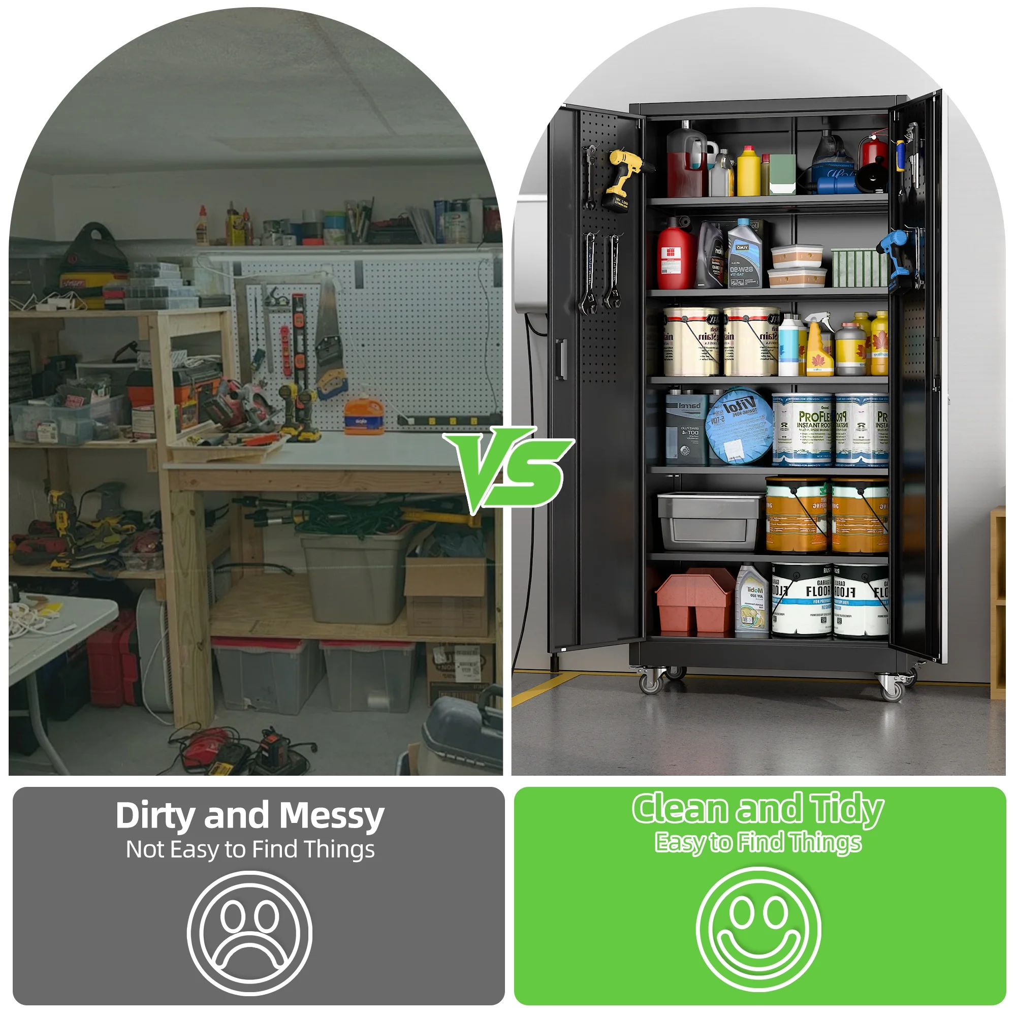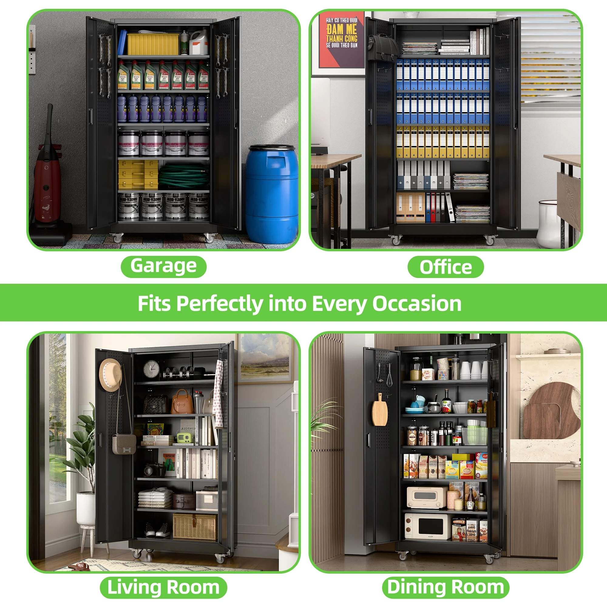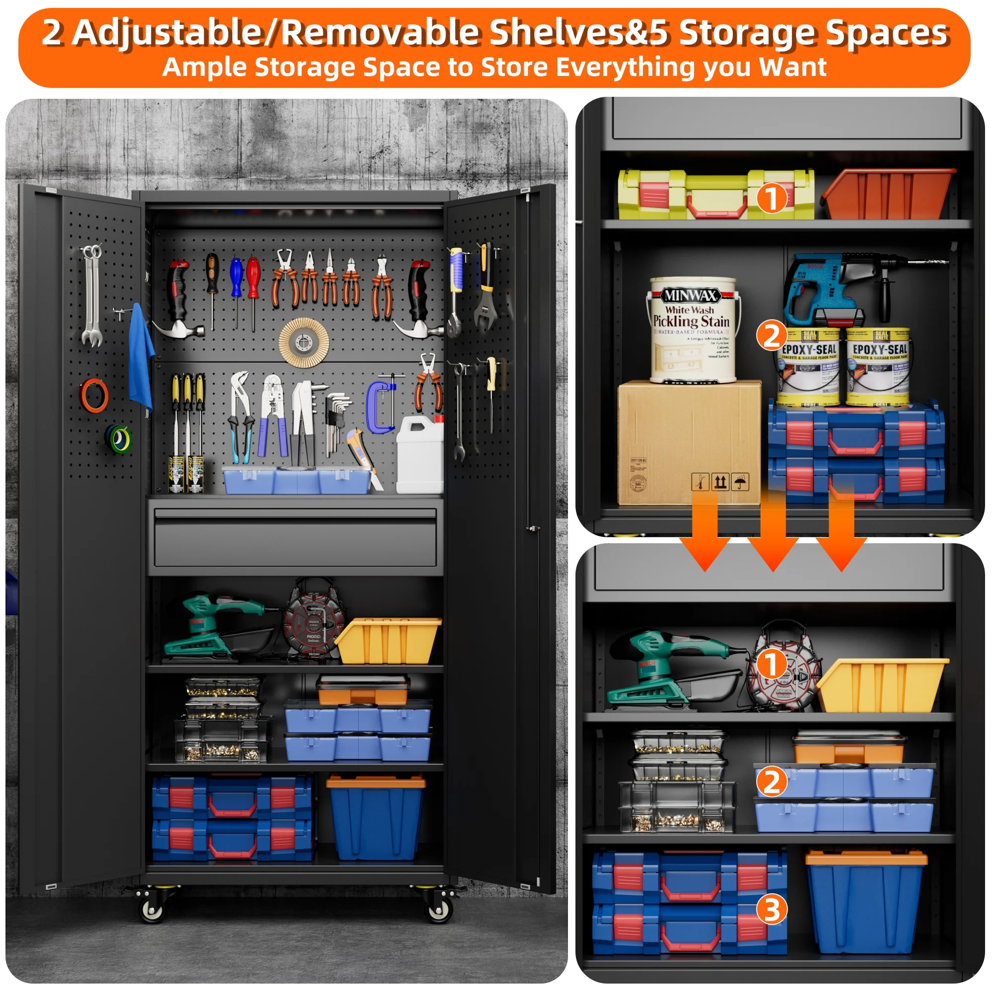 - ��Adjustable Shelves&Large Weight Capacity��The metal storage cabinet with wheels has 5 adjustable and removable shelves, which can offer you flexible space. Each shelf of the storage cabinet on wheels can hold up to 120lbs. you can add lighting by yourself on top of the cabinet if it was dark where you keep it.
