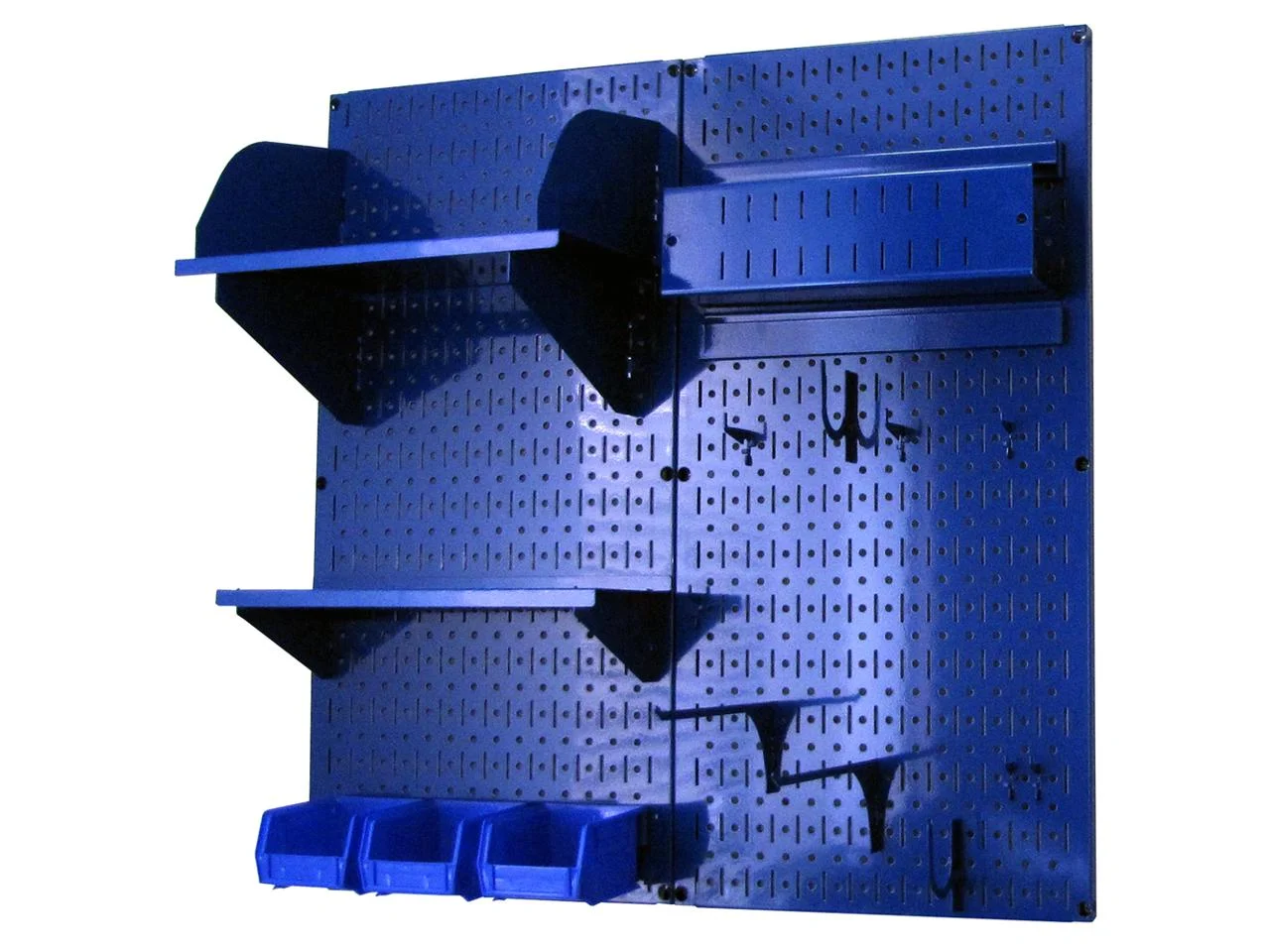 This chic and modern Wall Control Pegboard Hobby Craft Pegboard Organizer Storage Kit for crafting pegboard organization offers maximum tool board storage versatility. The two 16in x 32in powder-coated metal pegboard panels combine for a total tool storage area of 32in x 32in, or over 7 Square Feet of pegboard storage space. These Metal Pegboard Panels are not only attractive but strong due to their 20 gauge steel construction which makes them over 10 times stronger than conventional pegboard creating a durable craft storage solution that will last a lifetime. The Wall Control metal pegboard panels offer both slots and holes to accept slotted tool board accessories as well as conventional 1/4in peg board hooks making this pegboard extremely versatile by offering the user multiple options with toolboard and pegboard accessory selection. The patented engagement of the slotted tool board hooks included improves hook security for more hassle free craft tool storage. These versatile, durable, and high strength metal pegboard panels are an easy-to-use tool storage solution for any hobby and craft room, garage, or workshop. The powder-coated metal pegboard panels are easy to install into studs or flat surfaces with pre-drilled mounting holes which allows for installation in a matter of minutes. A built-in frame return flange provides ample hook clearance and full access to all holes without requiring additional framework or using up pegboard holes for mounting. Mounting hardware is also included. The Metal Pegboard Hobby Craft Pegboard Organizer Storage Kit Includes: (2) Blue Metal Pegboard Tool Boards 32in Tall x 16in Wide (covers 32in x 32in Total) (1) 9in Shelf Assembly with Shelf Dividers (1) 6in Shelf Assembly (1) Spray Can Holder Assembly (holds 4 cans) (3) Plastic Bins with Bin Hanger (10) Assorted Hooks and Brackets. Slotted Toolboard Accessories are in Blue. Tools and Tool Sets Not Included.Modern Crafting Pegboard Accepts Wall Control Slotted Accessories, Chic Pegboard Accepts 1/4in Pegboard Pegs, Trendy Pegboard Accepts Magnets 10 Times Stronger Than Conventional Pegboard, Eclectic Pegboard Craft Organizer, Easy to Install Pegboard