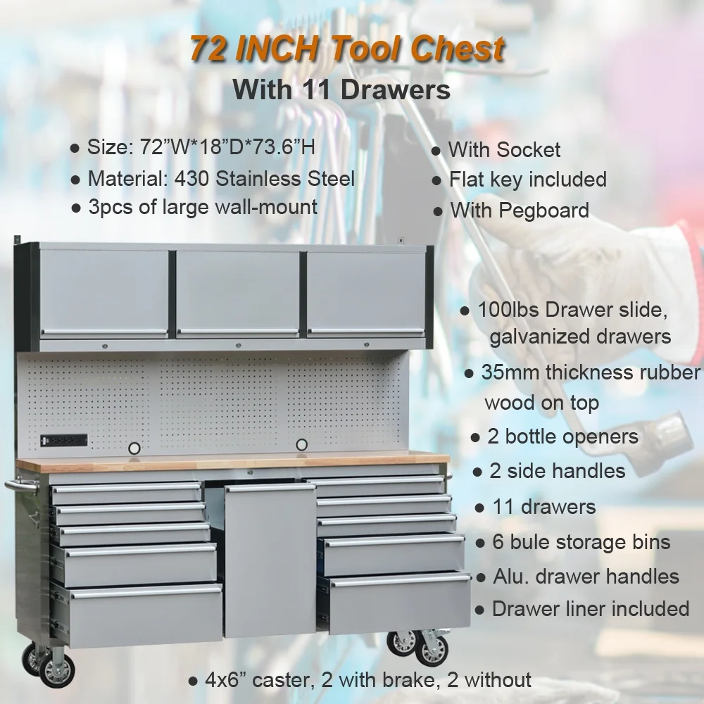 - [Formidable Storage Capacity] - Optimize your workspace with our 72-Inch Tool Chest, a pinnacle of organization. Boasting 11 drawers, 3 upper cabinets, a pegboard and 6 blue storage bins, it ensures seamless access to your tools. Embrace efficiency with our 72-Inch Tool Chest - say goodbye to the frustration of misplaced tools during critical moments.