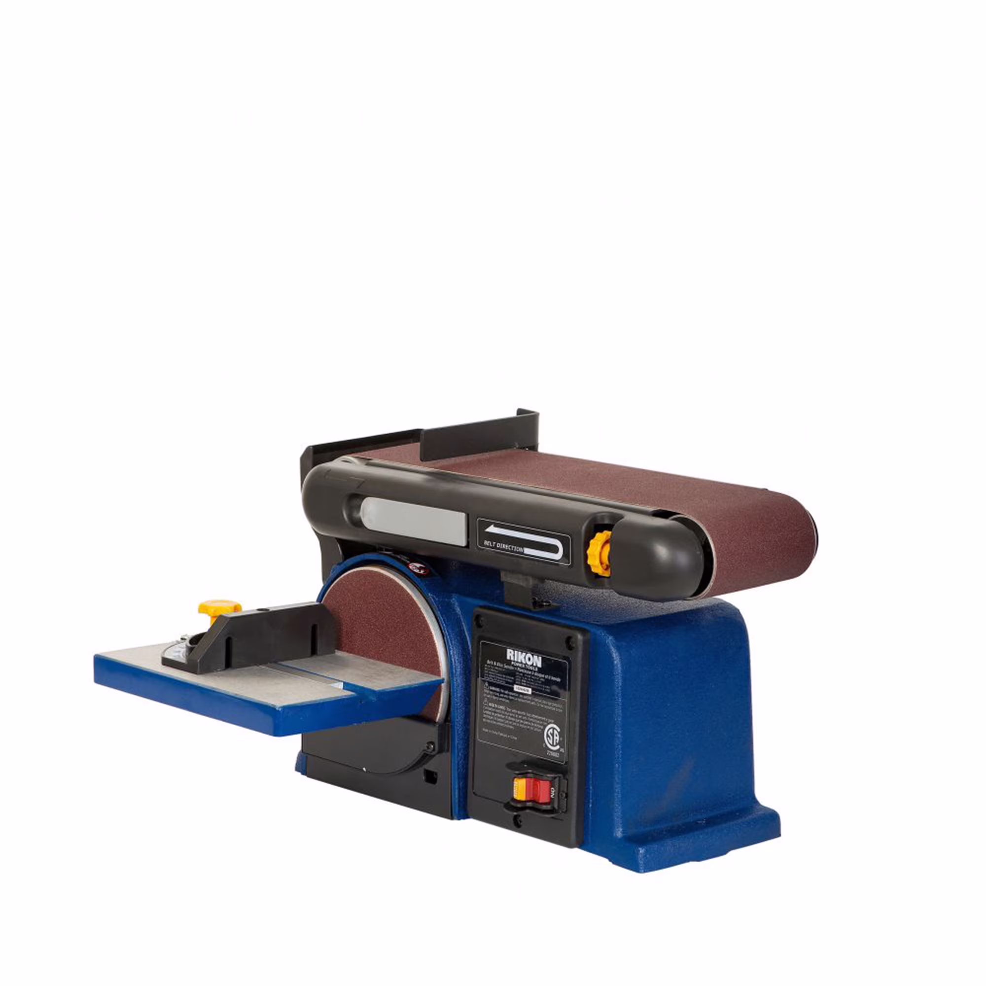 4 In. x 36 In. belt / 6 In. disc sander #50-112 is the preferred style of machine where the majority of sanding would be done on the wide abrasive belt. Belt frame adjusts in any position from horizontal to vertical to meet your sanding needs. The belt��s support fence can be removed for full access to the whole length of the belt, and with the sanding disc positioned below the belt, it will not interfere with belt sanding of wide projects that overhang the frame. Machine features heavy cast iron base, quick release belt lever, and handy sanding disc with tilting table for fine, detail work.Rikon 50-112 4" x 36" Sander