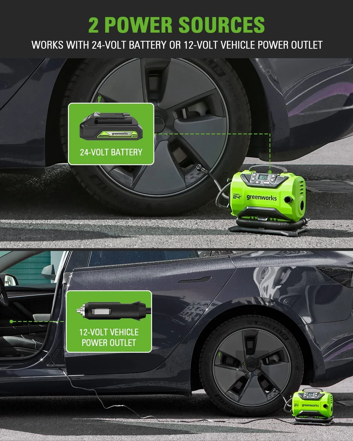 - 2 Power Sources - Works with 24-volt rechargeable battery or 12-volt vehicle power outlet to meet your daily use. Cordless or corded is all as your wish