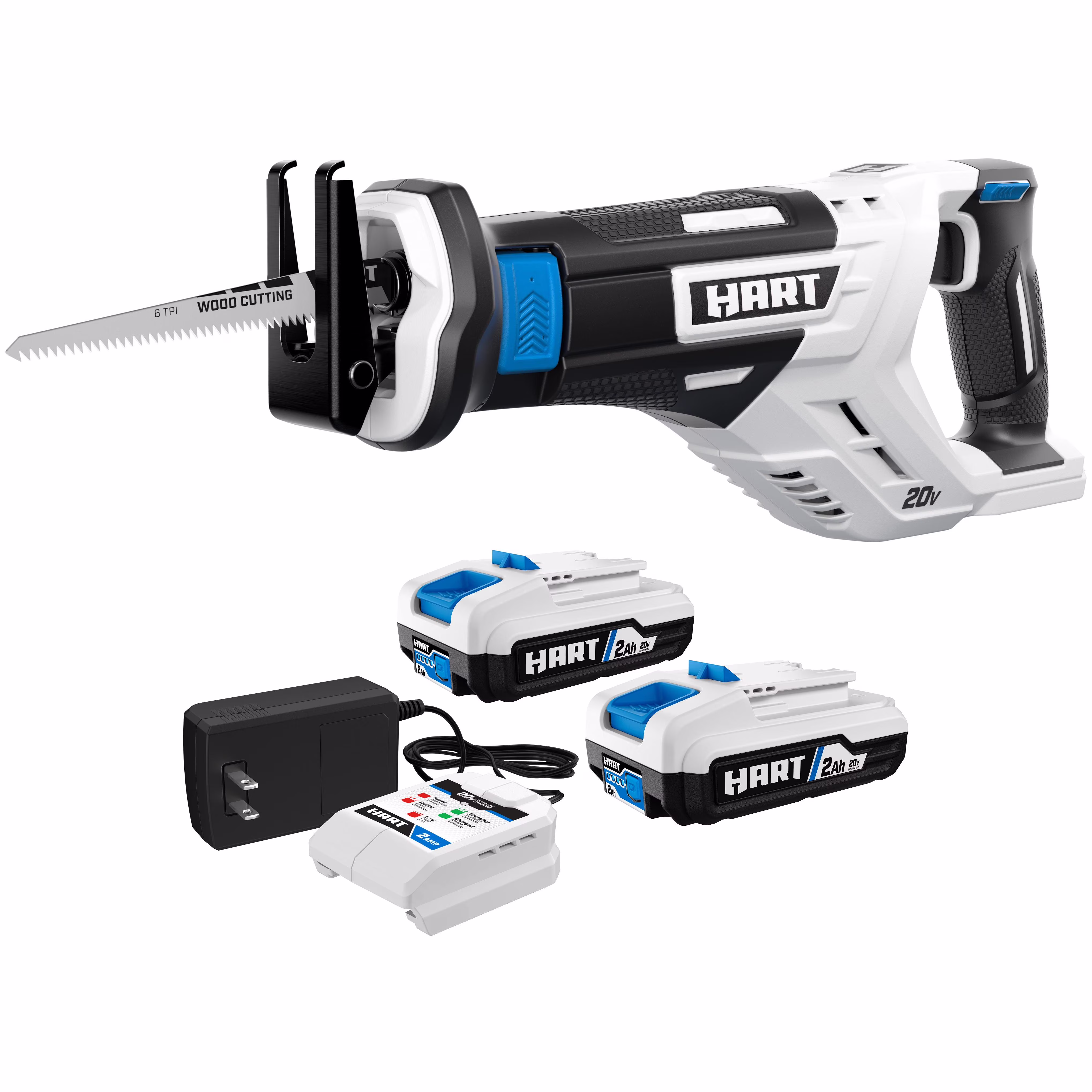- Includes: (1) 20V Reciprocating Saw, (2) 2.0Ah Lithium-Ion Batteries, (1) 20V Fast Charger, (1) Wood Blade, and (1) Operator's Manual