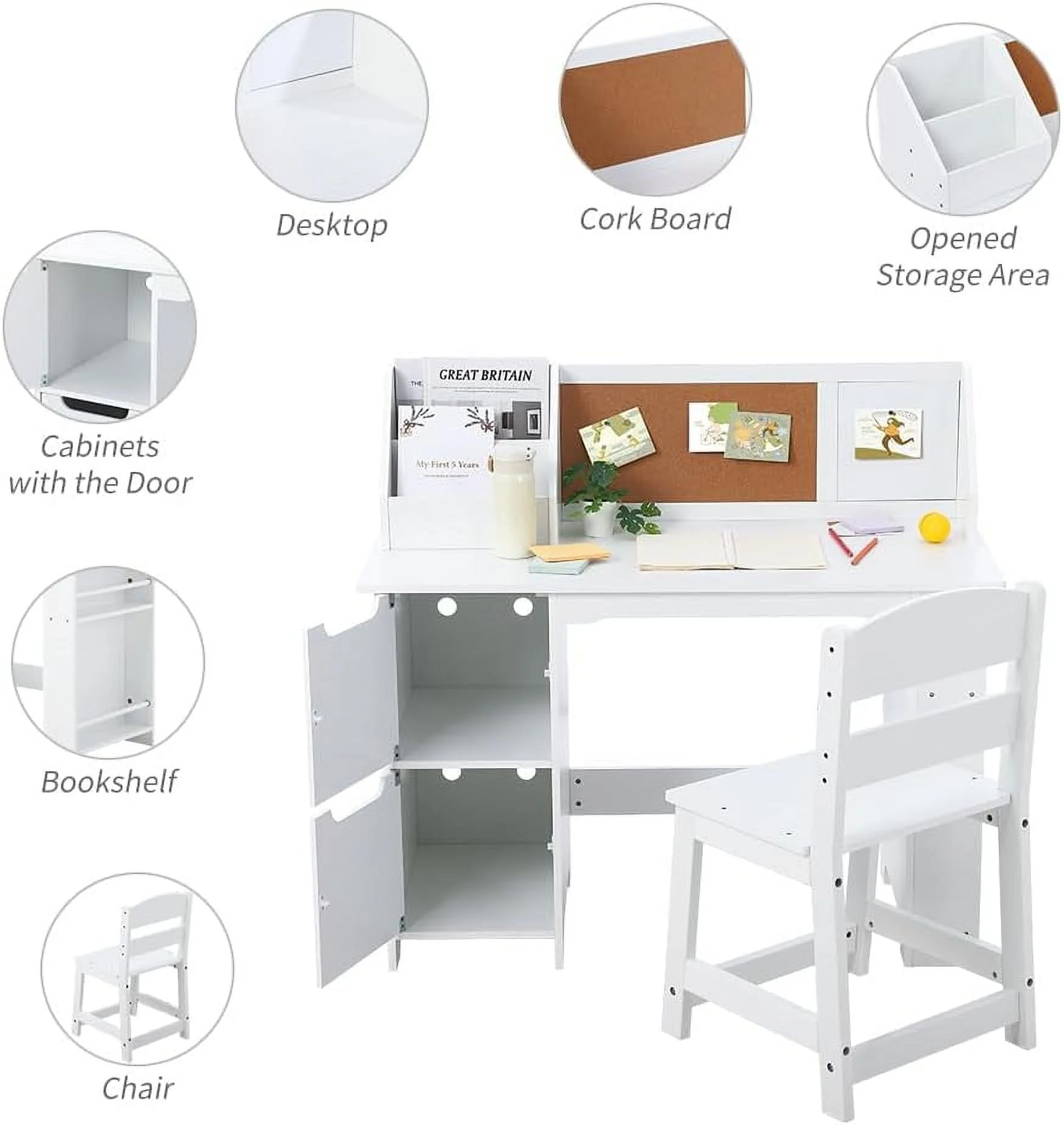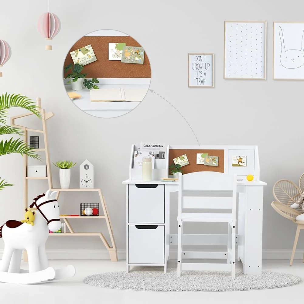 - AMPLE STORAGE CAPACITY: The study table set offers generous storage space, featuring open storage, bookshelves, cabinets, and cork boards. Children can neatly organize and store personal items such as alarm clocks, mini plants, dolls, and books, helping parents keep their rooms tidy