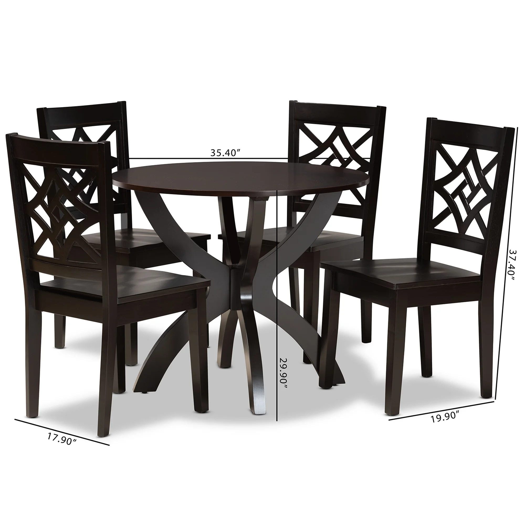 ? Set includes four (4) dining chairs and one (1) table ? Constructed from oak wood, rubberwood, and engineered wood ? Dark brown finish ? Smooth scoop seat ? Cut-out back design ? Circular tabletop ? Assembly required ? Product Weight: 92.5 Pound ? Package Weight: 101.7 Pound ? Table Dimensions: 29.9" high x 35.4" wide x 35.4" deep; Legs: 29.1" high; Chair Dimensions: 37.4" High x 17.9" Wide x 19.9" Deep; Seating Dimensions: 17.70" High (from floor) x 17.9" Wide x 15.7" Deep; Back: 19.7" High; Legs: 16.90" High; ? Product Color: Dark Brown ? Product Composition: Oak/MDF/Rubberwood🔥Today's Deal