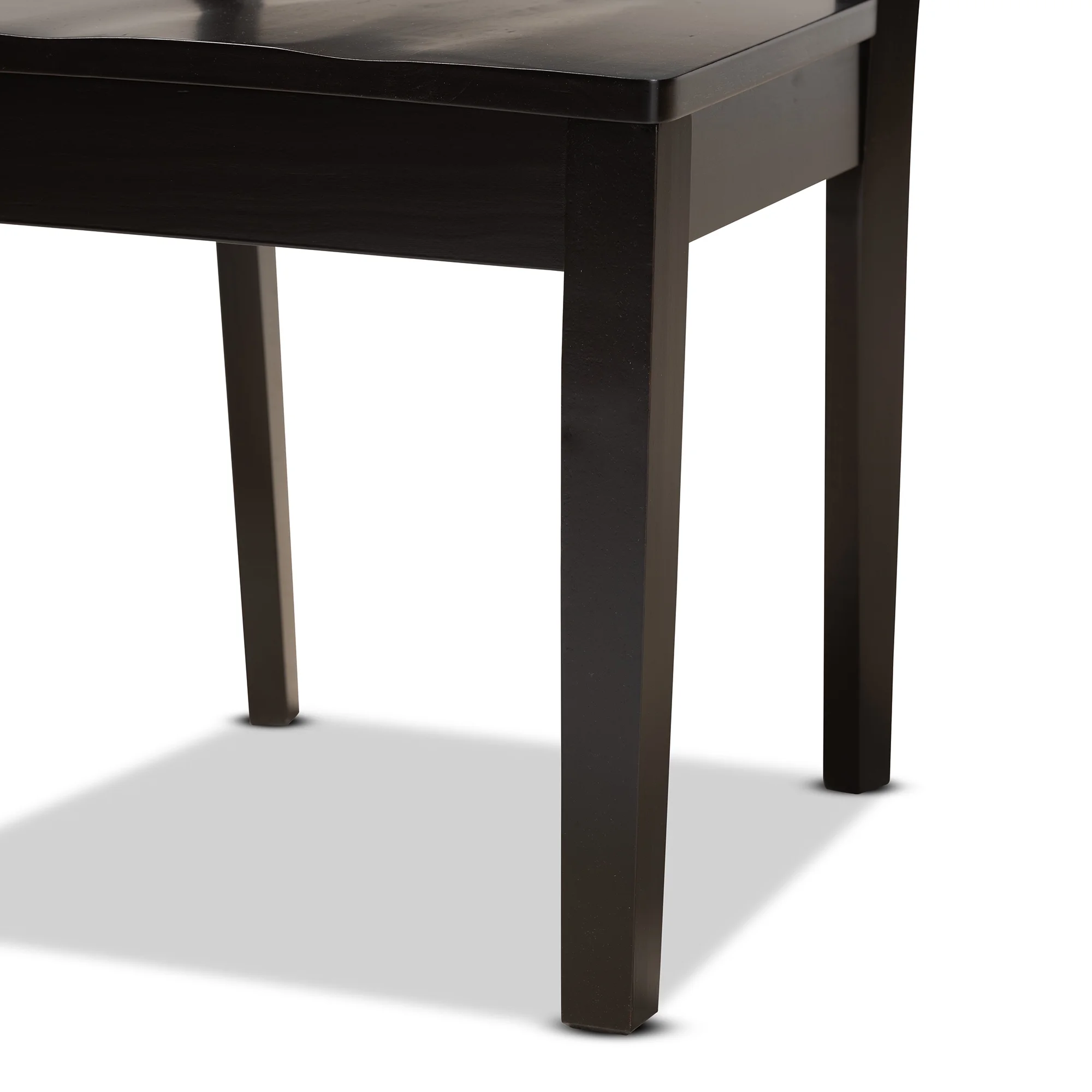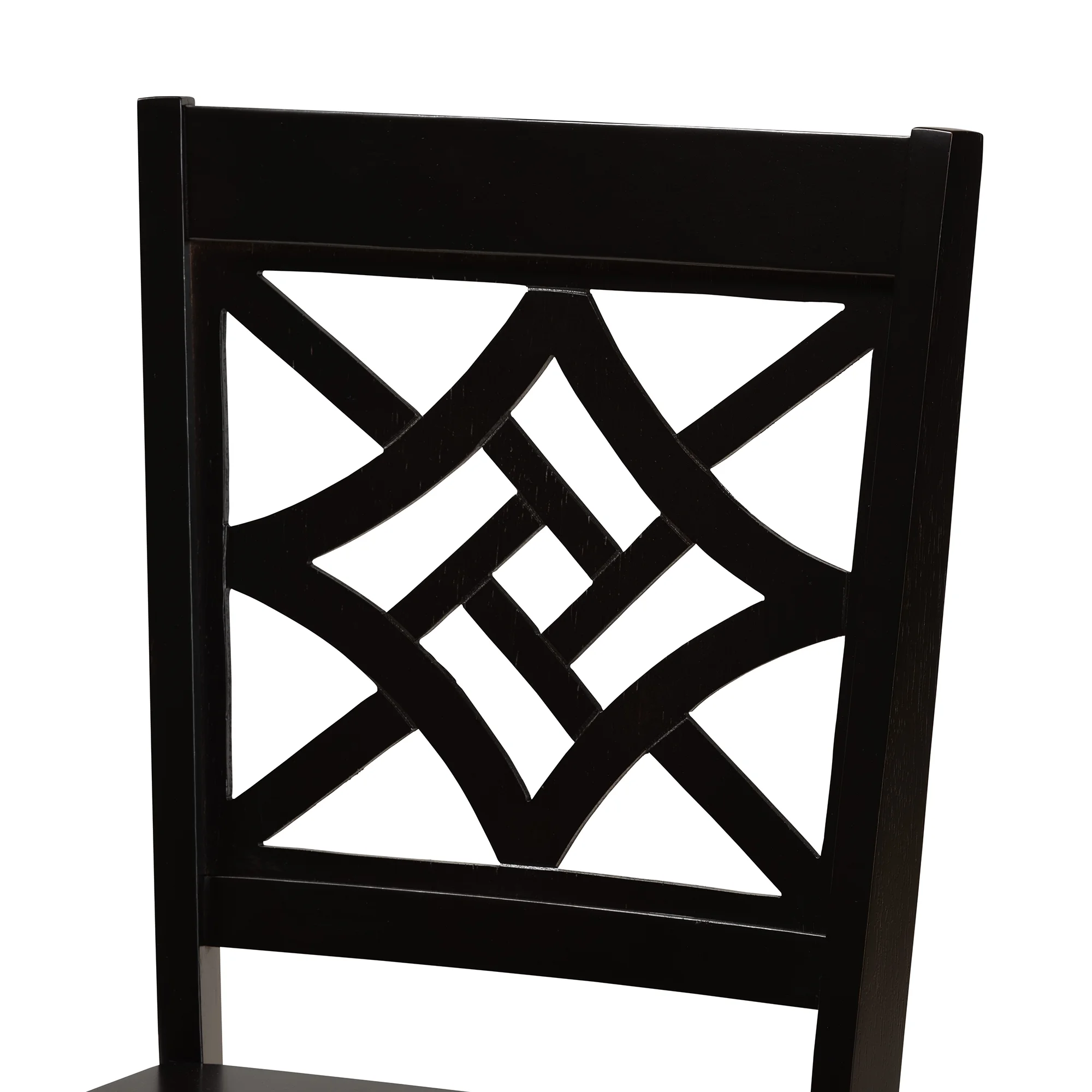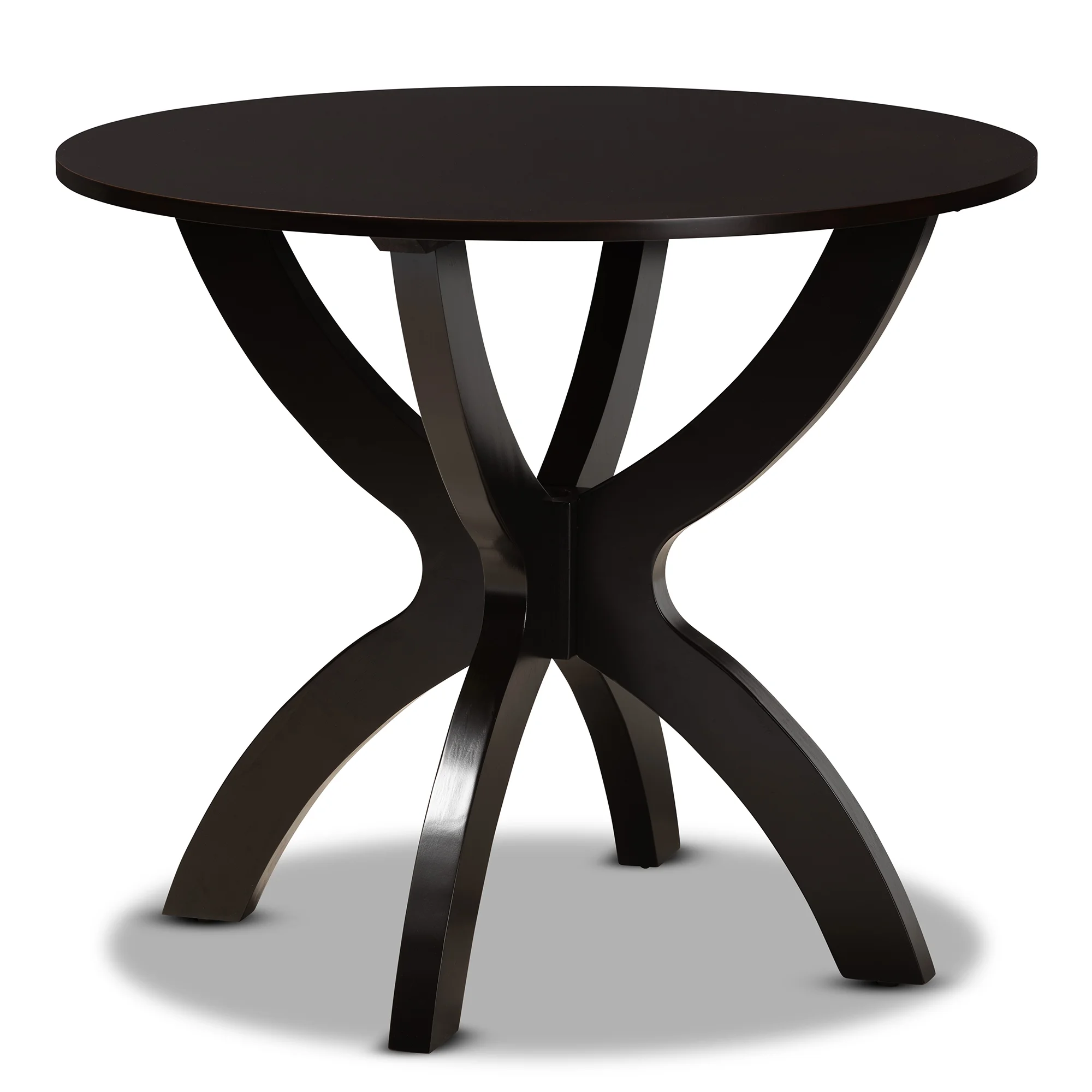 Add crisp, contemporary design to your dining space with the visually striking Anila dining set. Made in Malaysia, this wooden set includes four dining chairs and one dining table finished in a rich dark brown hue. Each chair is fitted with a smooth scoop seat for casual comfort and features a unique, geometric cut out design for enhanced visual appeal. Requiring assembly, the circular tabletop provides ample elbow room for each member of the table. Perfect for both casual and formal dining, the Anila dining set is an excellent addition to the modern home.