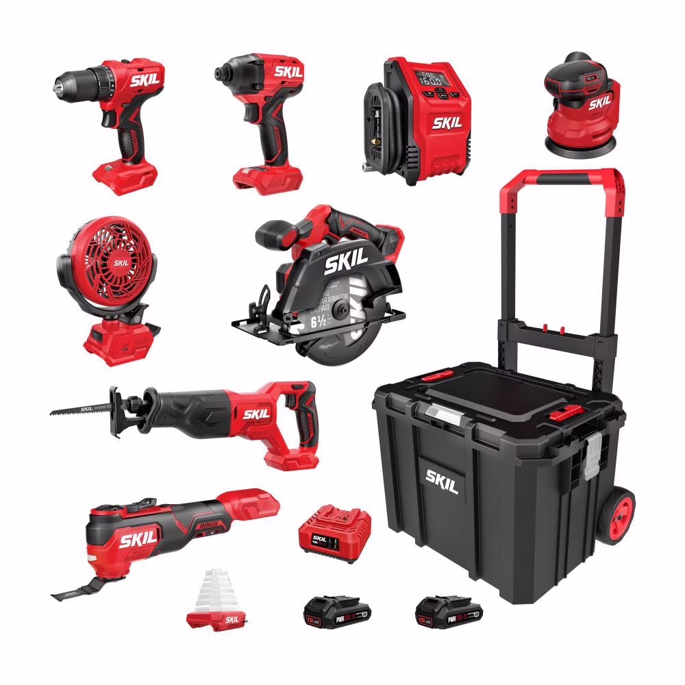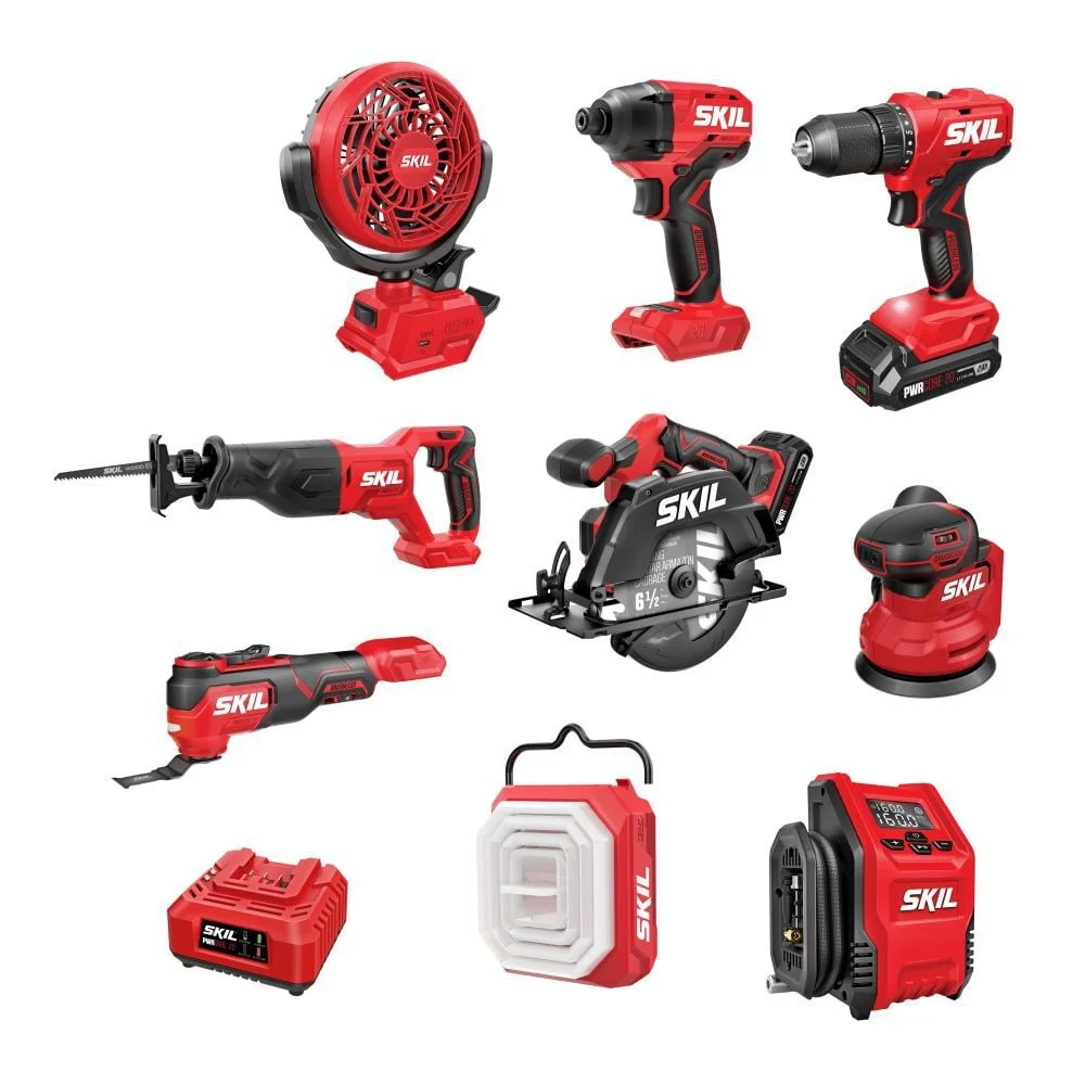- CORDLESS POWER TOOL COMBO KIT - Set includes the drill driver, impact driver, circular saw, recip saw, oscillating multi-tool, random orbital sander, inflator, clamp fan, collapsible lantern, 20V 2.0Ah battery, 20V charger, and accessories