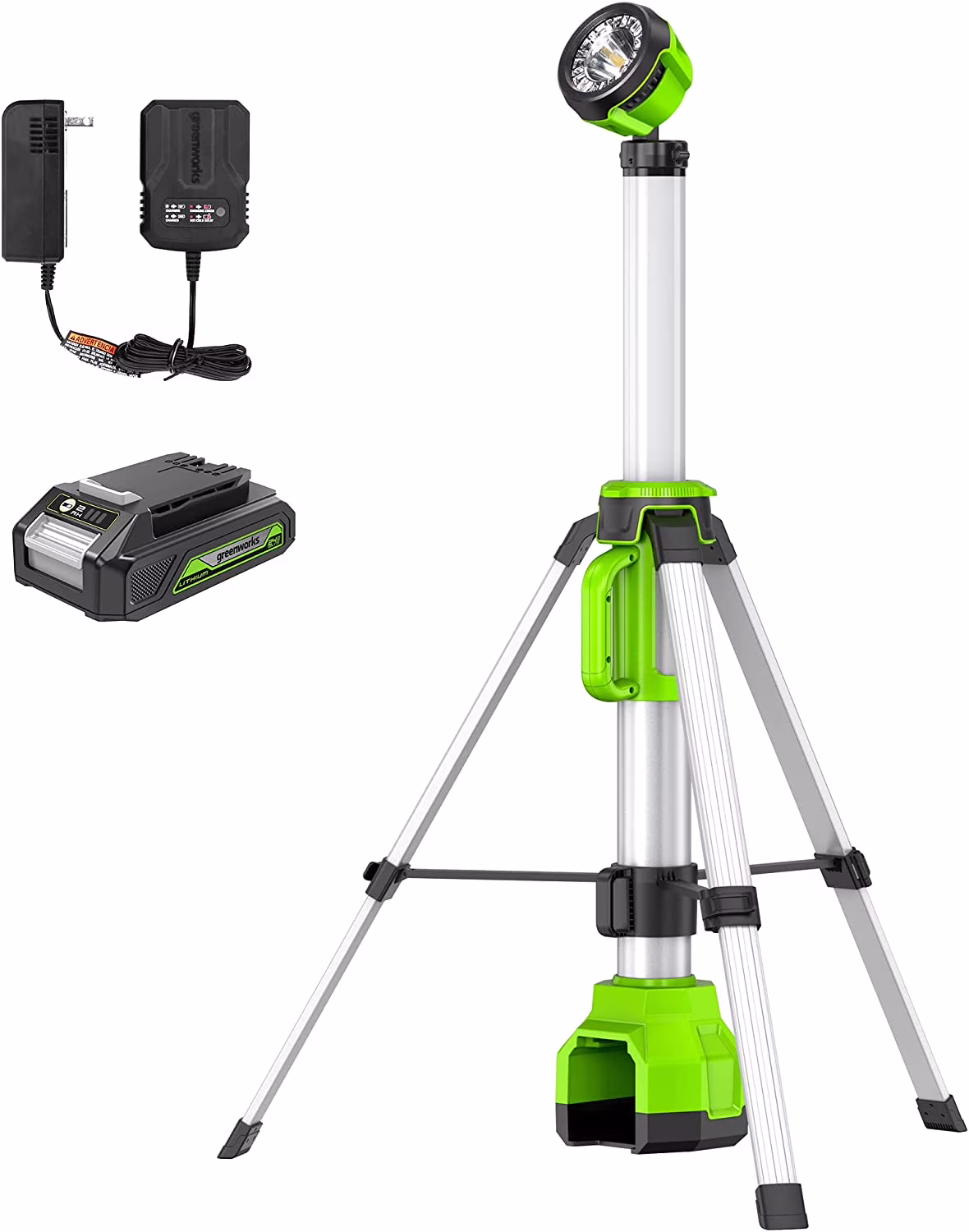 - Greenworks Adjustable LED Spotlight - The 500 Lumen LED Spotlight Head can be adjusted up to 90�� and rotated 260��