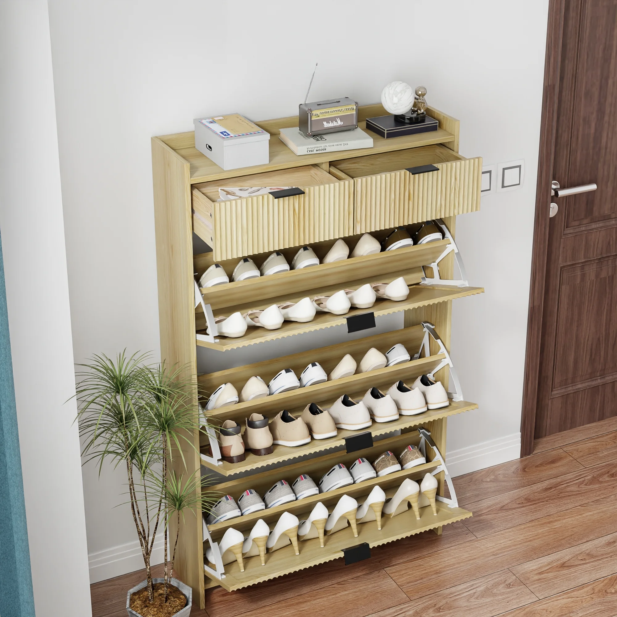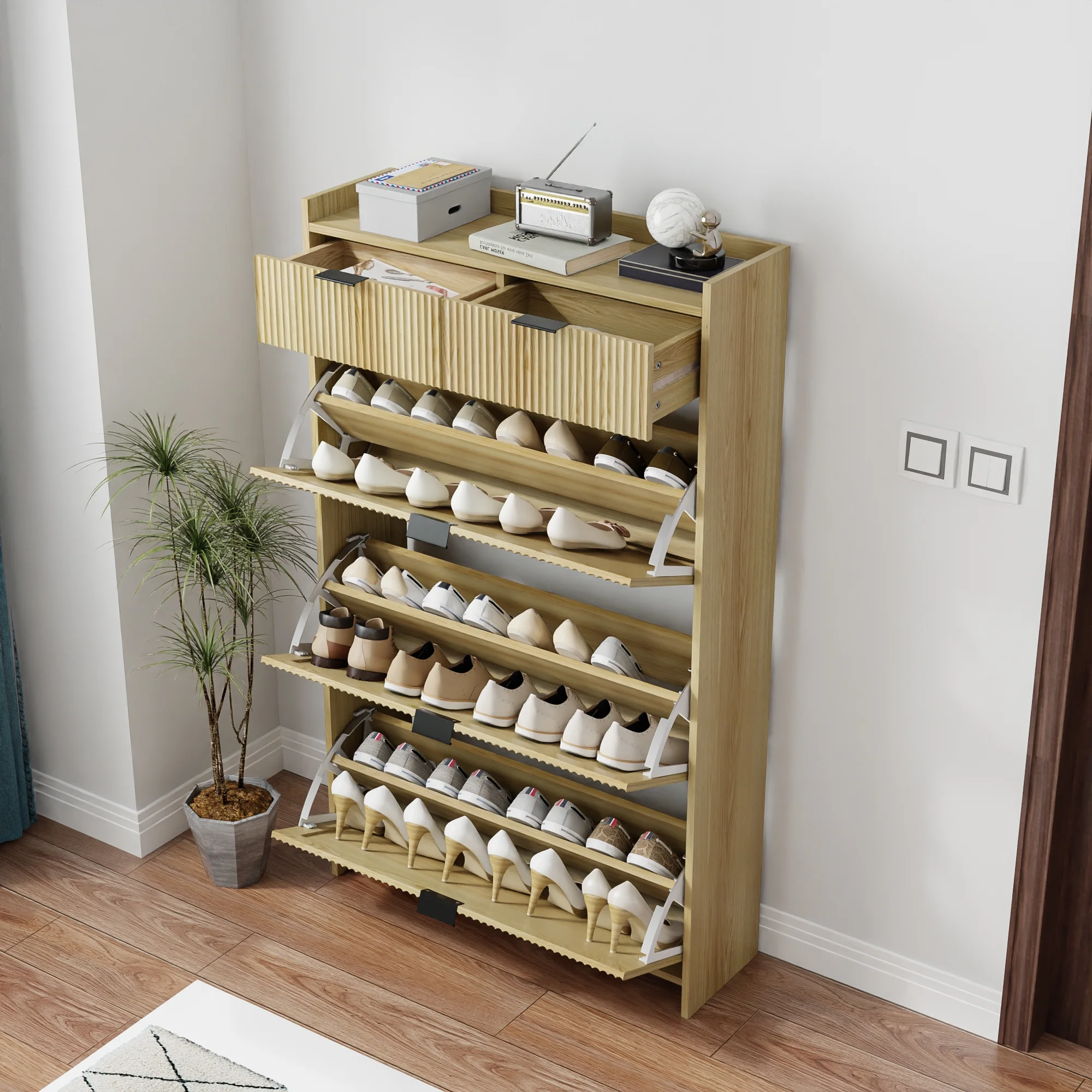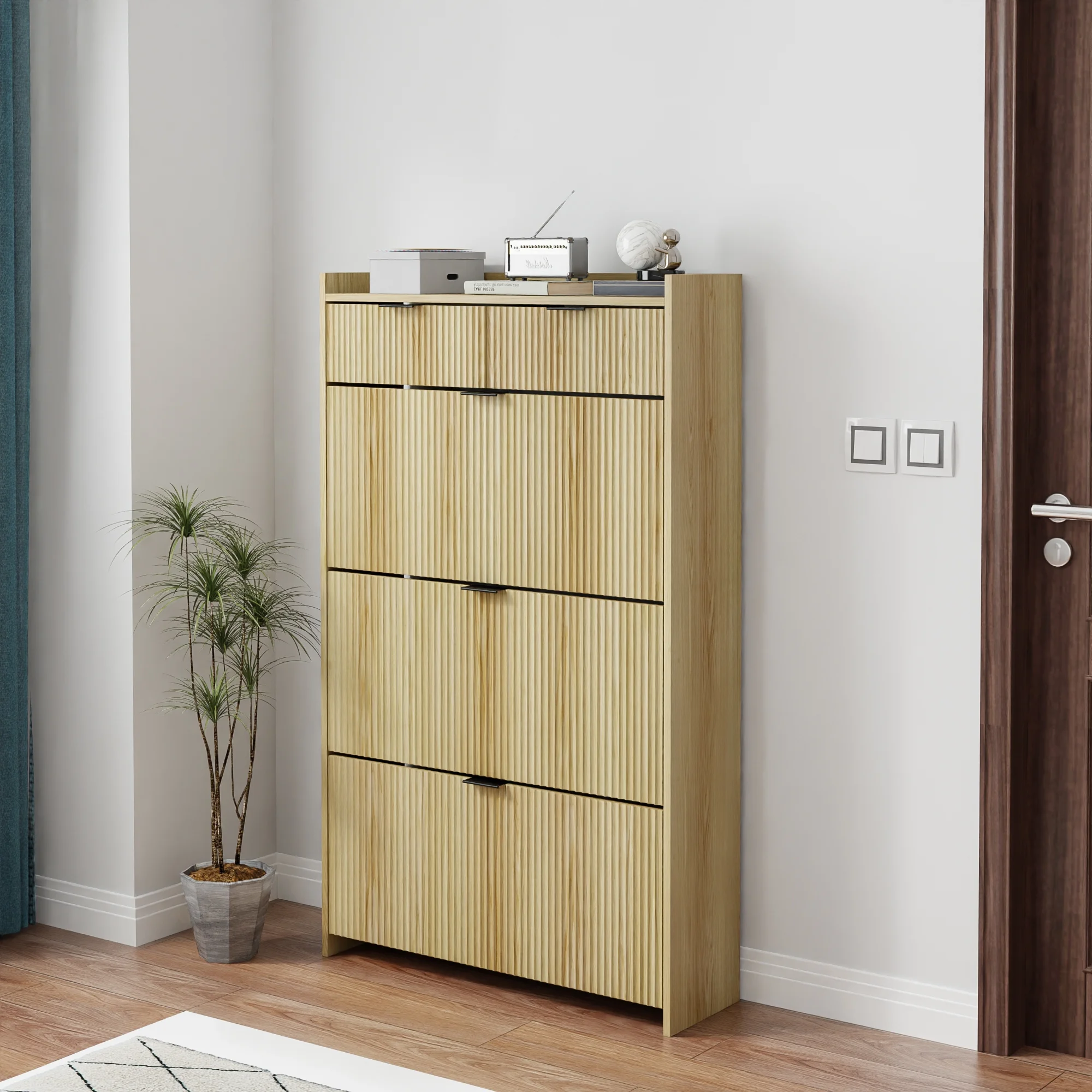 - [ Modern Style ] This shoe storage cabinet comes in natural classic colors, features a wave groove decorative surface, looks simple and stylish, brings elegant, cozy tones to your living area, and can be used as furniture and home decoration.