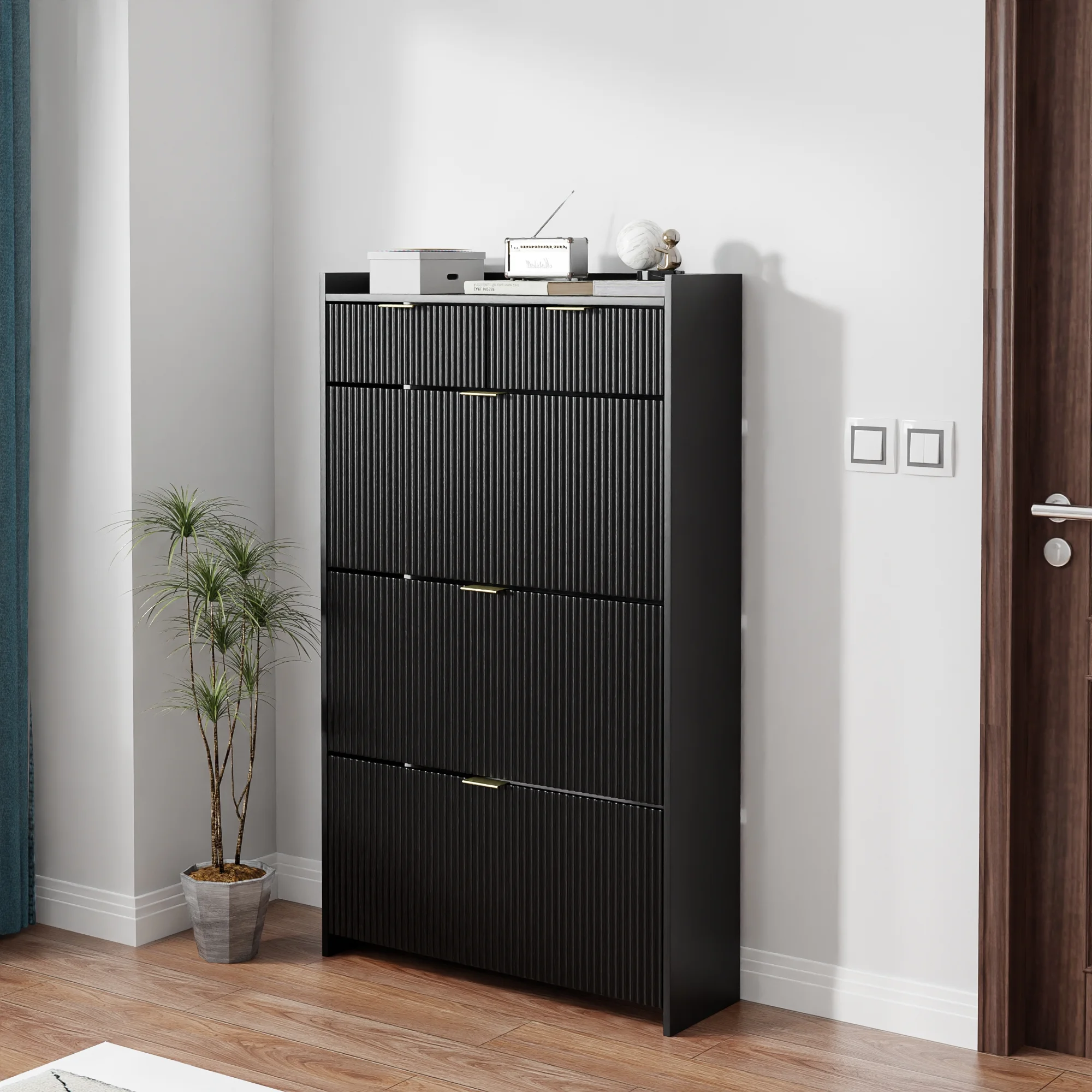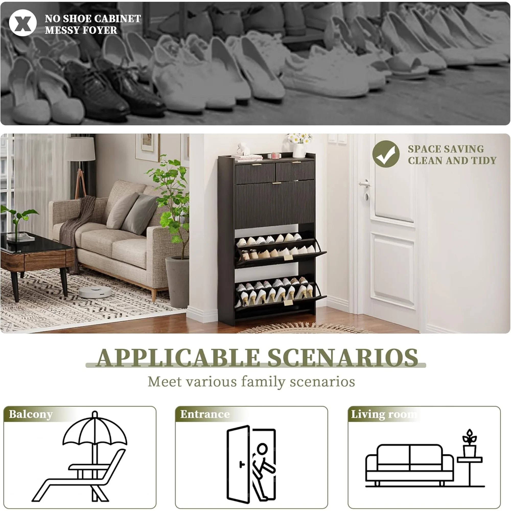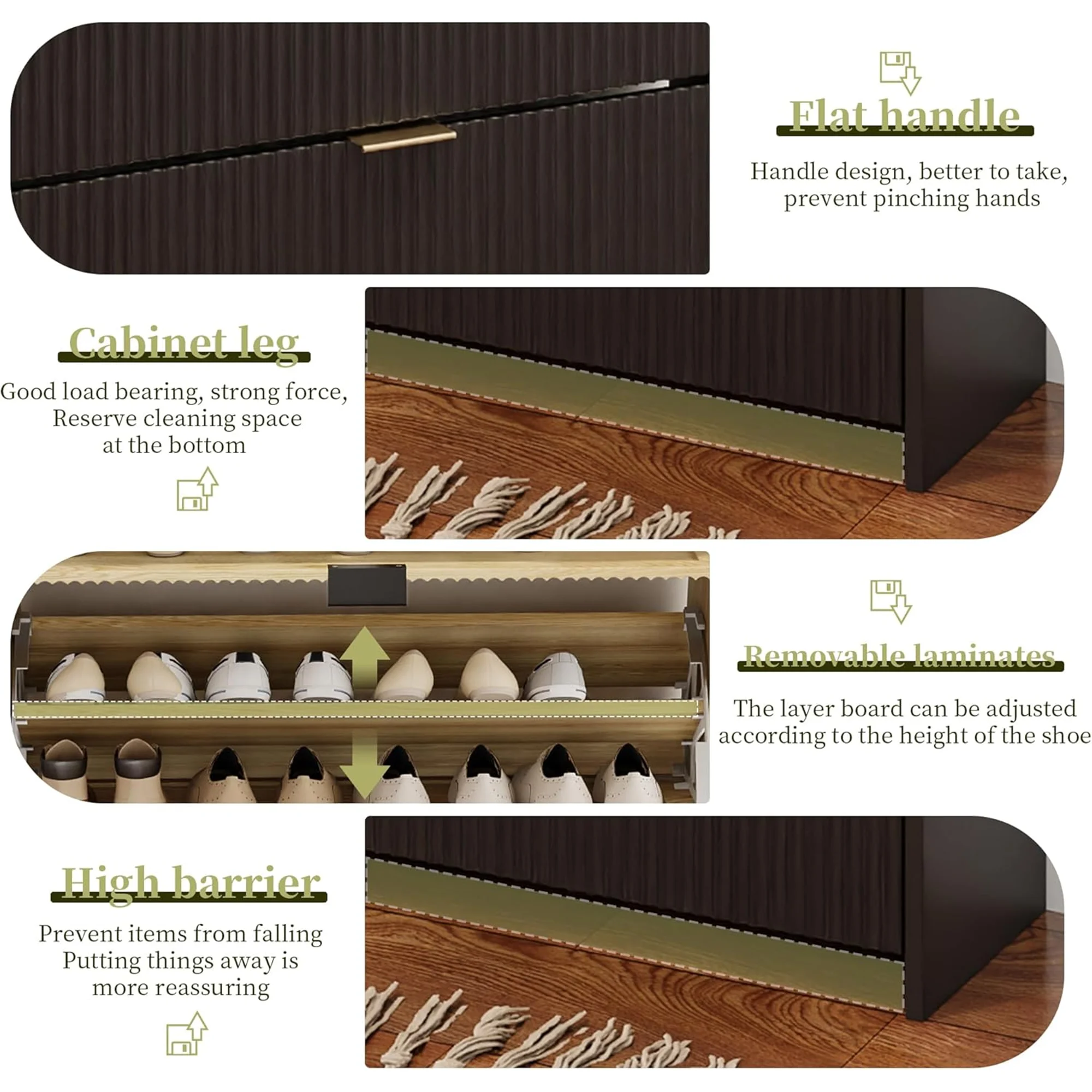 - [ Sturdy and Durable ] This shoe cabinet is made of sturdy and durable high-quality MDF wood, providing strong support and long life. There is an anti-tilt device on the top of the shoe cabinet to ensure safety during use.