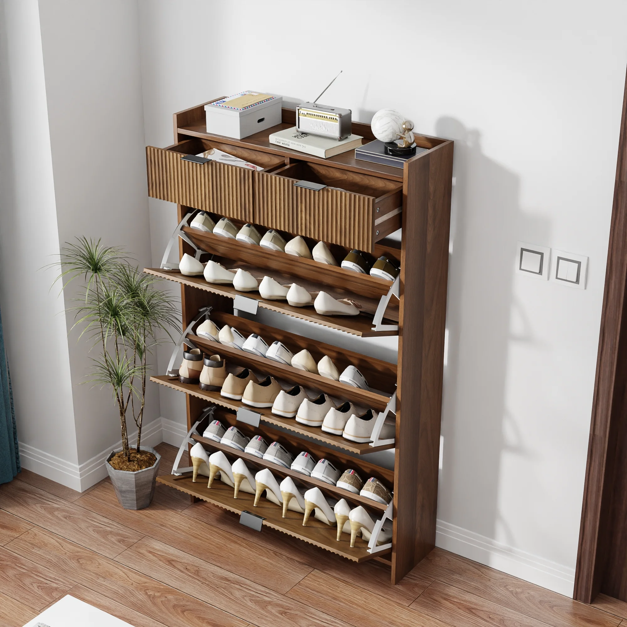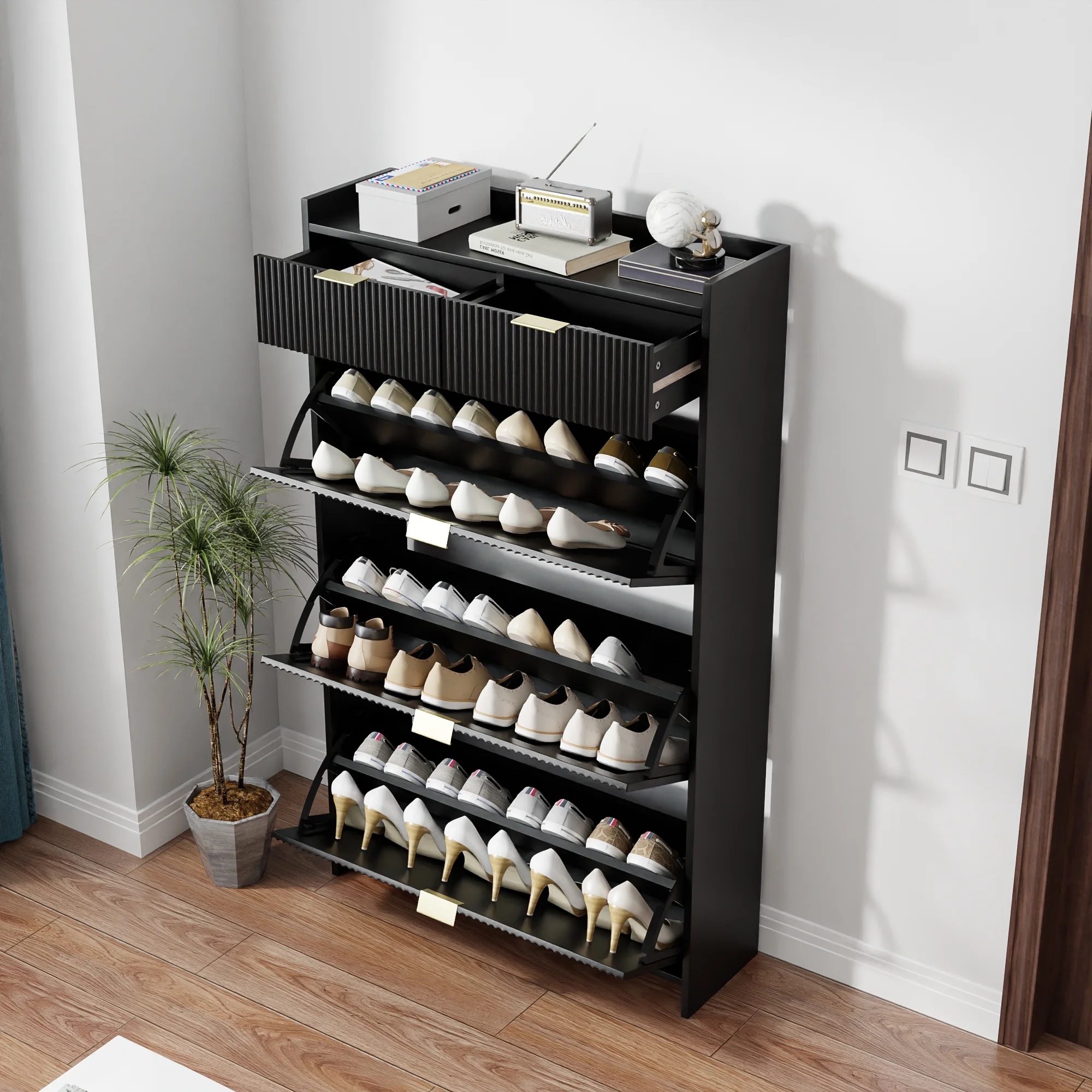 Ample storage space for your shoes, the Shoe Cabinet features 3 Flip Drawers, 2 Drawers, and desktop storage.