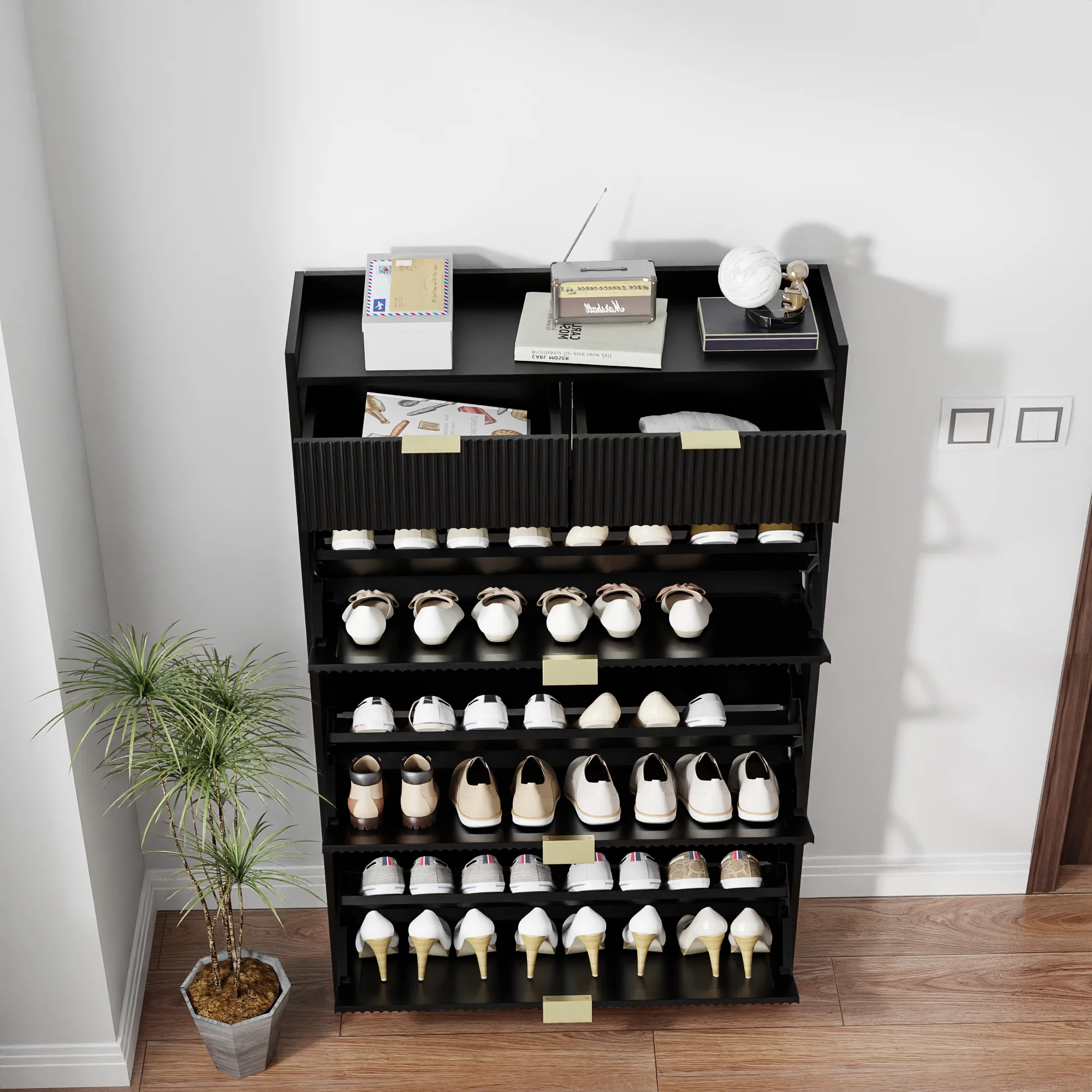 - [ Large Capacity Shoe Cabinet ] This shoe cabinet has 3 flip-top drawers, each with two levels. The center divider of each drawer can be adjusted or removed to accommodate different shoe sizes. Two drawers are at the top of the cabinet for added storage space. The spacious top surface is perfect for storing picture frames, keys, wallets, and other small items.
