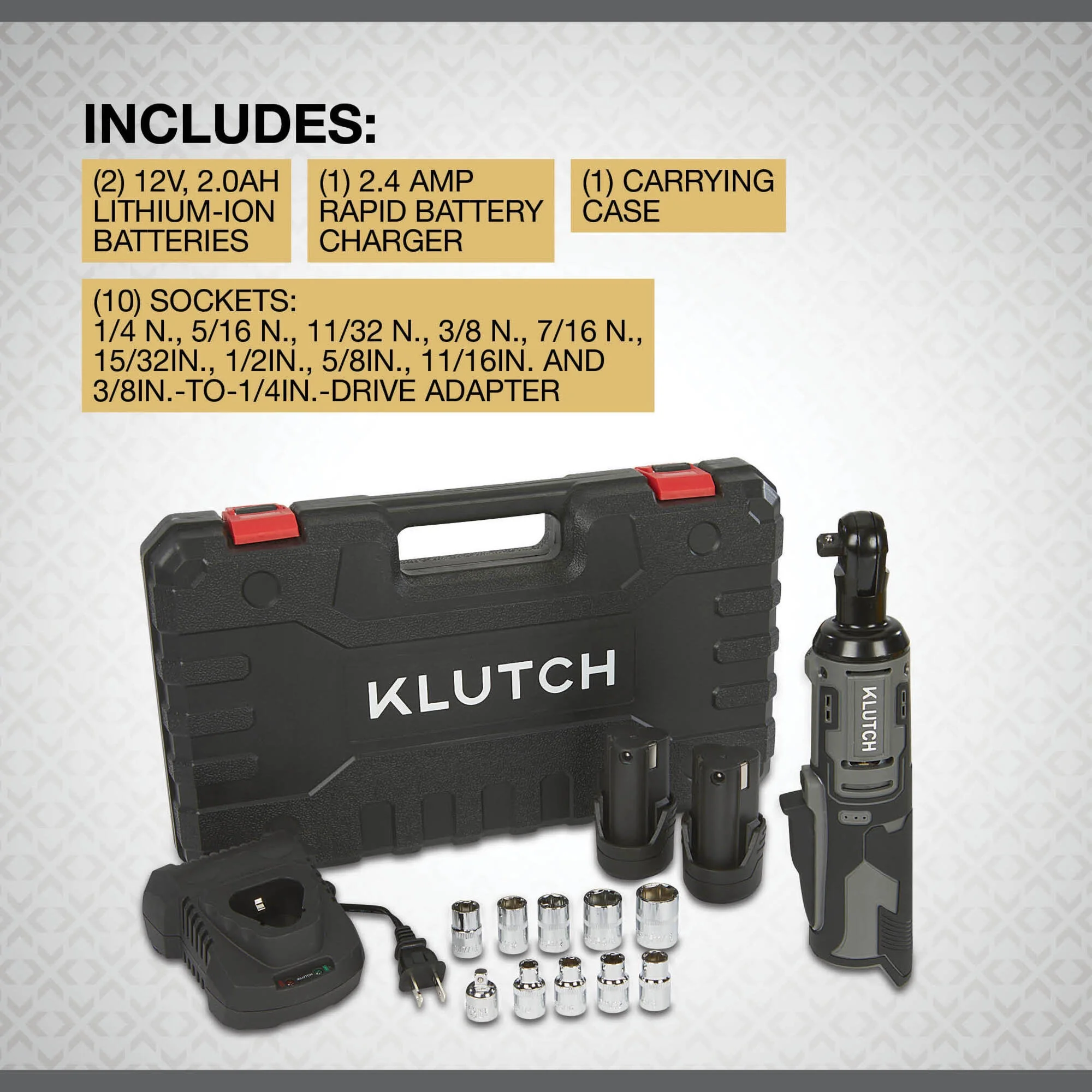 - Kit Includes: Two 12V, 2.0Ah Lithium-ion batteries, 2.4 Amp rapid battery charger, carrying case and (10) sockets: 1/4in., 5/16in., 11/32in., 3/8in., 7/16in., 15/32in., 1/2in., 5/8in., 11/16in., 3/8in.-to-1/4in.-drive adapter
